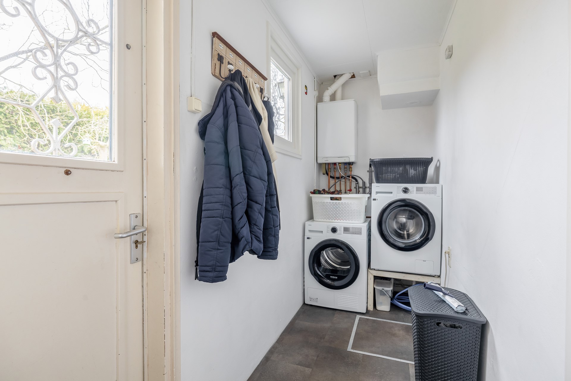 Via de keuken komt u inpandig bij de bijkeuken, hier is de HR Cv-ketel geïnstalleerd en vind u tevens de wasmachine en droger opstelling. Hier bevind zich ook de buitendeur naar het zij-terras en de achtertuin. In het kruipluik is het expansievat geplaatst van de Cv-ketel.