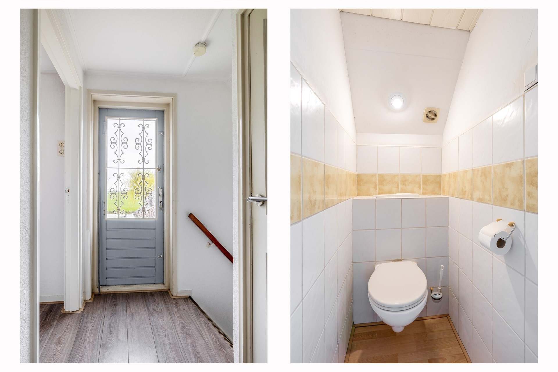Via de overloop is de 2e half-betegelde toiletruimte te betreden, die is voorzien van een hangcloset en mechanische afzuiging.