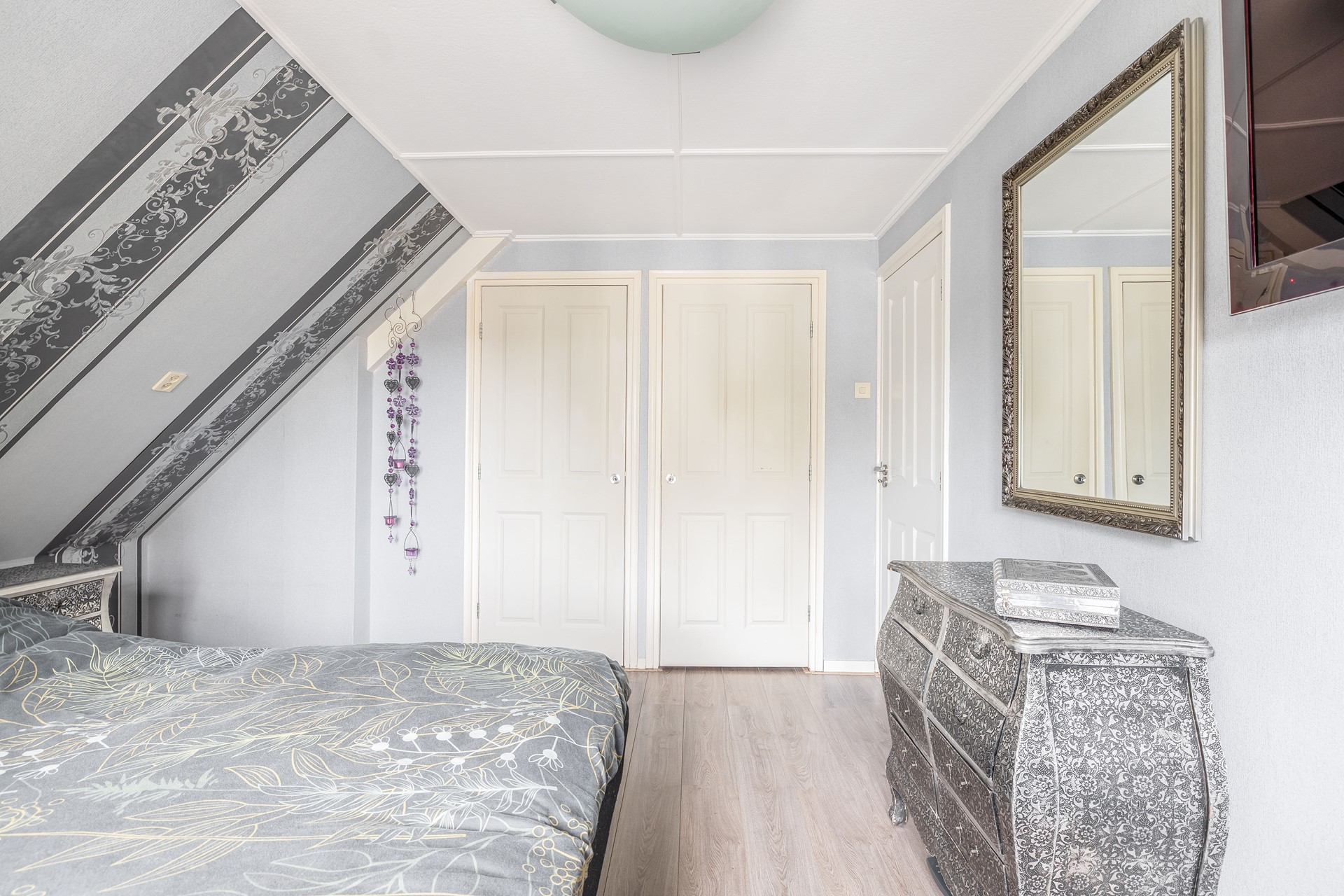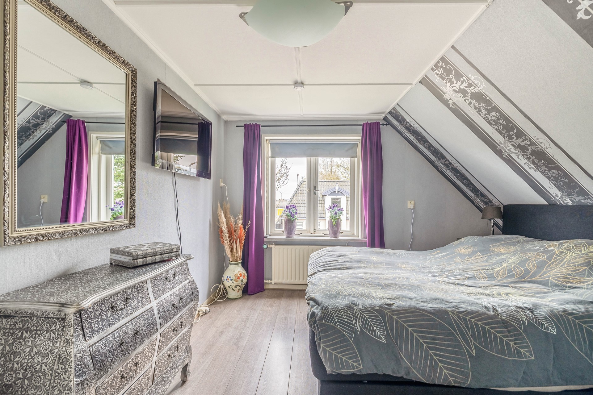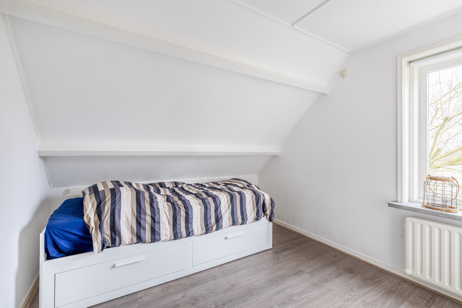 Aan de achterzijde van de woning bevinden zich 2 slaapkamers, waarvan 1 met een dakkapel en de andere is voorzien van een luik in het plafond waar de vlizotrap naar de bergzolder achter zit.