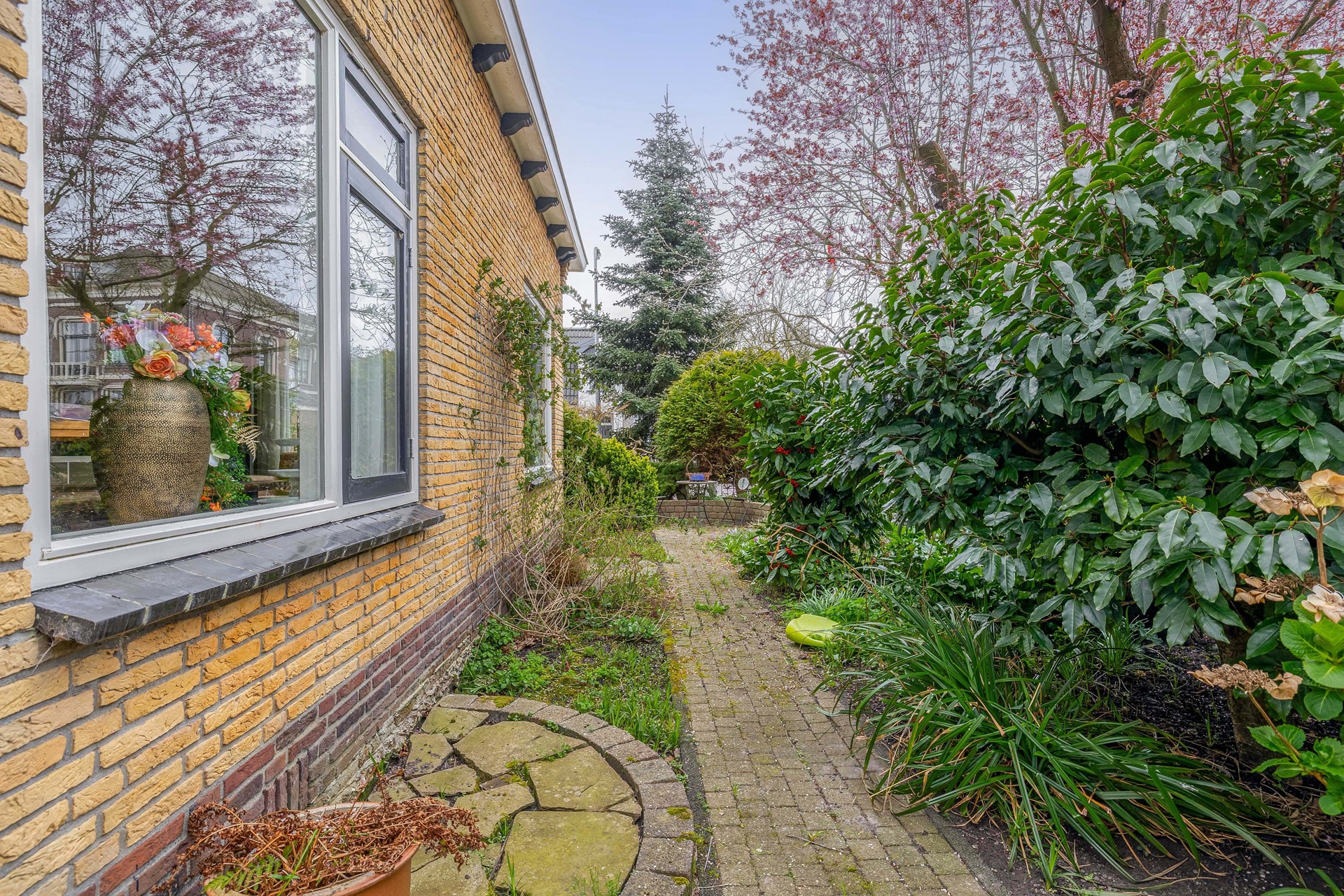 Het achterom aan de rechterzijde van de woning betreft een breed pad, u kunt daardoor met de auto ook in de 2e garage parkeren.