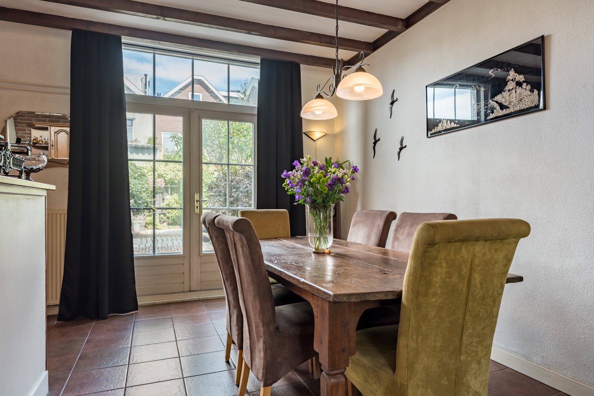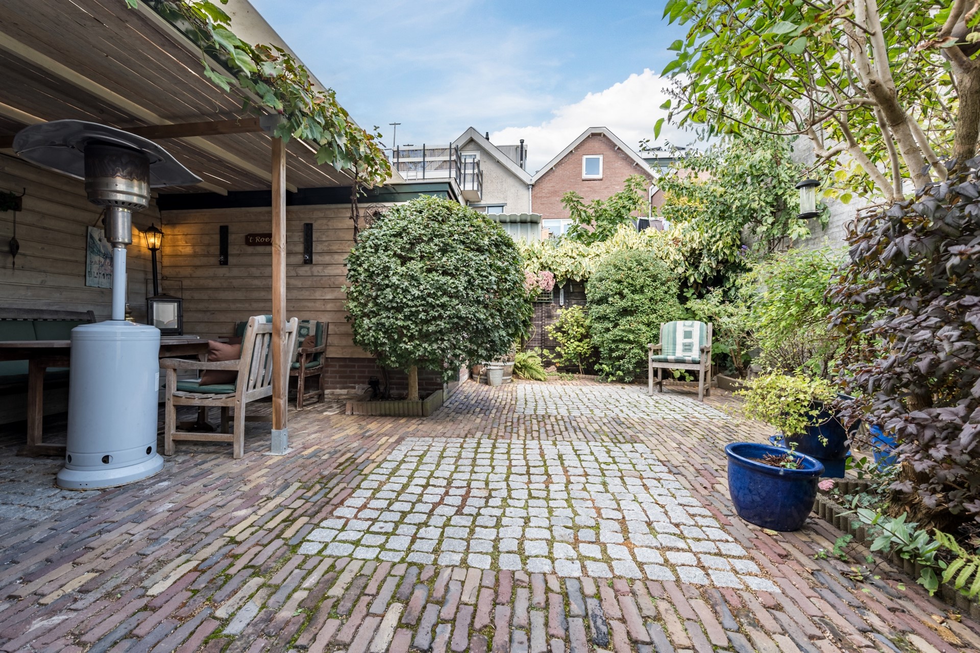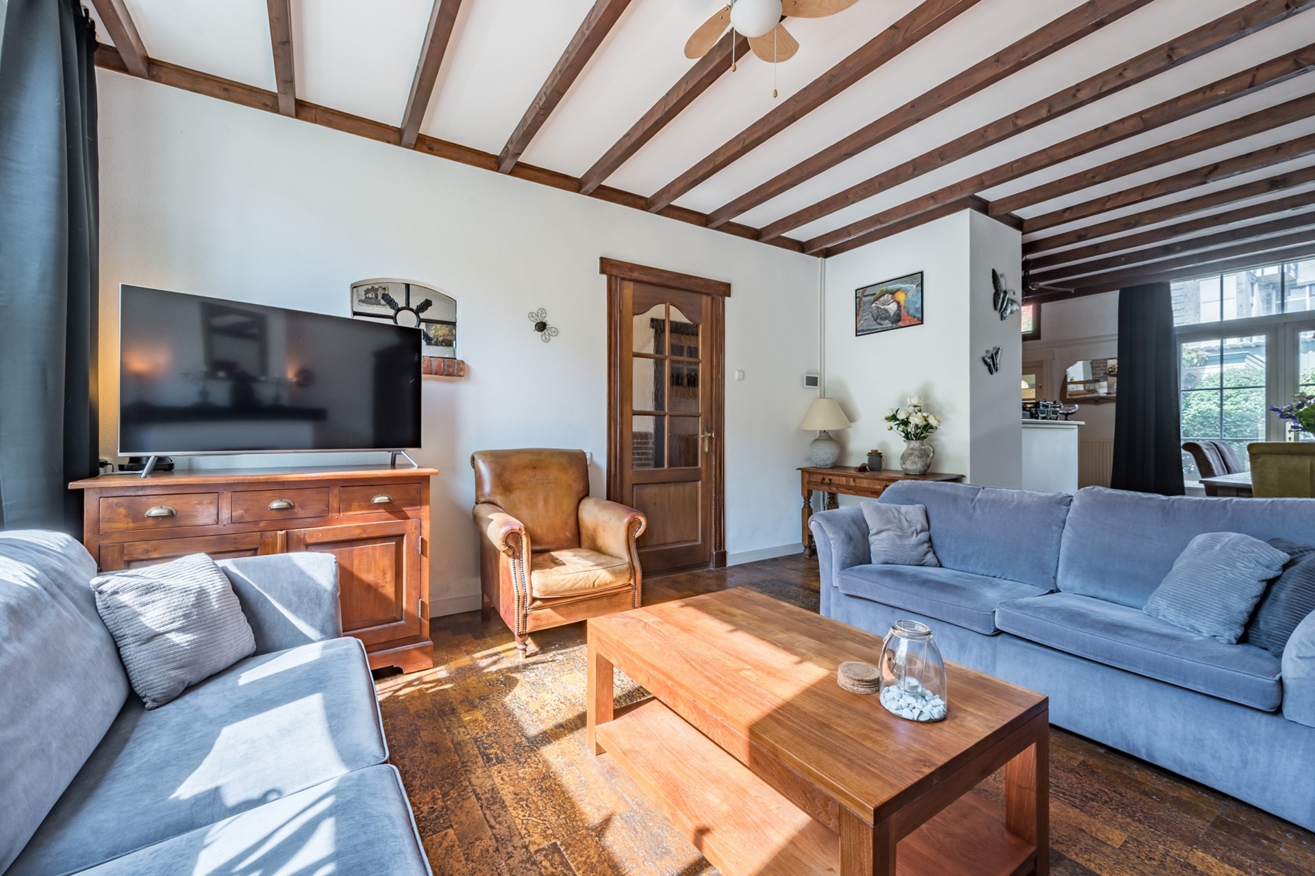 De woonkamer met sfeervolle balken en gashaard geeft een gevoel van thuiskomen, en de openslaande deuren leiden naar een verzorgde achtertuin met overkapping. De woning biedt lichte, ruime vertrekken en een praktische indeling met een grote keuken, bijkeuken, drie slaapkamers en een fijne badkamer. Gelegen in een rustige straat, maar toch dichtbij station en centrum – hier combineer je rust en gemak moeiteloos.