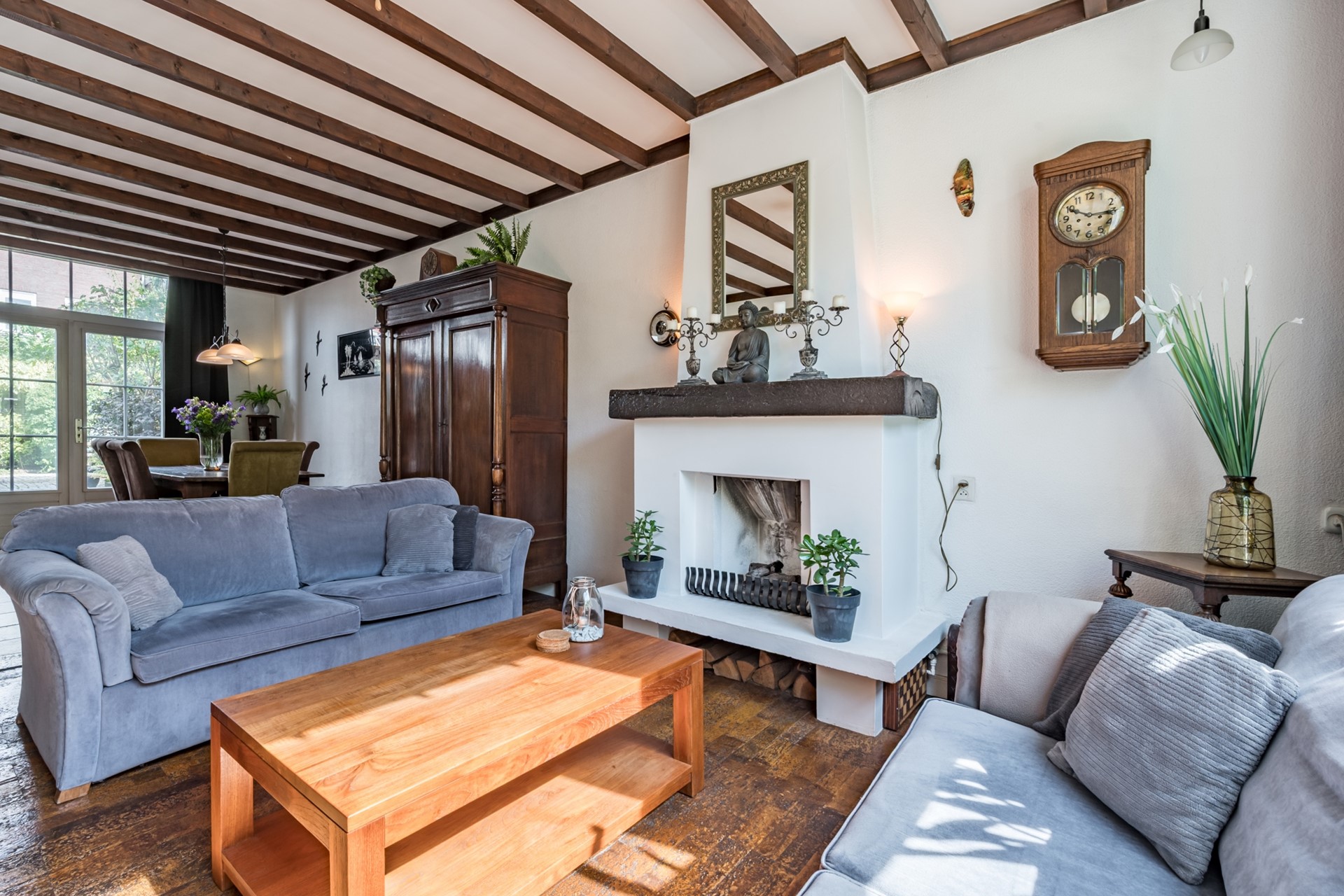 - Sfeervolle woonkamer met karakteristieke balken, een knusse gashaard met schouw en openslaande deuren naar de tuin