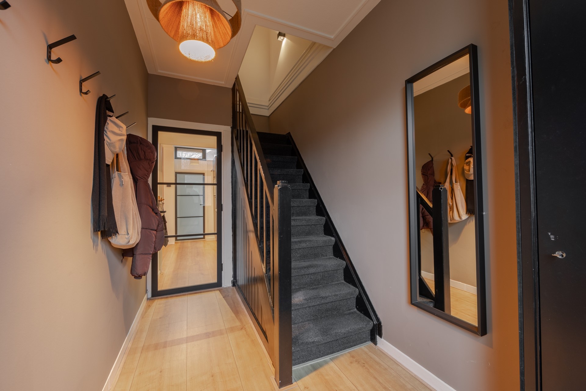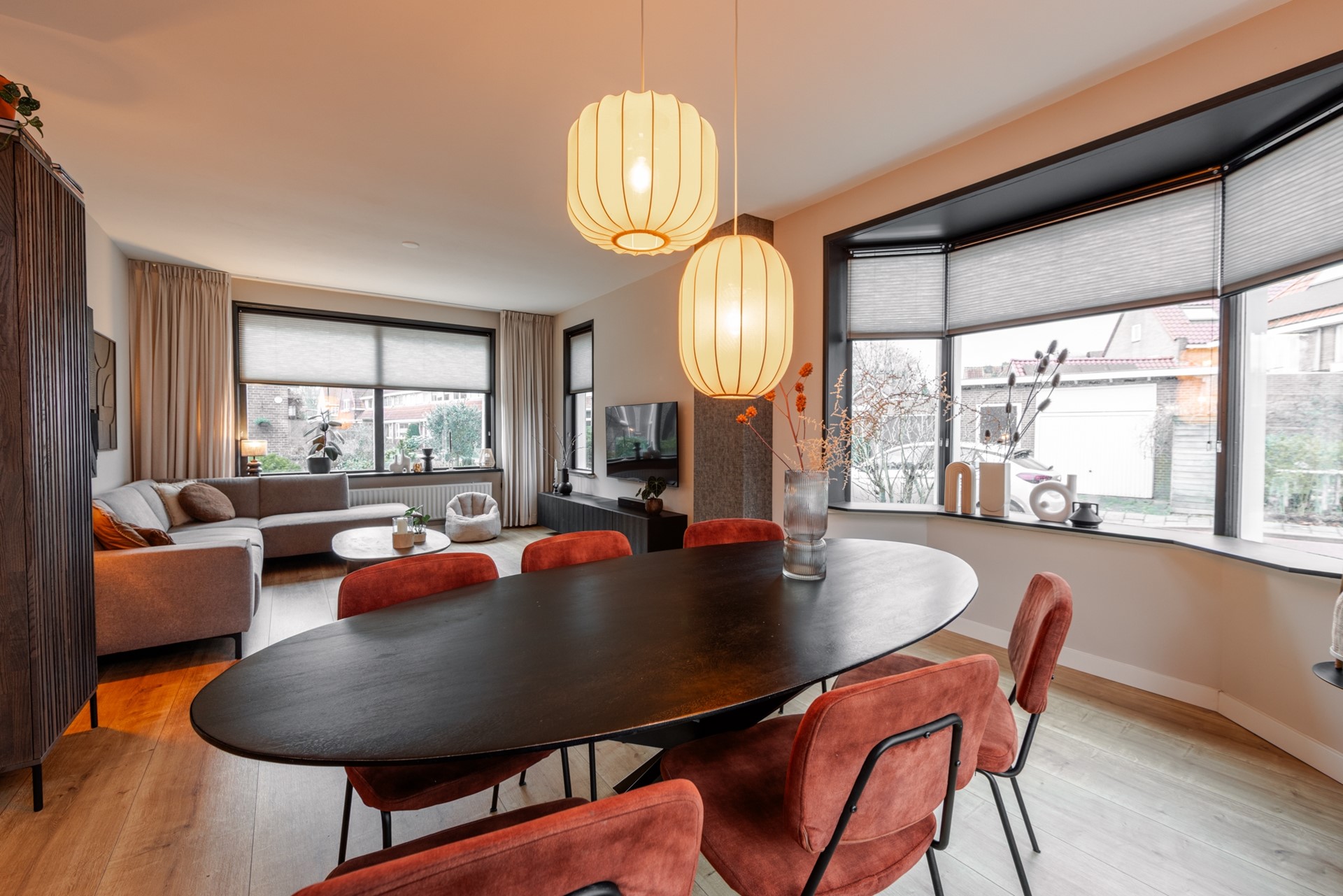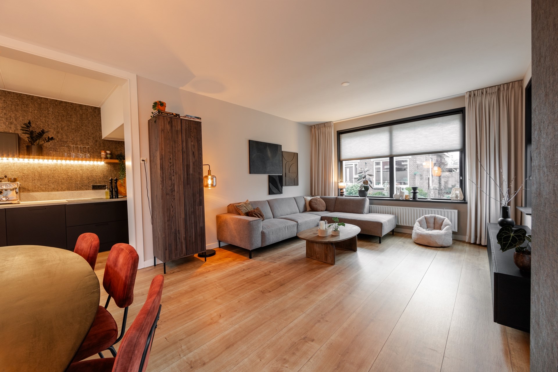 Via de hal kom je in de vernieuwde, moderne halfopen keuken met inbouwapparatuur. Doordat de muur is doorgebroken, heb je een ruimtelijk effect. De gezellige doorzonwoonkamer is lekker licht, mede door de erker aan de zijkant. De glas-in-loodramen horen helemaal bij de jaren 30-stijl. De aanbouw is van 2022, met de bijkeuken en een vernieuwd toilet.