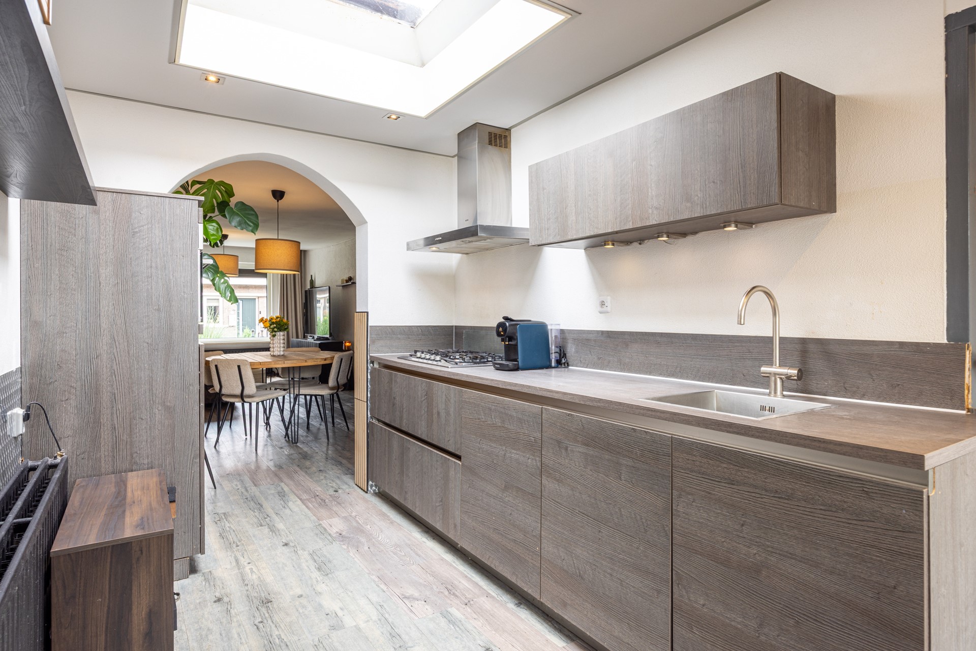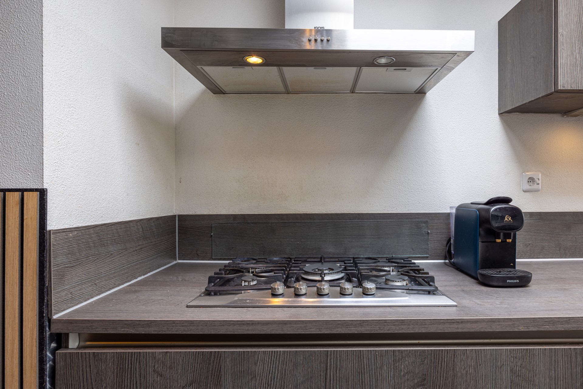 De open keuken is modern uitgevoerd met een laminaatvloer en voorzien van diverse inbouwapparatuur: een vaatwasser, een heteluchtoven, een gaskookplaat met afzuigkap en een koelkast. Hier kun je met gemak een heerlijke maaltijd bereiden. De keuken biedt tevens toegang tot de achtertuin.