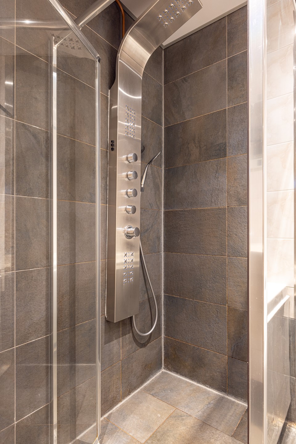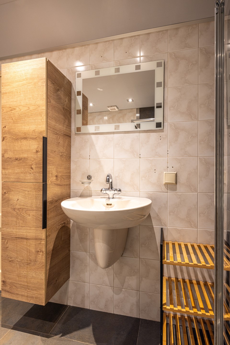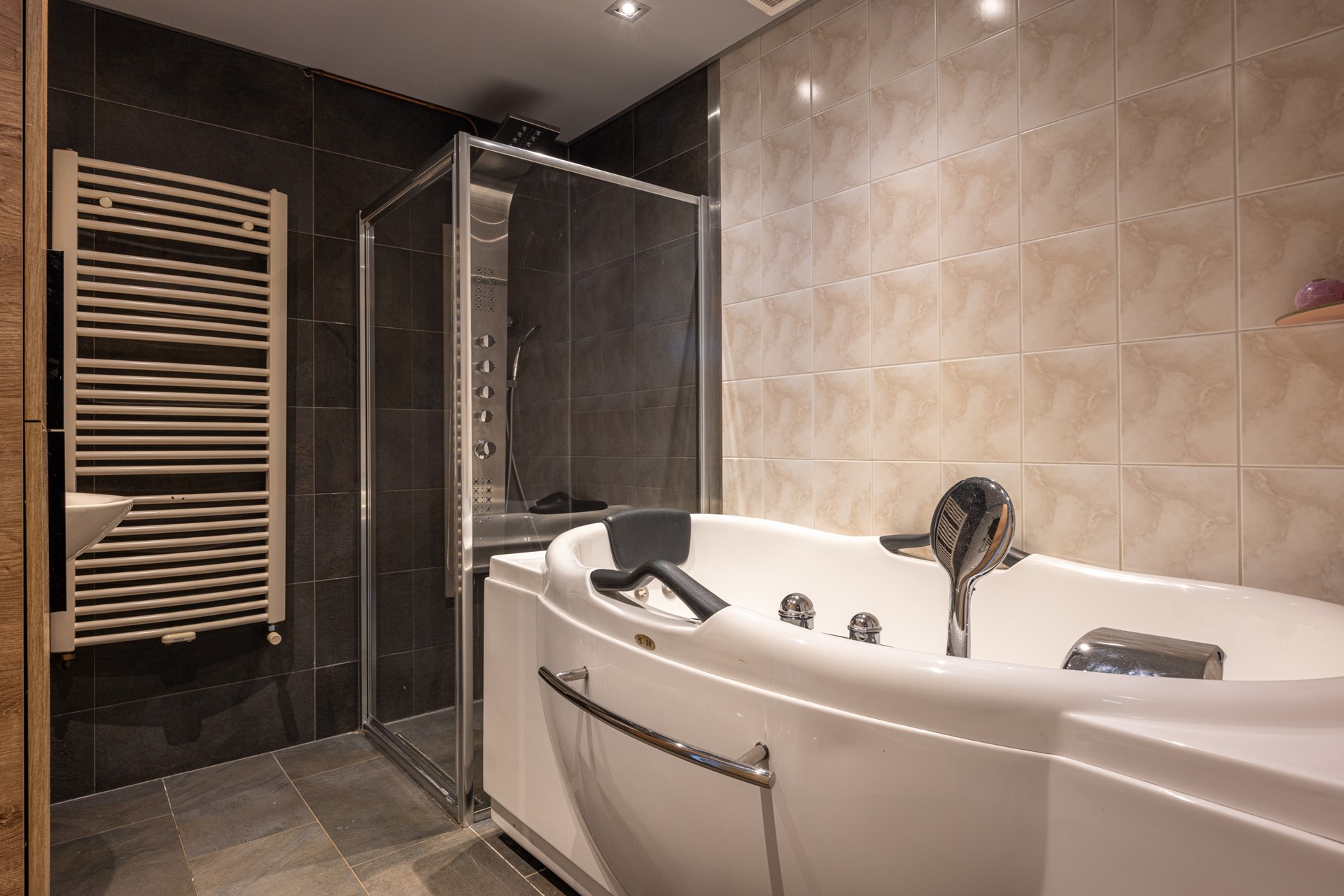 Achter de keuken bevindt zich de badkamer. Deze is verrassend compleet ingericht met een douche, een whirlpoolbad, wastafel en extra kastruimte. Ook is hier de witgoedaansluiting netjes weggewerkt in een aparte wasruimte.