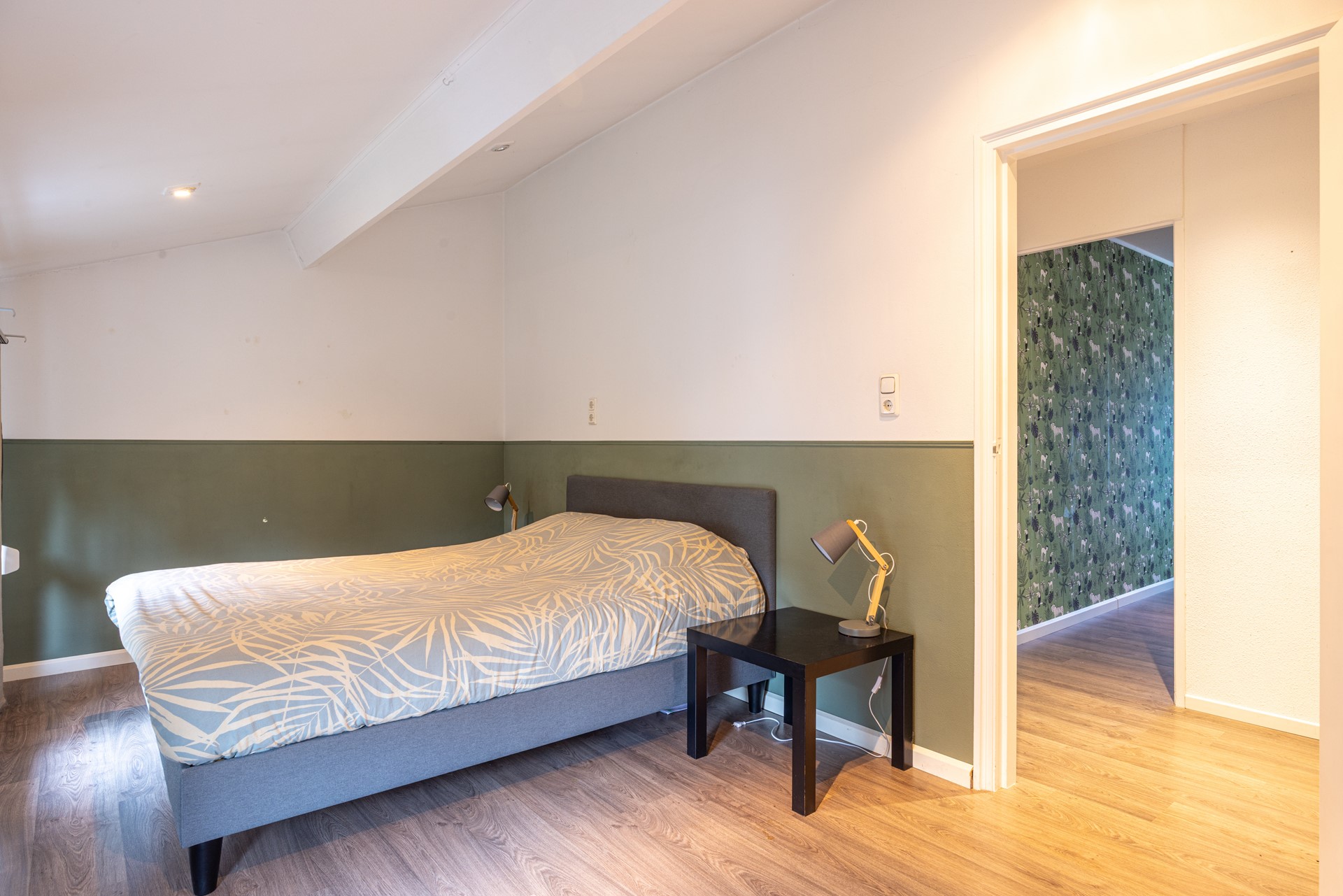 De eerste verdieping bereik je via een houten trap met vloerbedekking, Op de overloop ligt een laminaatvloer die netjes is doorgelegd in alle kamers, wat het geheel een rustige en verzorgde uitstraling geeft.