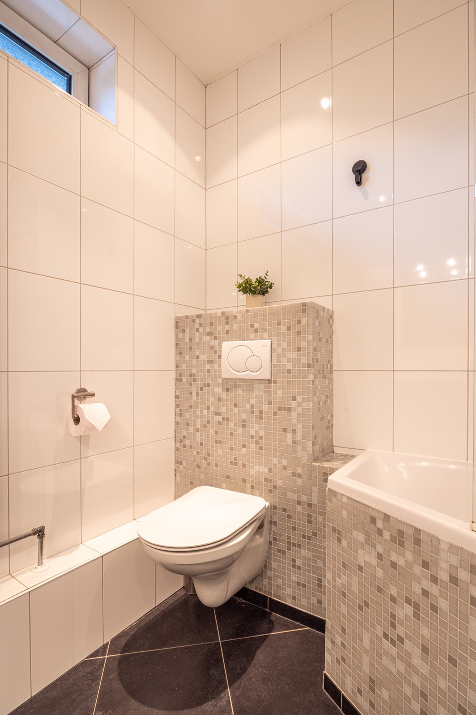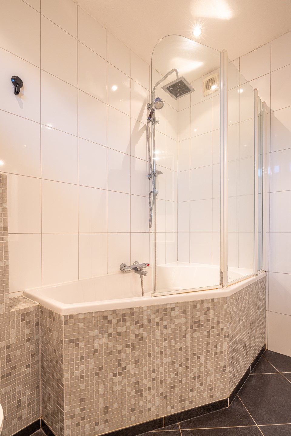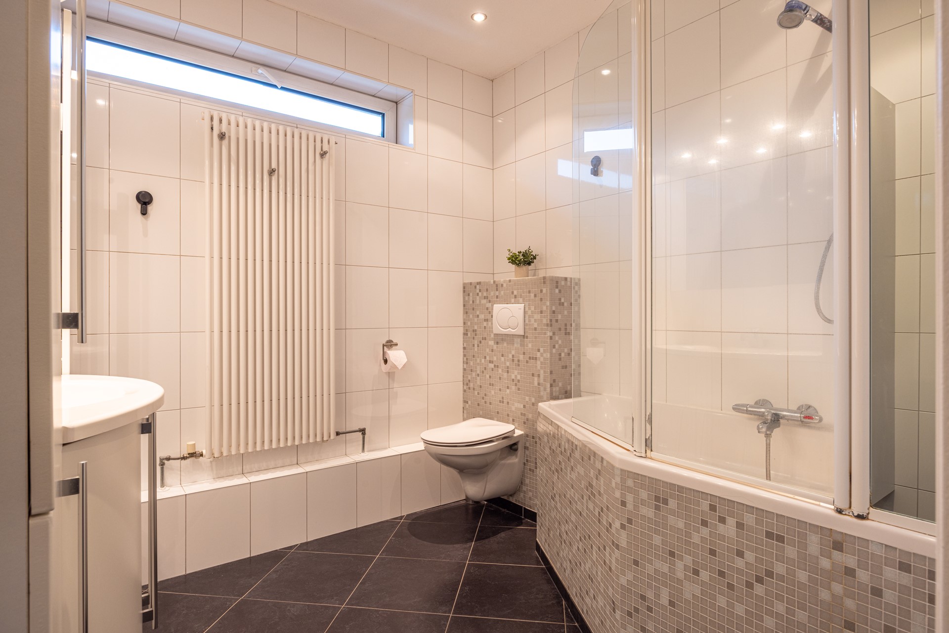 De badkamer is netjes en verzorgd afgewerkt met lichte wand- en vloertegels en een kunststof kozijn met HR-glas, wat zorgt voor een frisse en onderhoudsvriendelijke ruimte. Er is een zitbad met geïntegreerde douche, perfect voor wie graag de keuze heeft tussen snel douchen of ontspannen baden. Daarnaast vind je er een zwevend badkamermeubel met wastafel, een spiegel met verlichting en een designradiator die zorgt voor extra comfort op koelere dagen. Alles bij elkaar is het een praktische en verzorgde badkamer waar je alles bij de hand hebt.