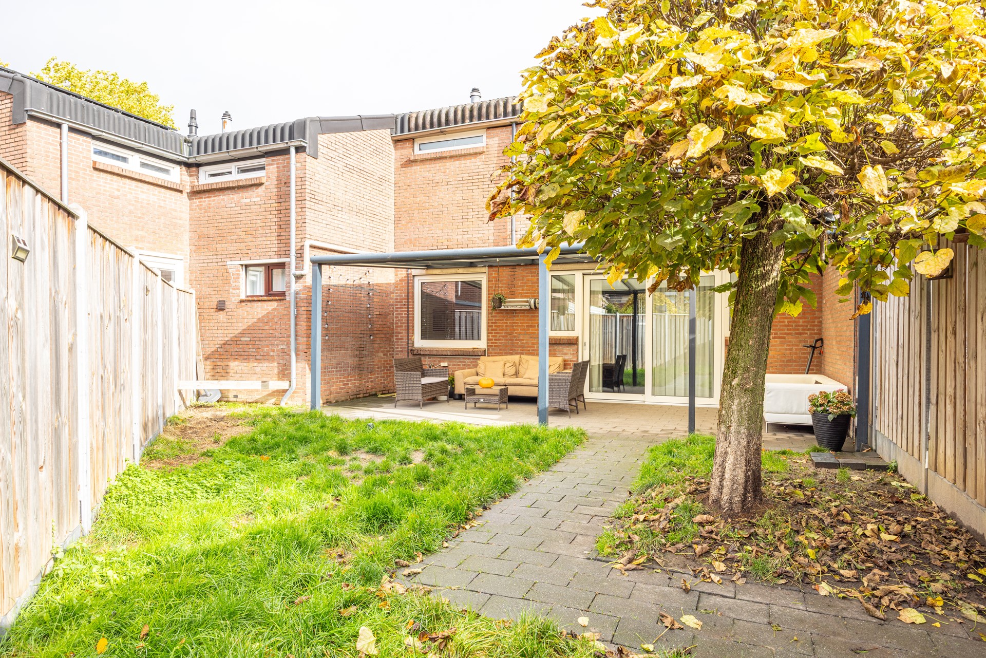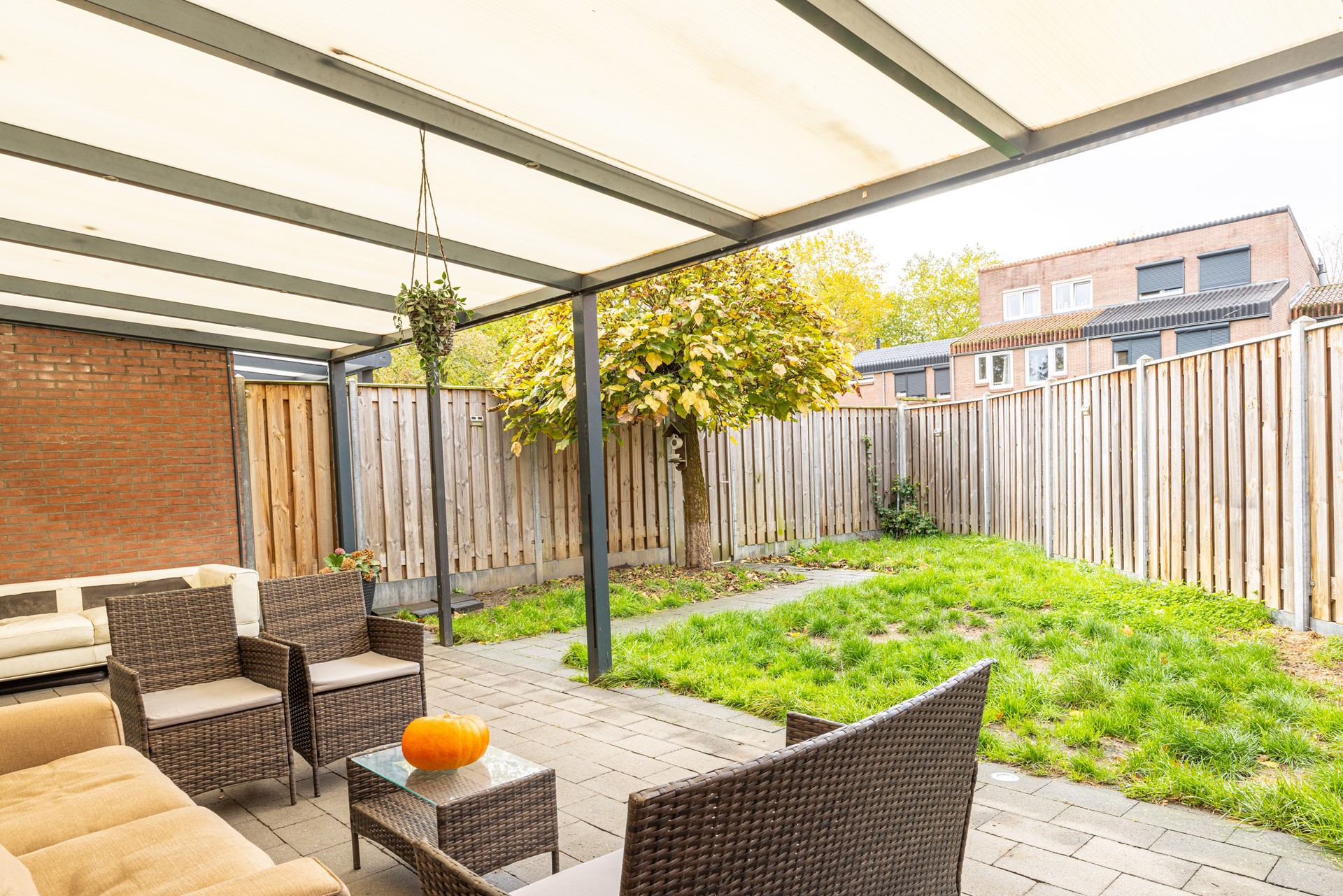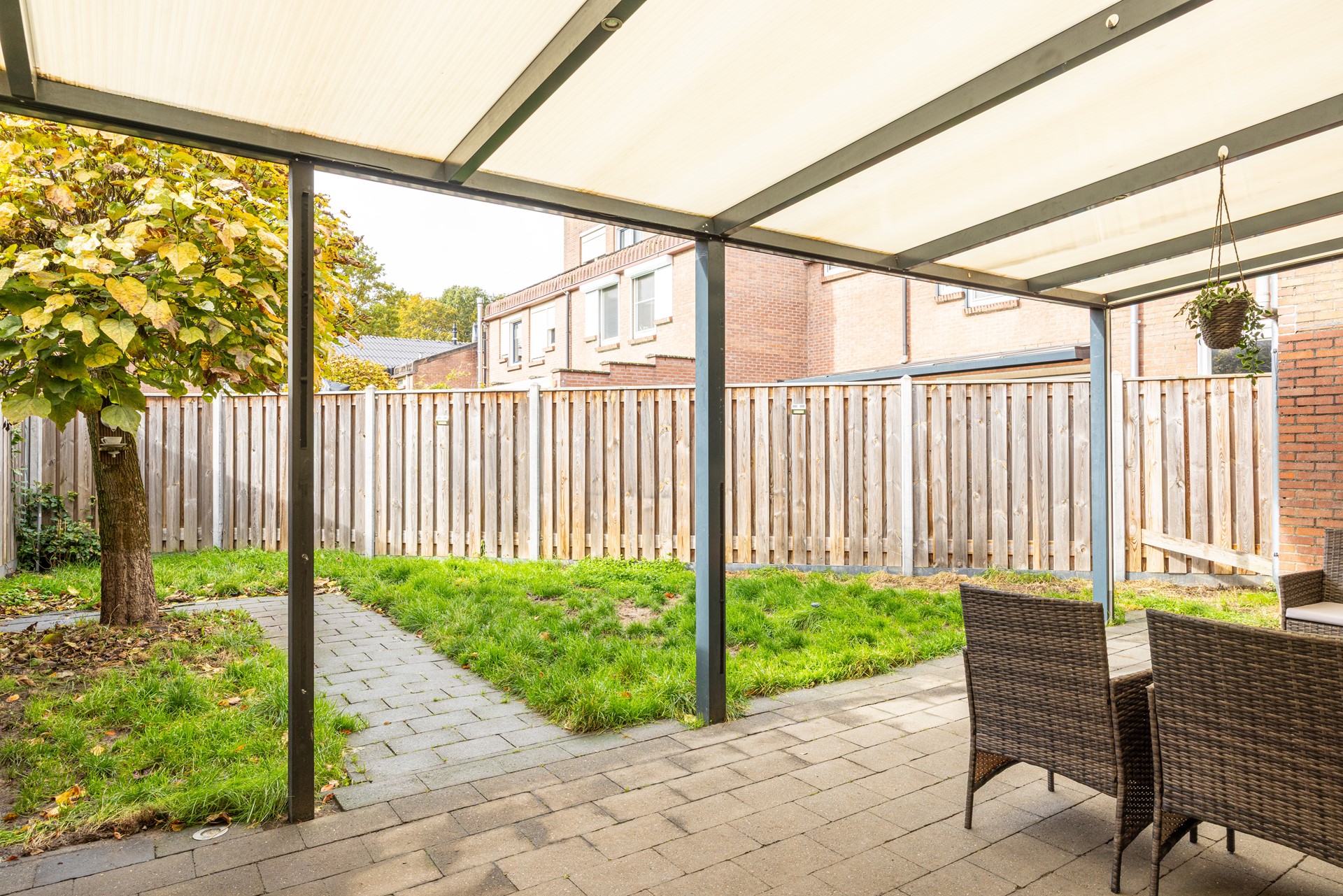 Onderhoudsvriendelijke tuin met overkapping en veel privacy