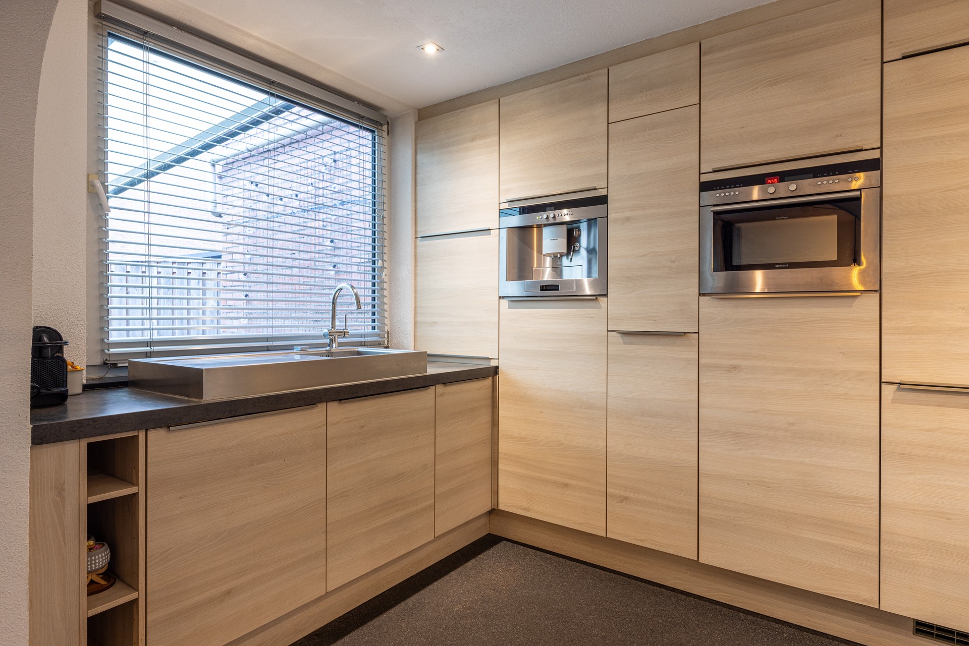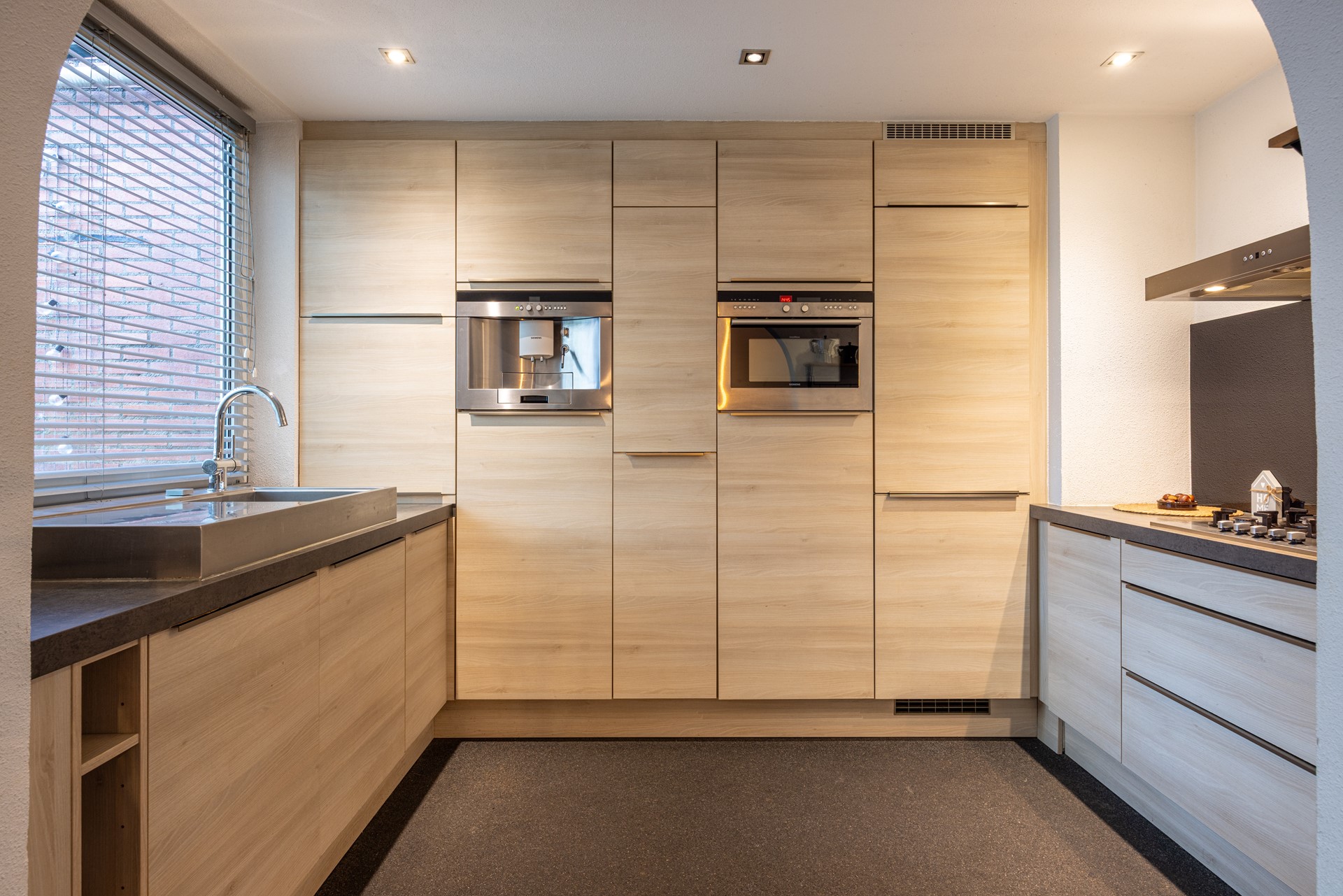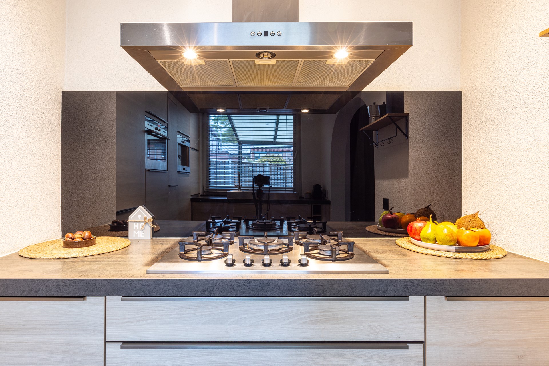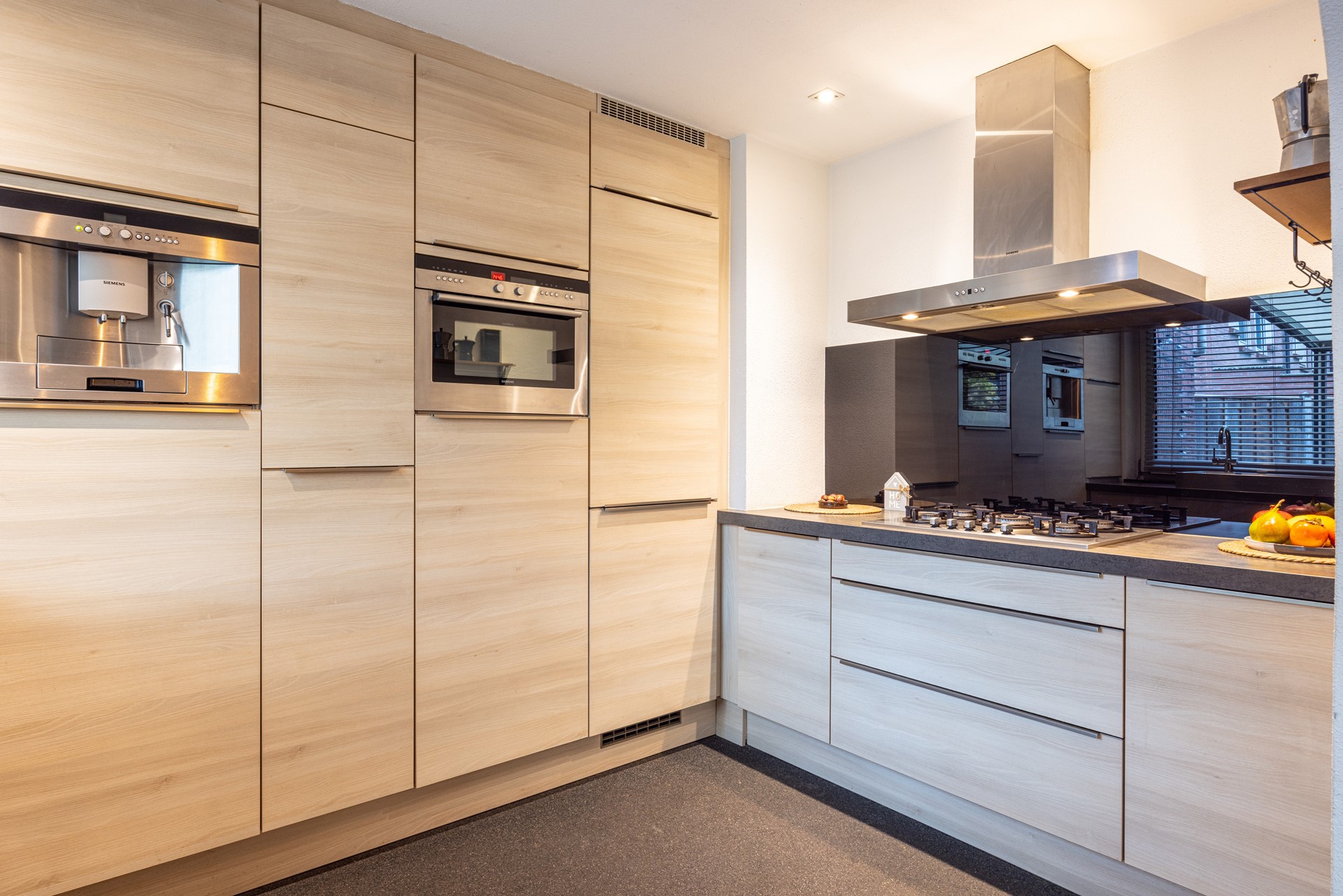 De keuken is compleet en voorzien van diverse inbouwapparatuur, waaronder een 5-pits gasfornuis met wok-brander, wandafzuigkap, oven-combi, koel-vriescombinatie en vaatwasser. Alles wat je nodig hebt om comfortabel te koken is hier aanwezig. Dankzij het raam aan de tuinzijde valt er prettig daglicht binnen, en heb je tijdens het koken mooi uitzicht op de achtertuin.