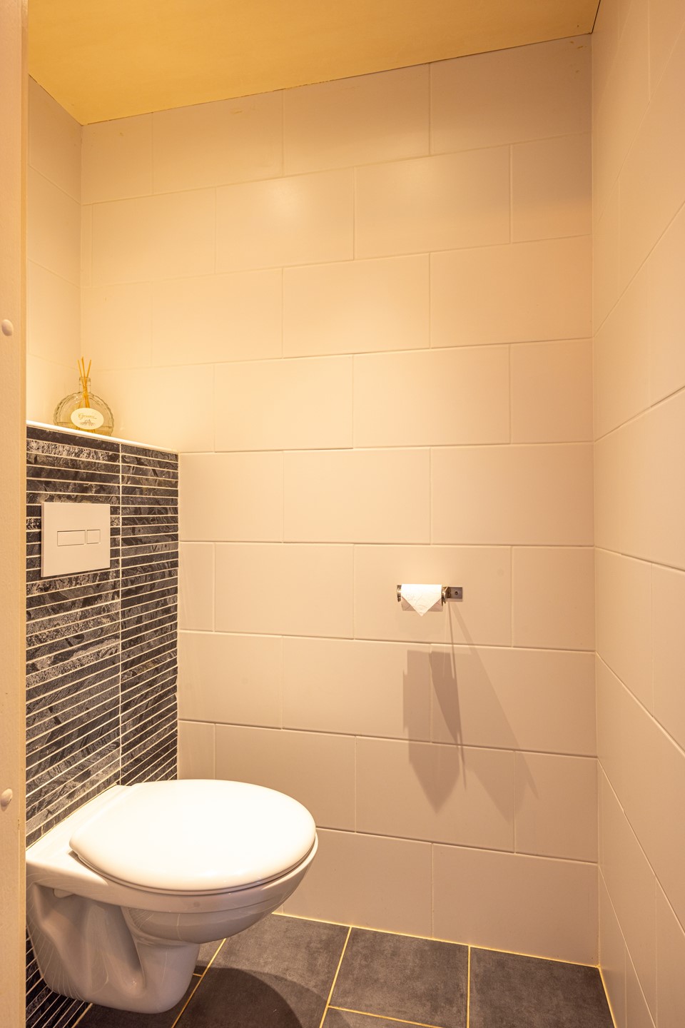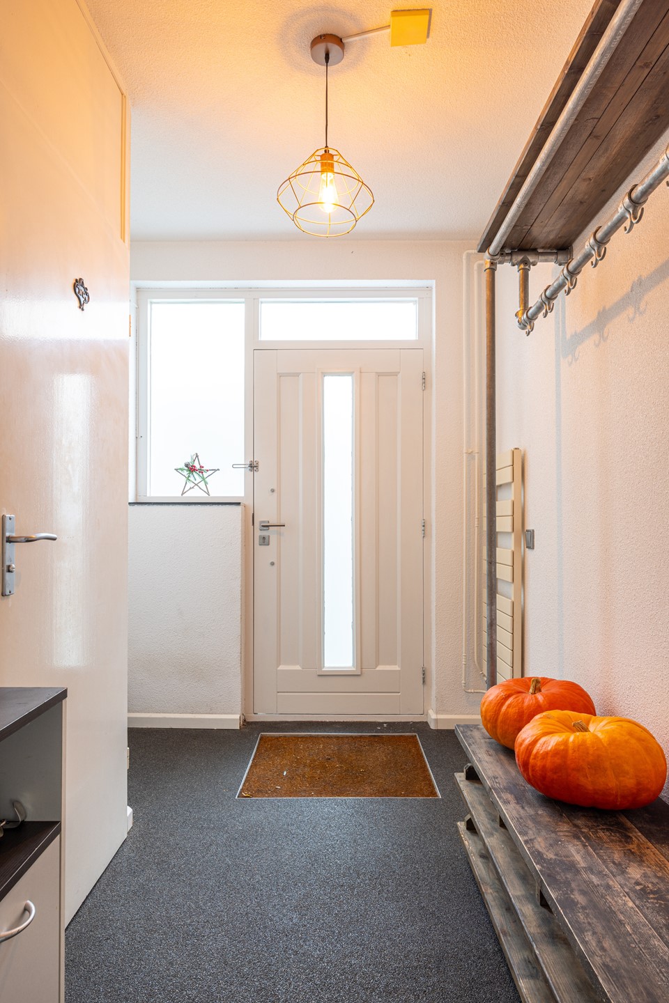 Je stapt binnen in de ontvangsthal, waar een grindvloer ligt die direct zorgt voor een verzorgde, tijdloze uitstraling. Hier bevinden zich de garderobe, meterkast, het toilet en de trapkast, die extra opbergruimte biedt voor bijvoorbeeld schoonmaakspullen, jassen of voorraad. Vanuit de hal stap je door naar de woonkamer.