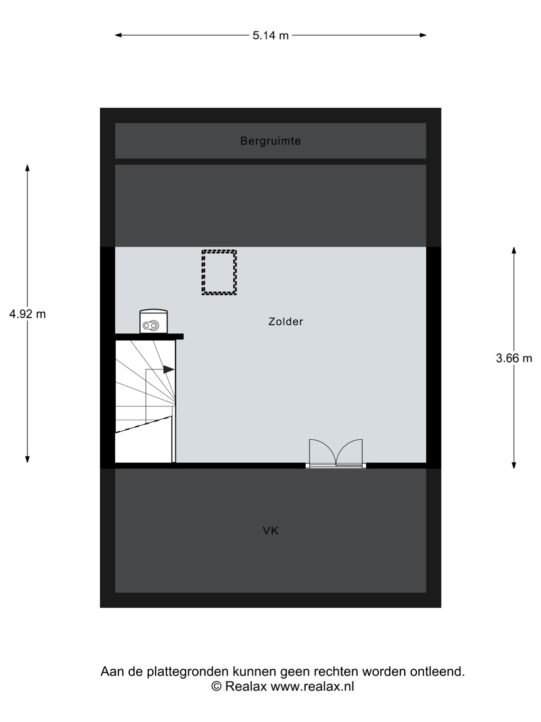 Aan de achterzijde bevindt zich een ruime bergruimte onder de schuine kap, ideaal voor het opbergen van seizoensspullen. Op de zolder is tevens de cv-installatie geplaatst.