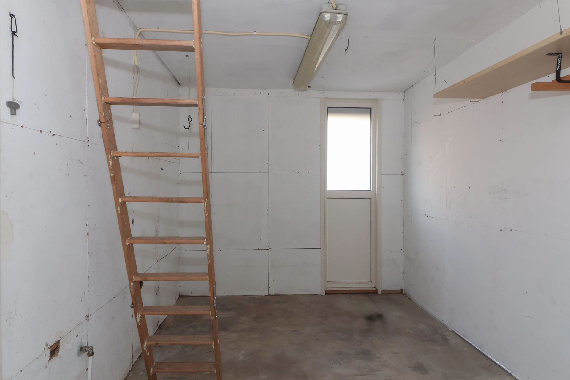Vanuit de berging is er toegang tot extra bergruimte op de verdieping erboven, bereikbaar via een losse trap. Deze bovenruimte biedt volop mogelijkheden voor opslag of het netjes opbergen van spullen die je niet dagelijks gebruikt.