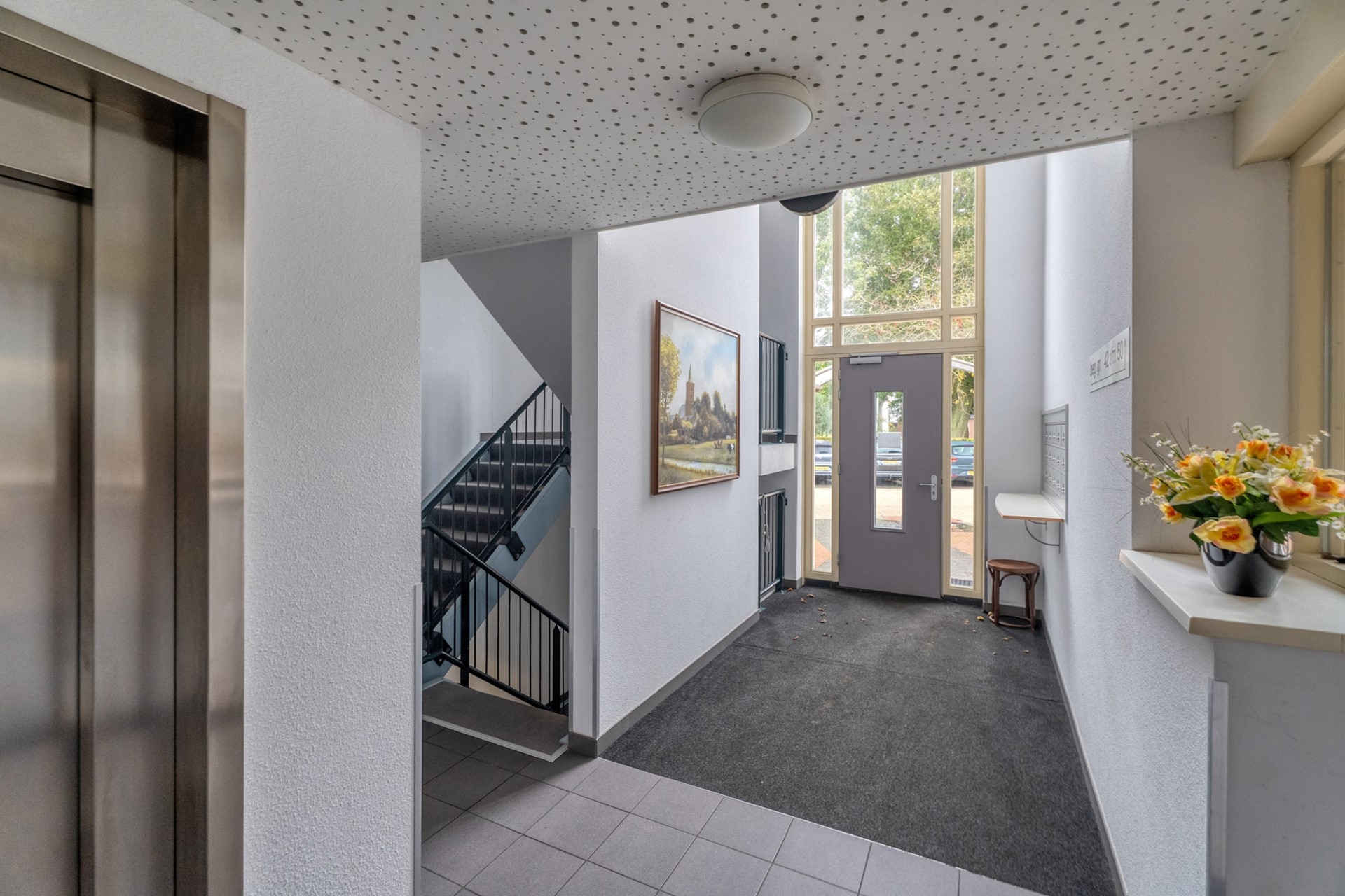 Via de centrale entree bereik je de trap naar de eerste verdieping, waar zich dit ruime en goed ingedeelde appartement bevindt.