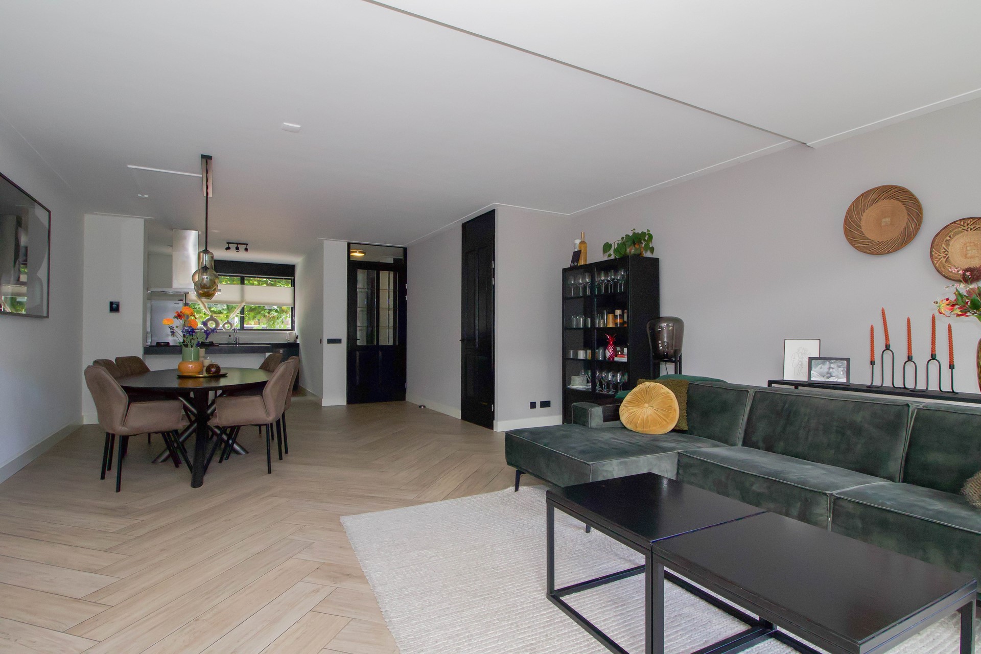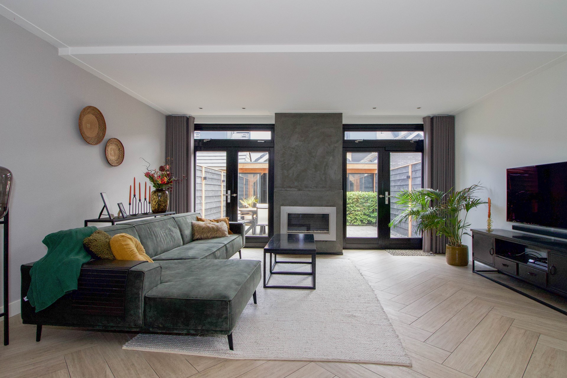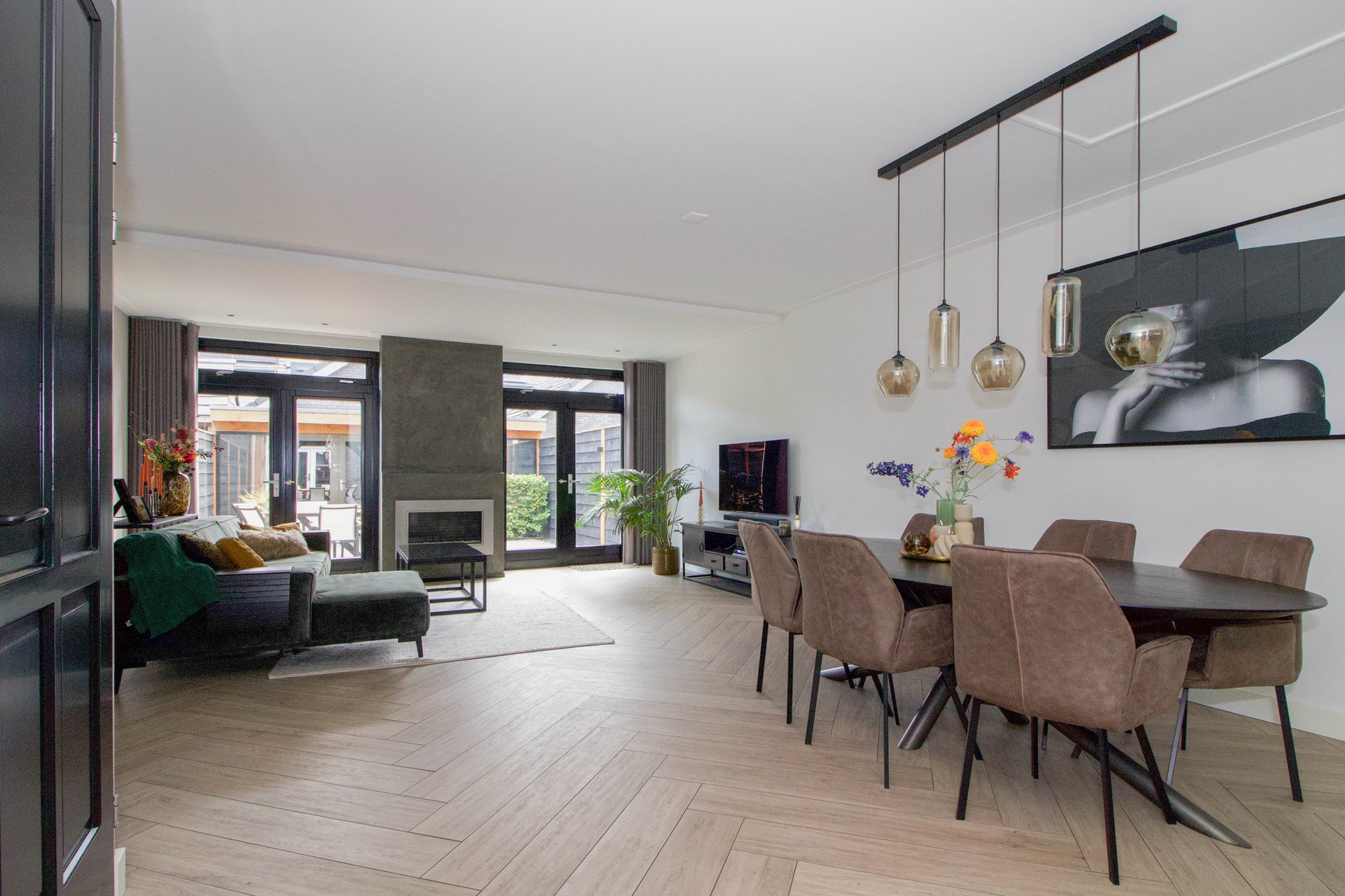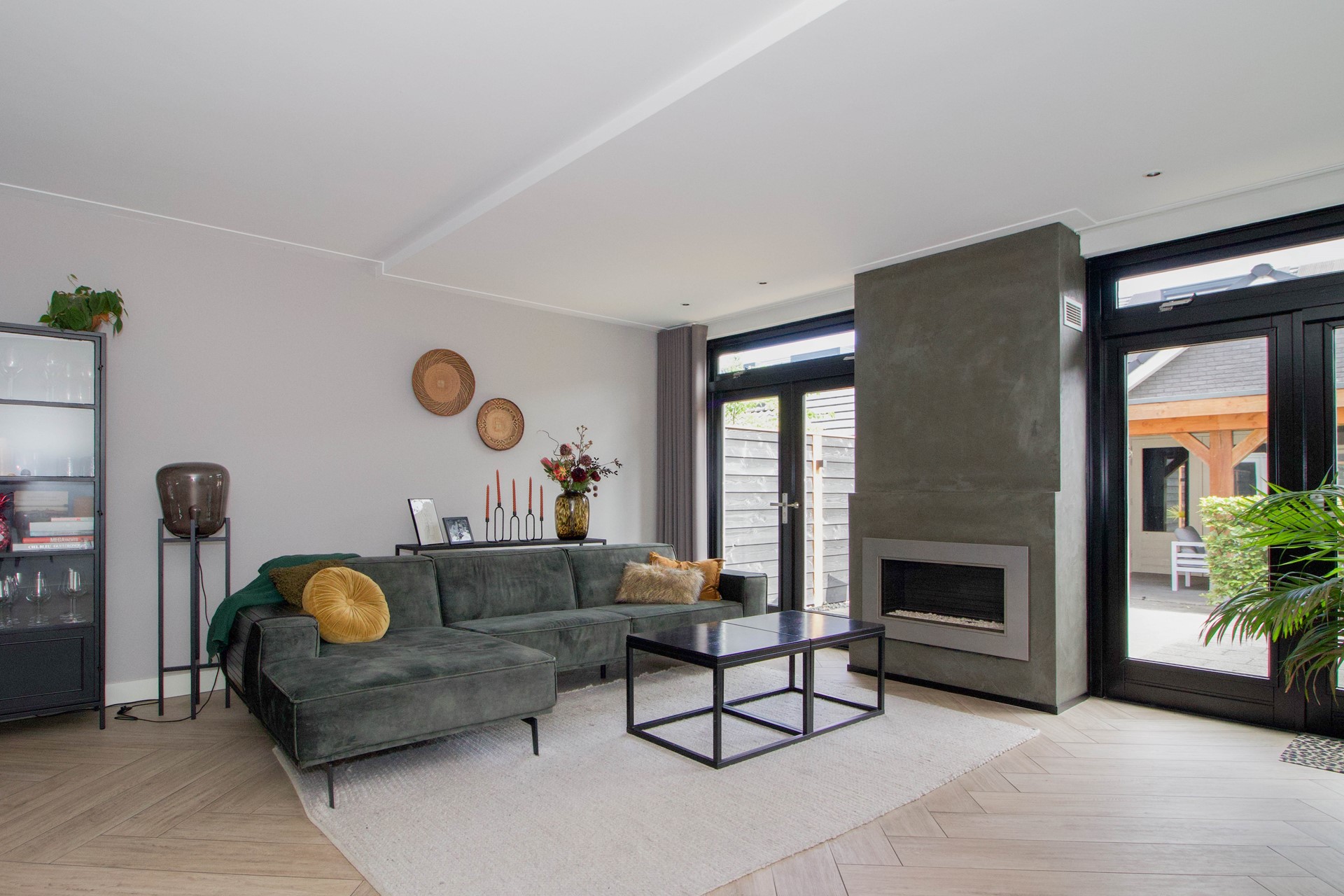 De woonkamer is een heerlijke plek om te zijn. De sfeervolle haard vormt het warme middelpunt, terwijl de visgraatvloer met vloerverwarming zorgt voor comfort en stijl in één. Dankzij de dubbele openslaande deuren aan beide zijden stroomt het licht rijkelijk naar binnen én loopt het leven naadloos over in de tuin. En die tuin? Die is royaal, fraai aangelegd en voorzien van een XL stenen schuur én een overdekte veranda om het hele jaar door van buiten te genieten.