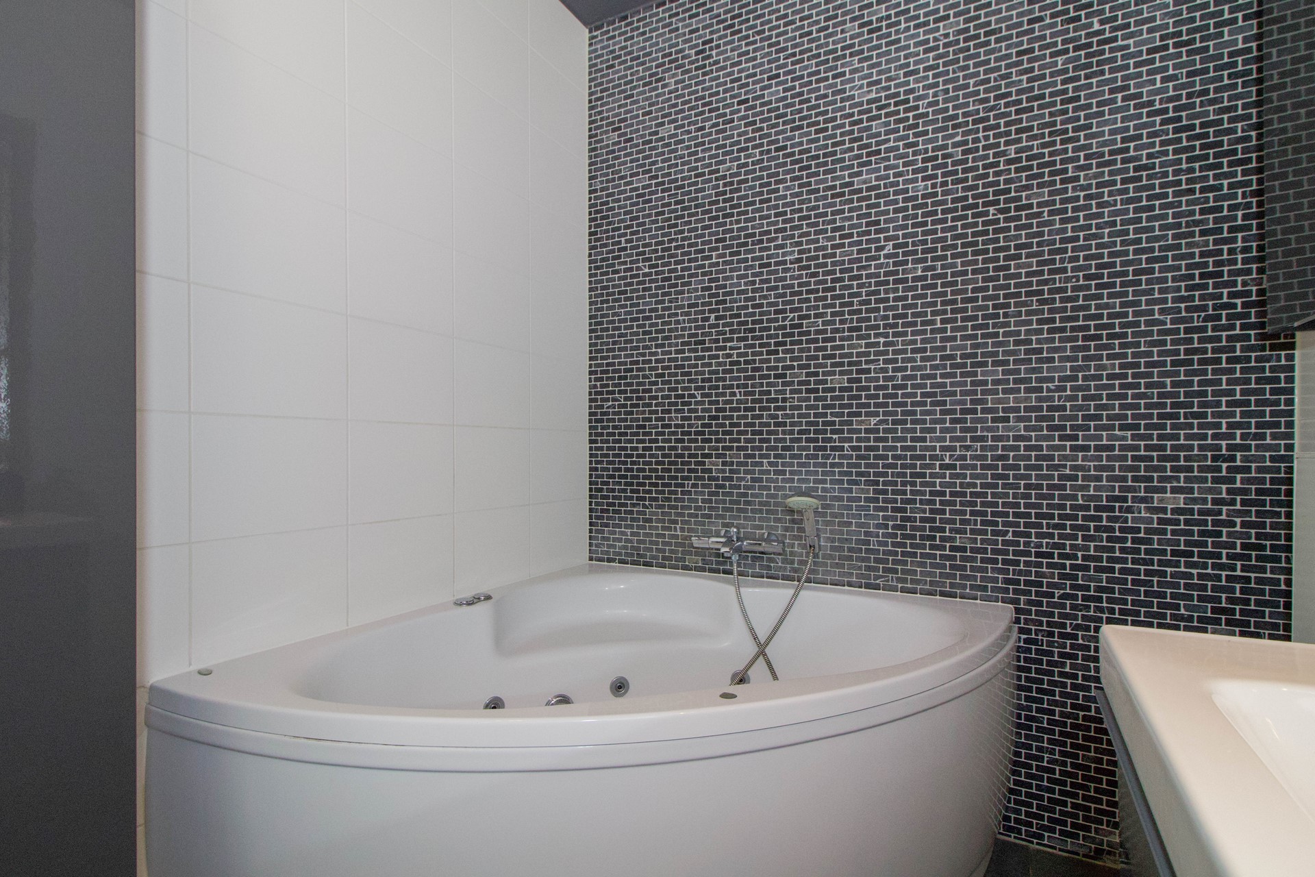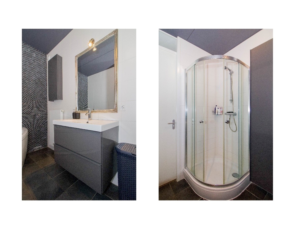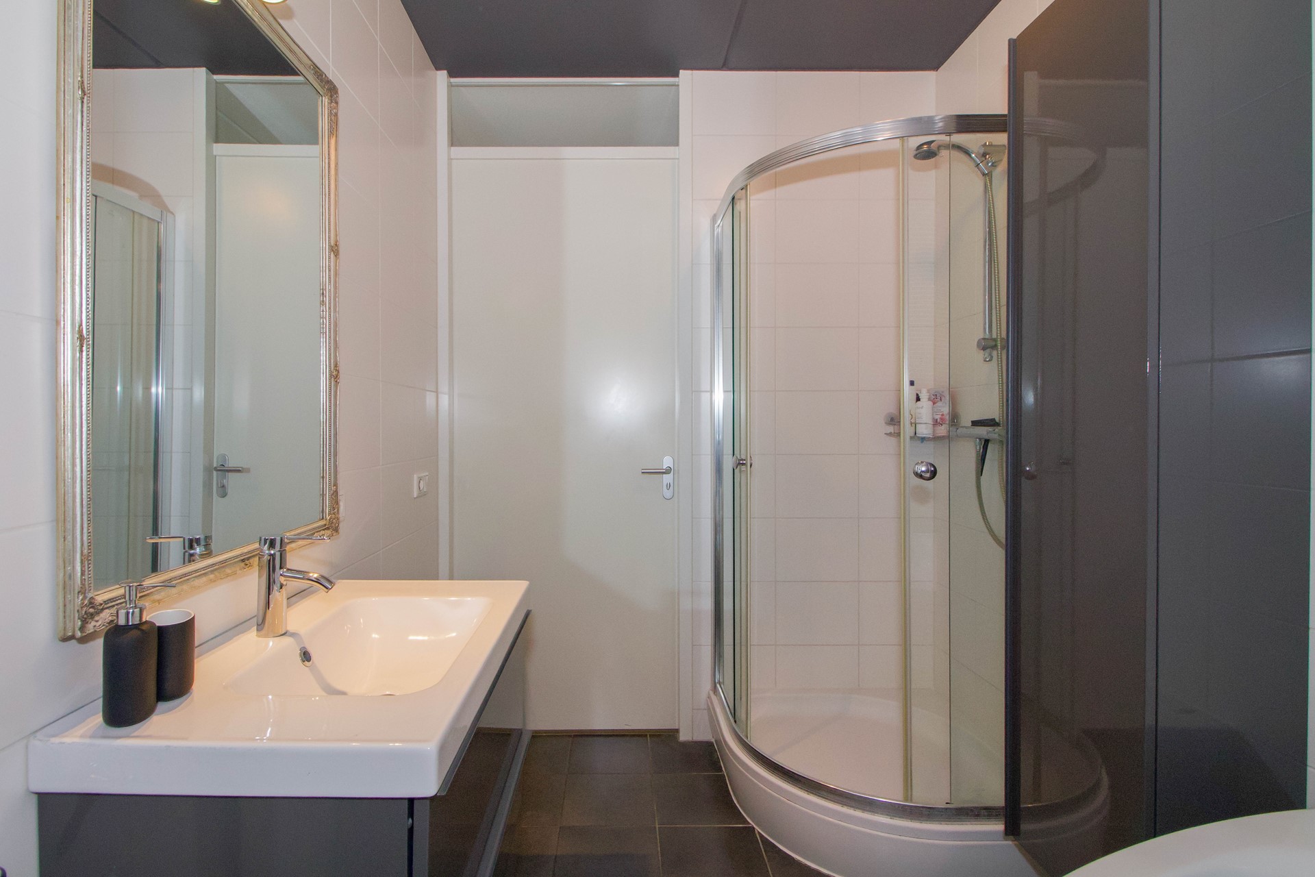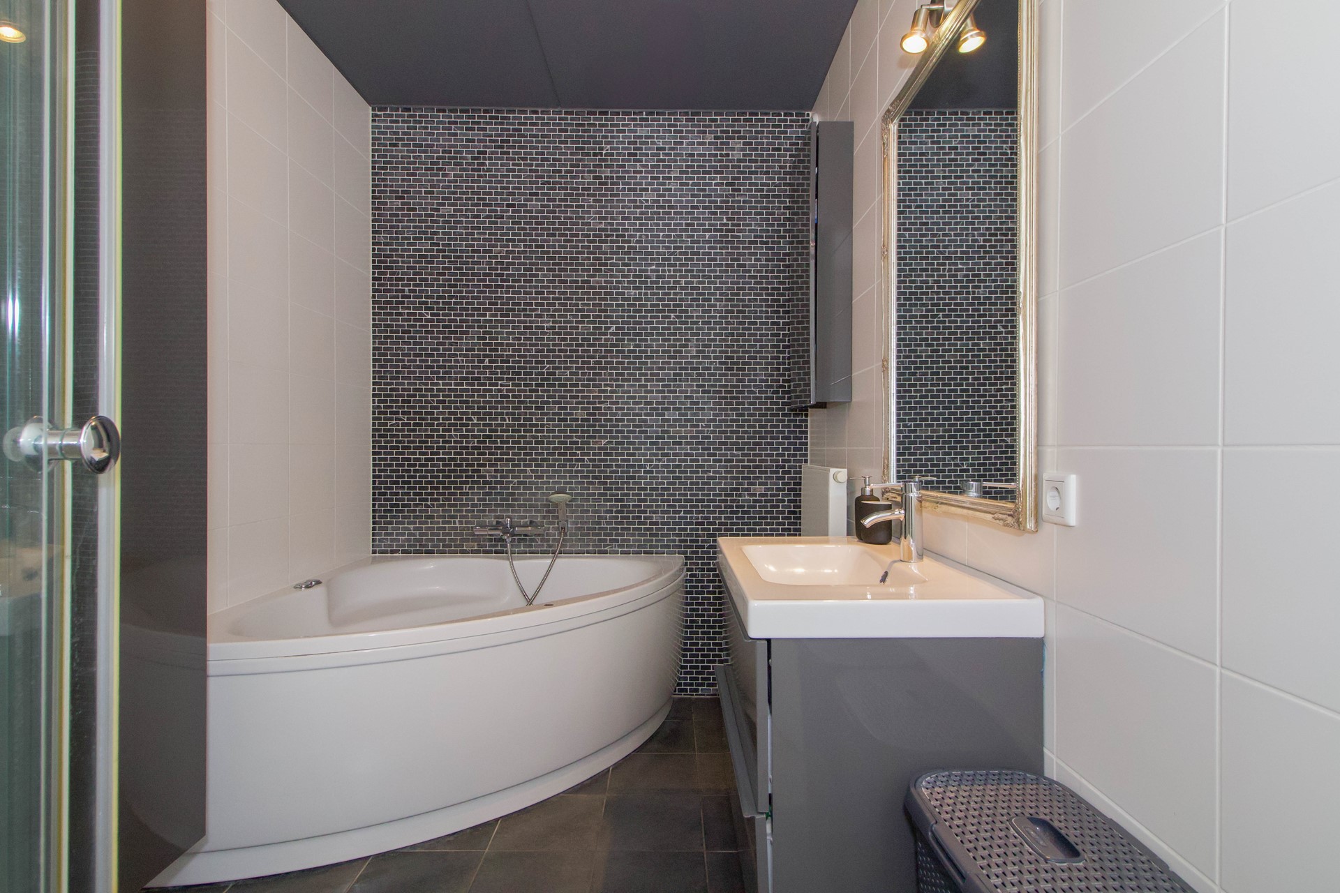 De badkamer is voorzien van een inloopdouche en een ruim ligbad, wastafelmeubel met treklades, spiegel en radiator.