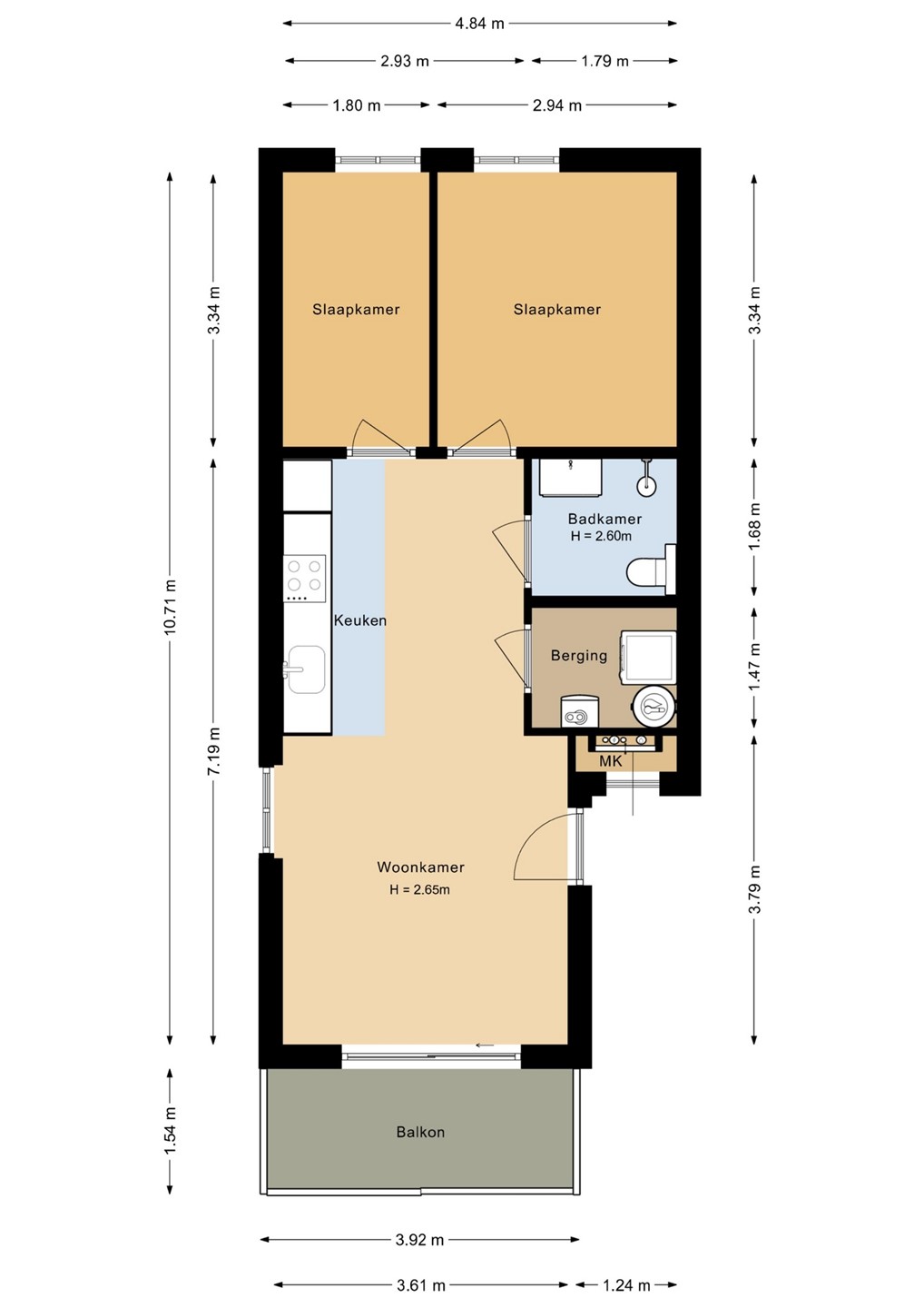 Aan de voorzijde bevindt zich de lichte woonkamer met een plafondhoogte van 2,65 meter. De grote raampartijen zorgen voor veel natuurlijk licht en geven toegang tot het balkon op het zuiden, waar je de hele dag van de zon kunt genieten.