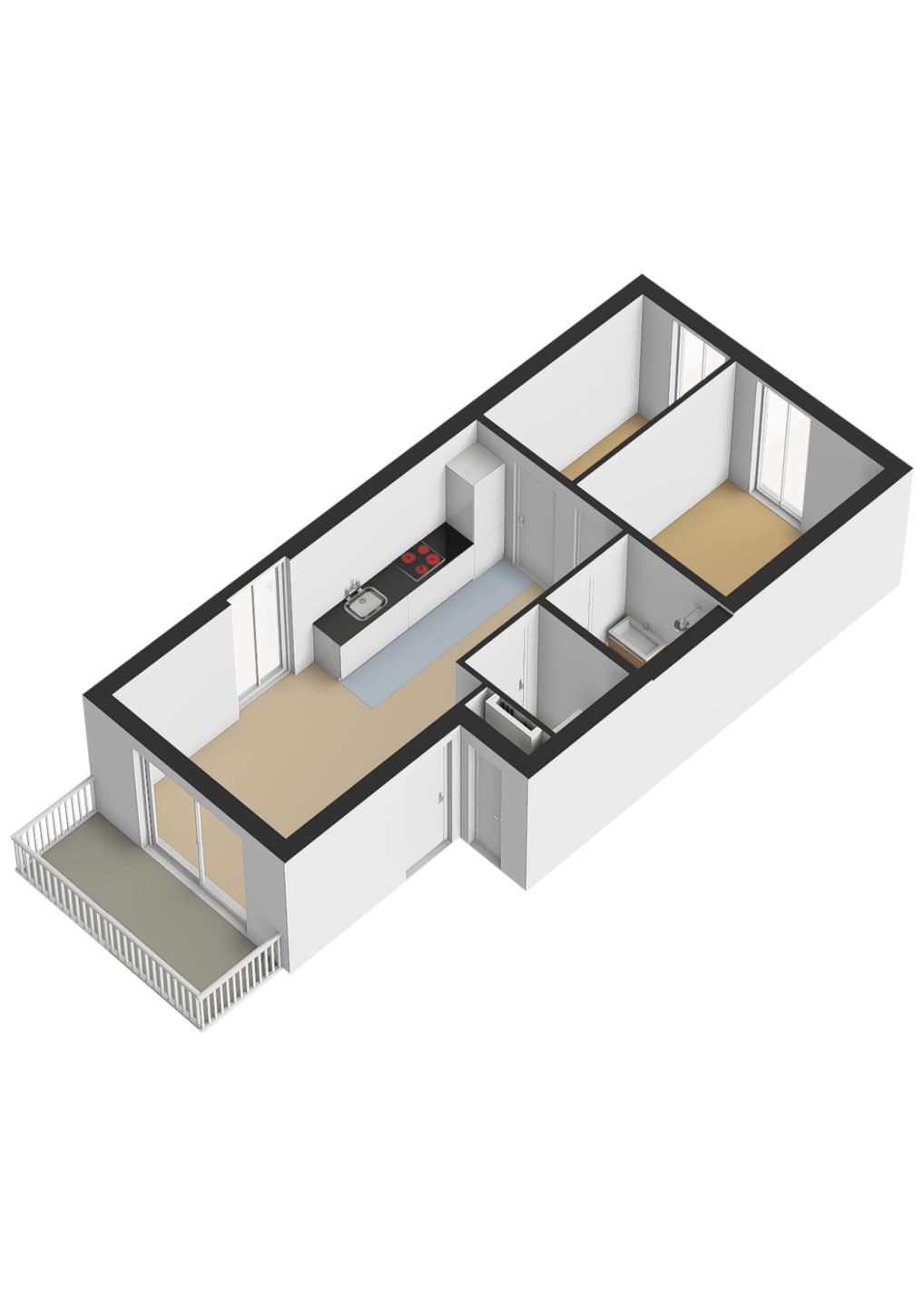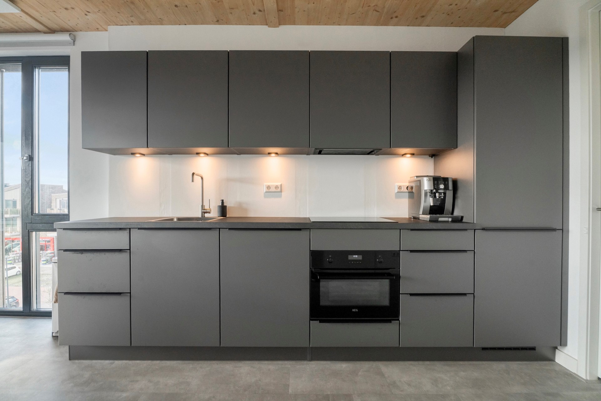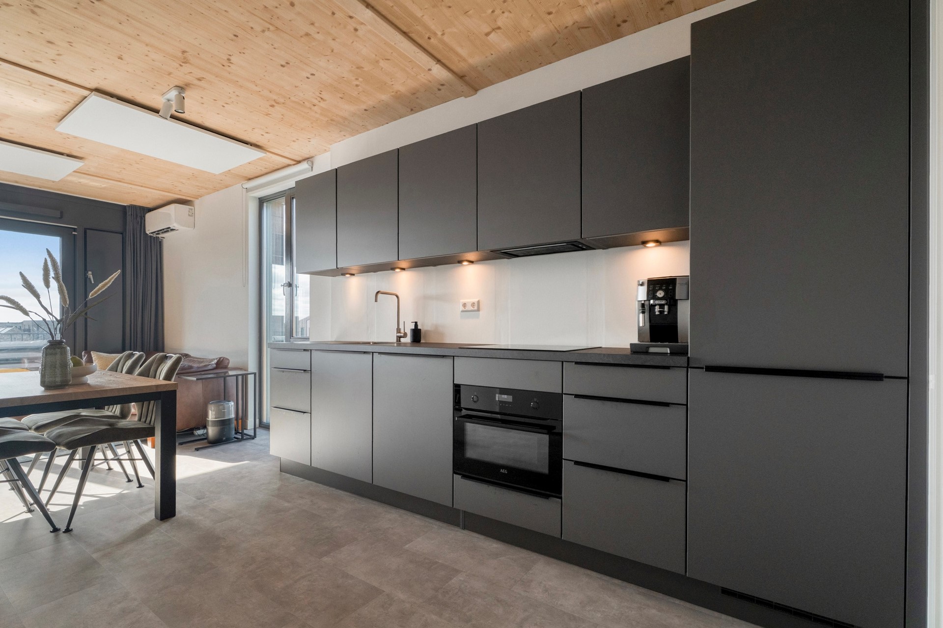 De open keuken ligt in het verlengde van de woonkamer en is voorzien van een praktisch keukenblok met een kookplaat, oven en spoelbak. Dankzij de open indeling is dit een prettige plek om te koken en tegelijk contact te houden met het woongedeelte.