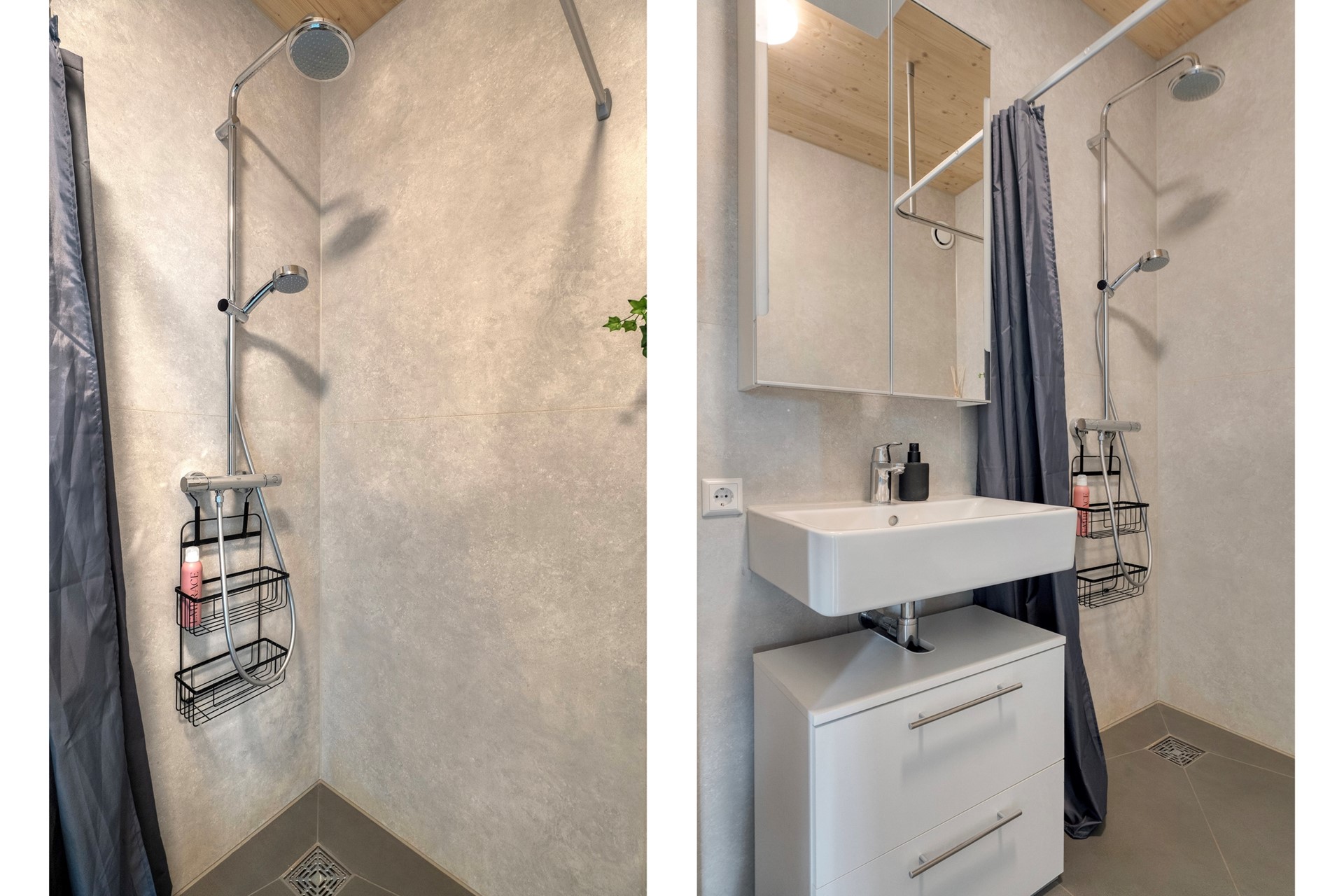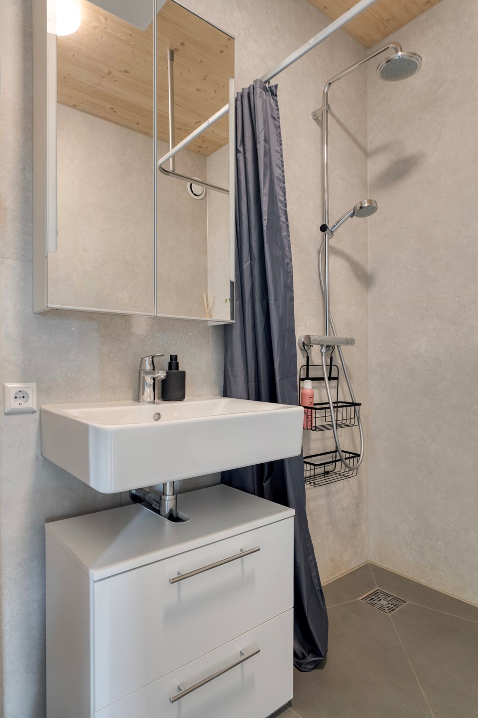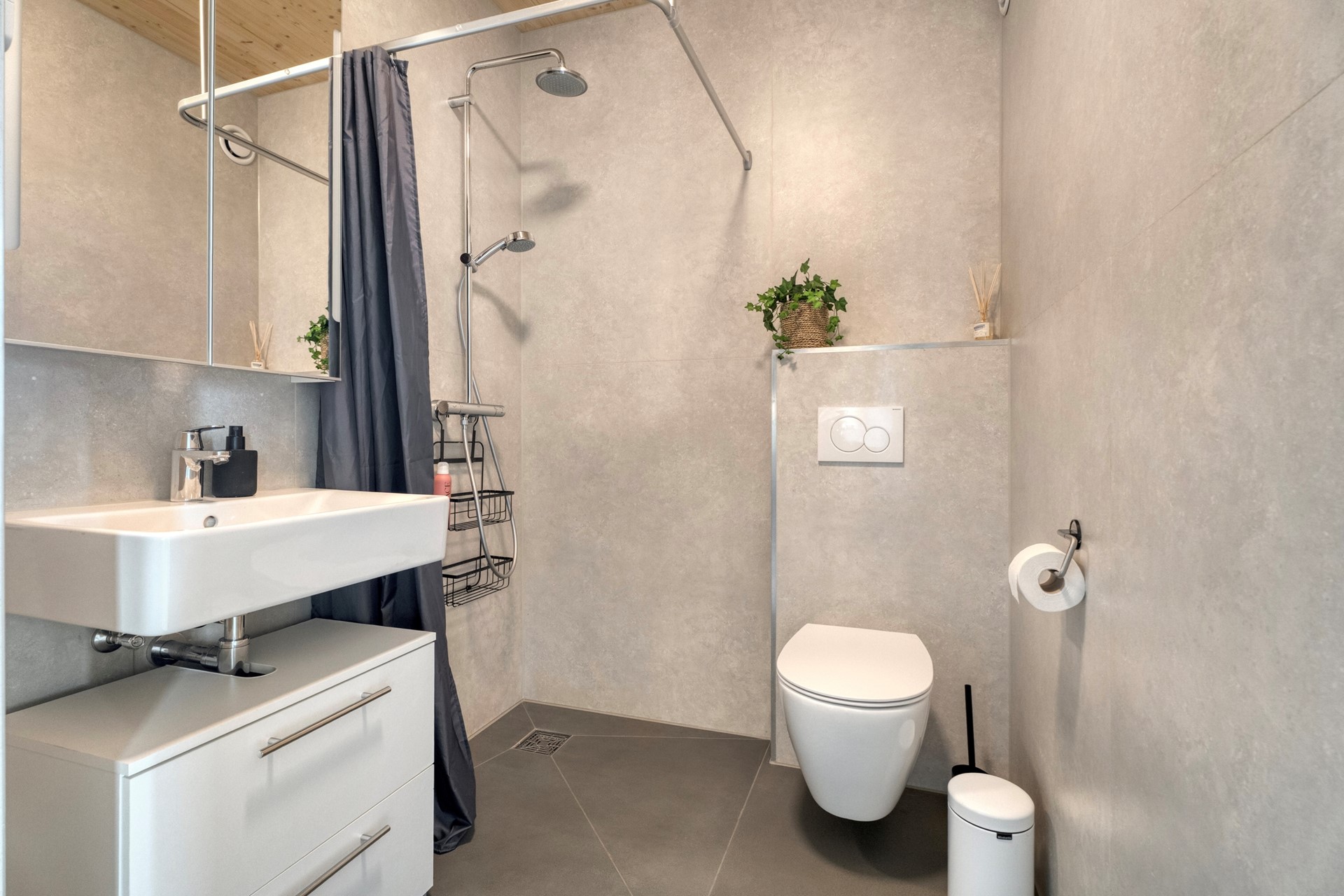 De badkamer is centraal gelegen en beschikt over een douche, wastafel en toilet. Aangrenzend bevindt zich een berging met ruimte voor de wasmachine en droger, en daarnaast een meterkast (MK) voor de technische installaties.
