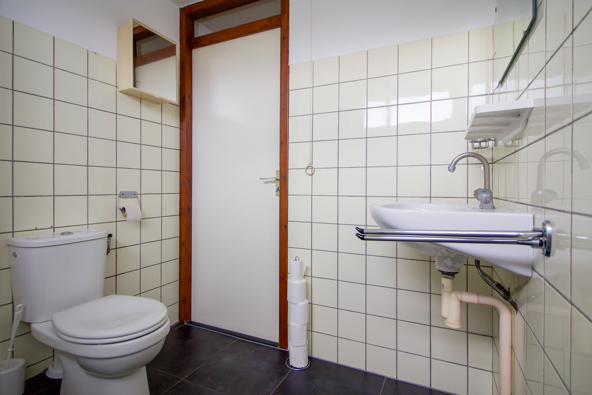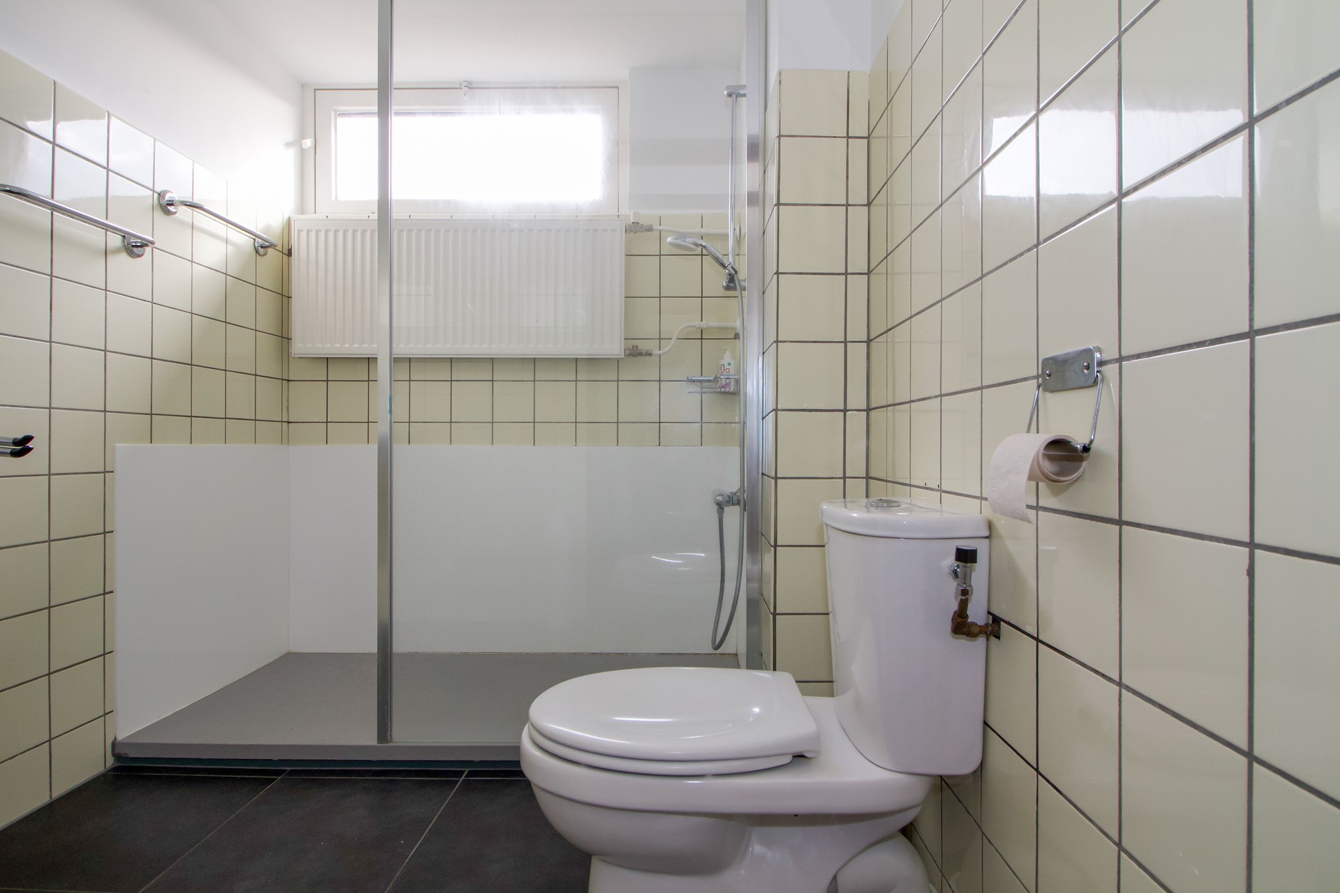 Aan de voorzijde van de woning bevindt zich de badkamer, uitgerust met een inloopdouche, wastafel en tweede toilet. Dankzij het raam beschikt de ruimte over fijn daglicht en natuurlijke ventilatie.