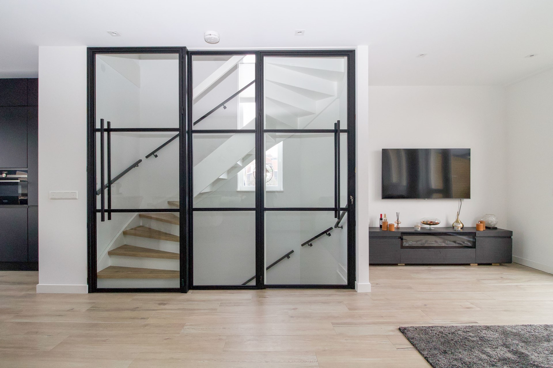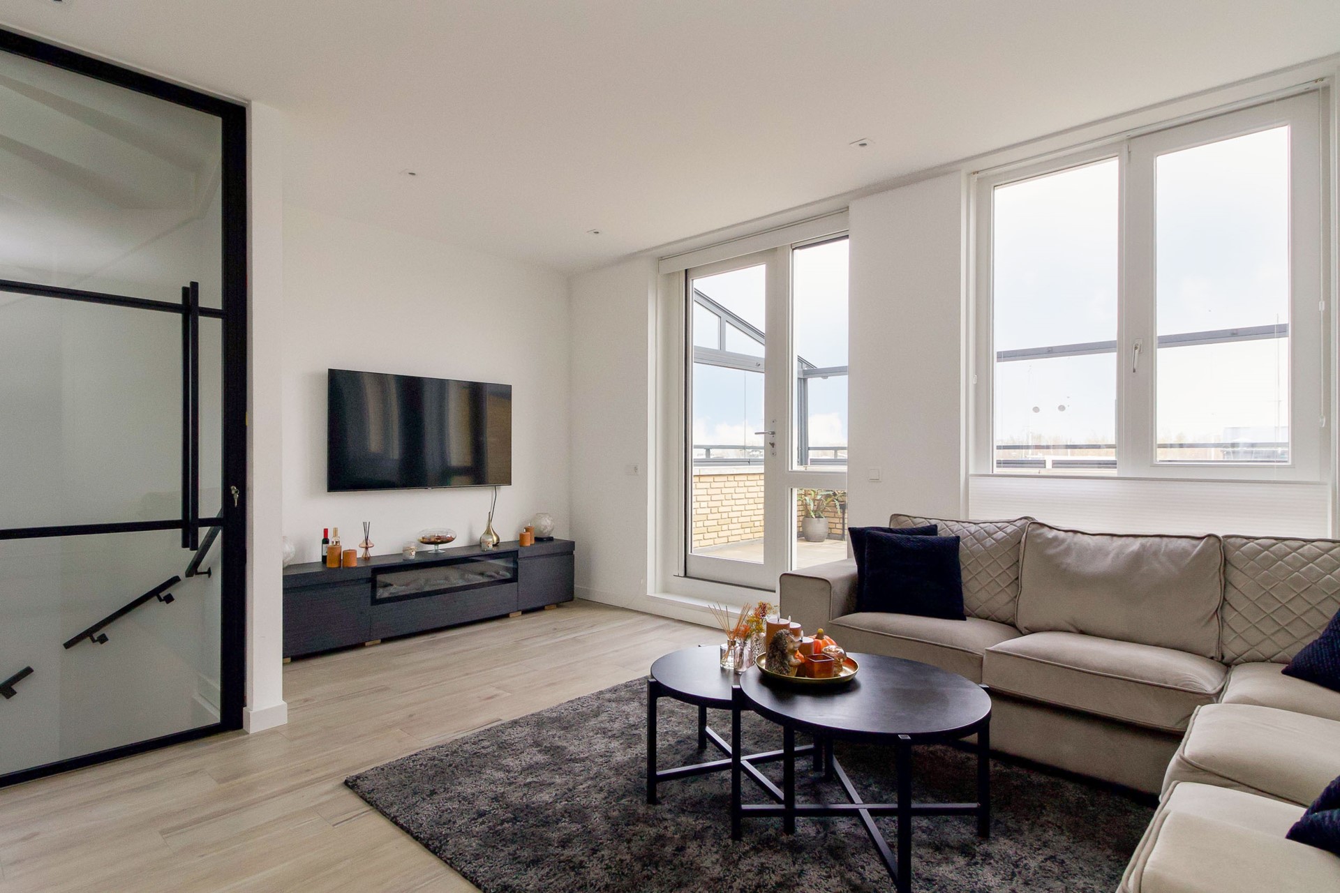Op de eerste etage ontvouwt zich het hart van de woning. De woonkamer en keuken vormen samen een sfeervolle leefverdieping waar afwerking en luxe samenkomen. Stalen deuren en strak afgewerkte wanden zorgen voor een moderne, rustige uitstraling die direct prettig aanvoelt. Vanuit de woonkamer stap je het dakterras op, een heerlijk verlengstuk van de leefruimte waar het uitzicht over het Eemmeer elke dag weer indruk maakt. Dankzij de afsluitbare opzet is dit een plek waar binnen en buiten moeiteloos in elkaar overlopen.
