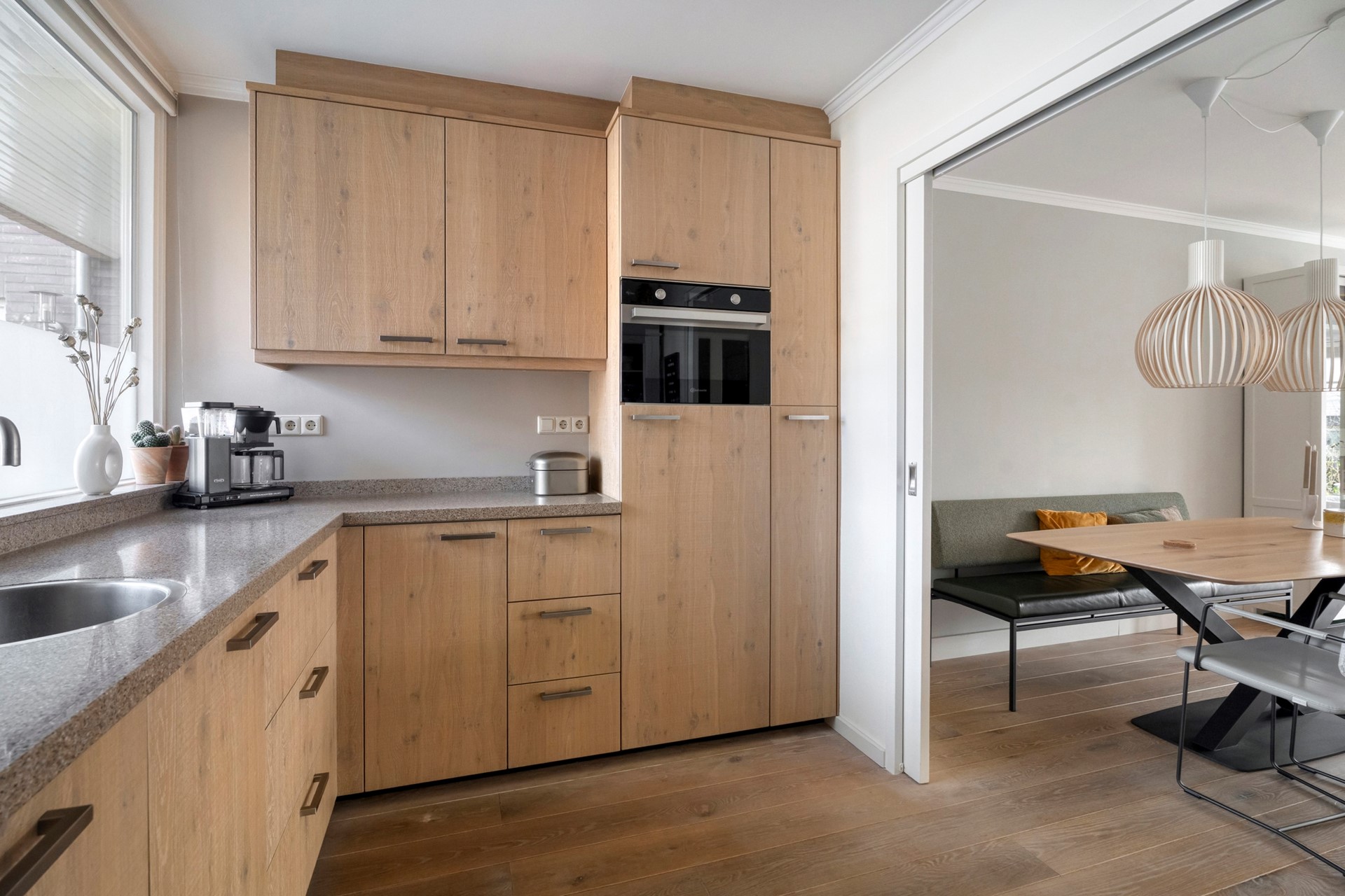 Binnen valt direct op hoeveel leefruimte deze woning te bieden heeft. De woonkamer is door de uitbouw aan de achterzijde heerlijk royaal van opzet en vormt een fijne plek waar je met gemak een grote zithoek én eethoek creëert. Grote raampartijen zorgen voor een prettige lichtinval en geven tegelijkertijd een mooi zicht op de tuin. De afwerking van de woning is verzorgd en modern, waardoor je hier zonder klussen kunt intrekken en direct kunt genieten.