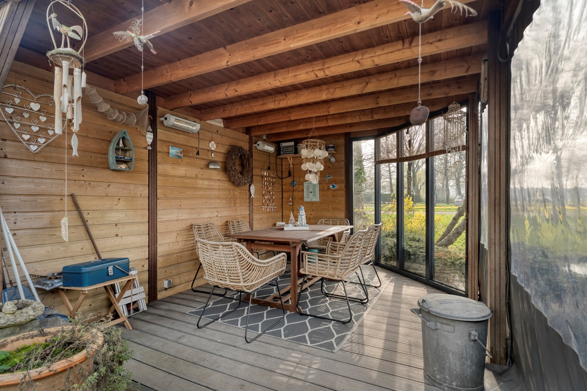 Achterin de tuin bevindt zich een ruime overkapping, een gezellige plek waar u beschut kunt zitten en heerlijk kunt genieten van het buitenleven, ook wanneer het weer wat minder is. Dankzij de transparante zijwanden blijft het uitzicht op de omgeving behouden.