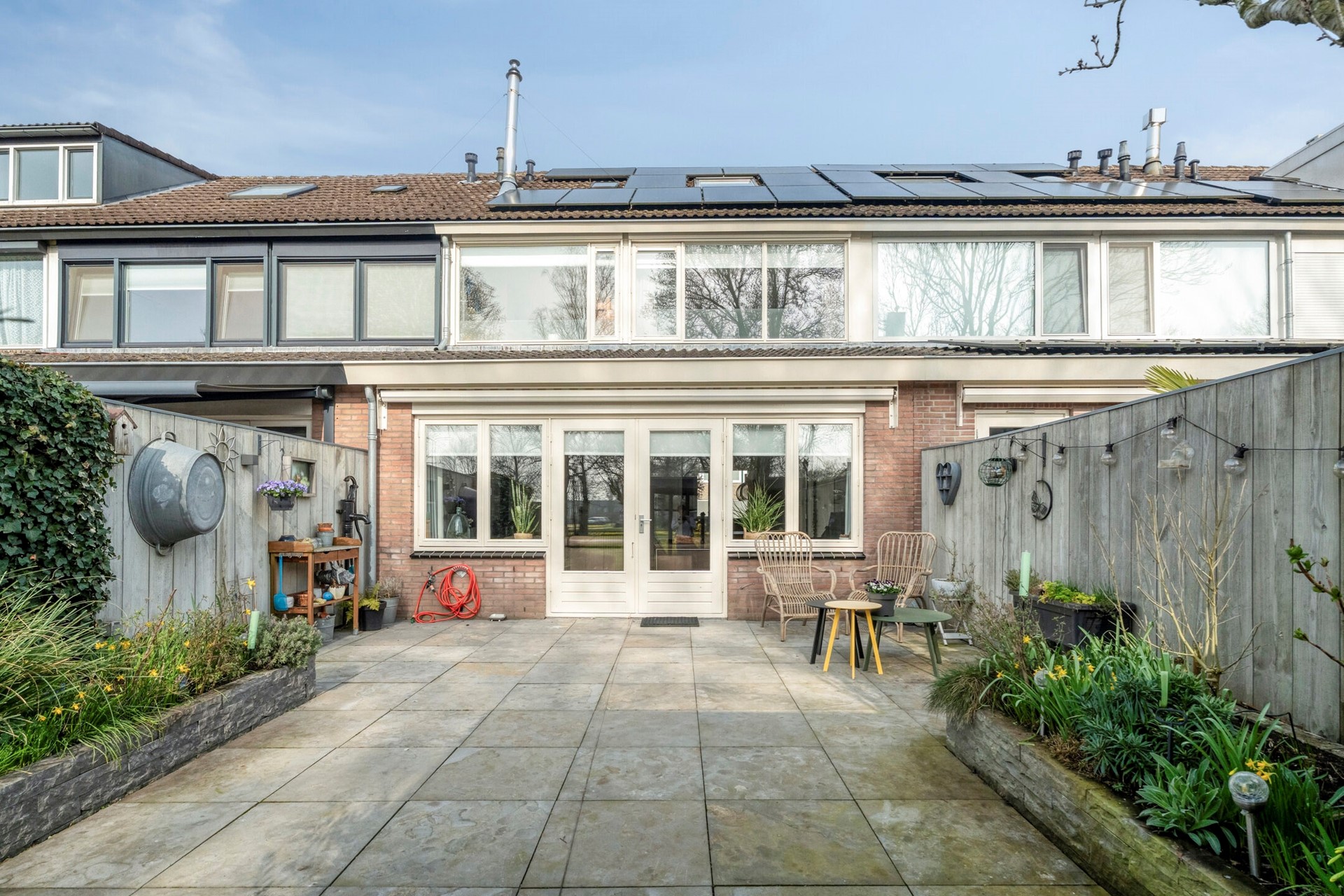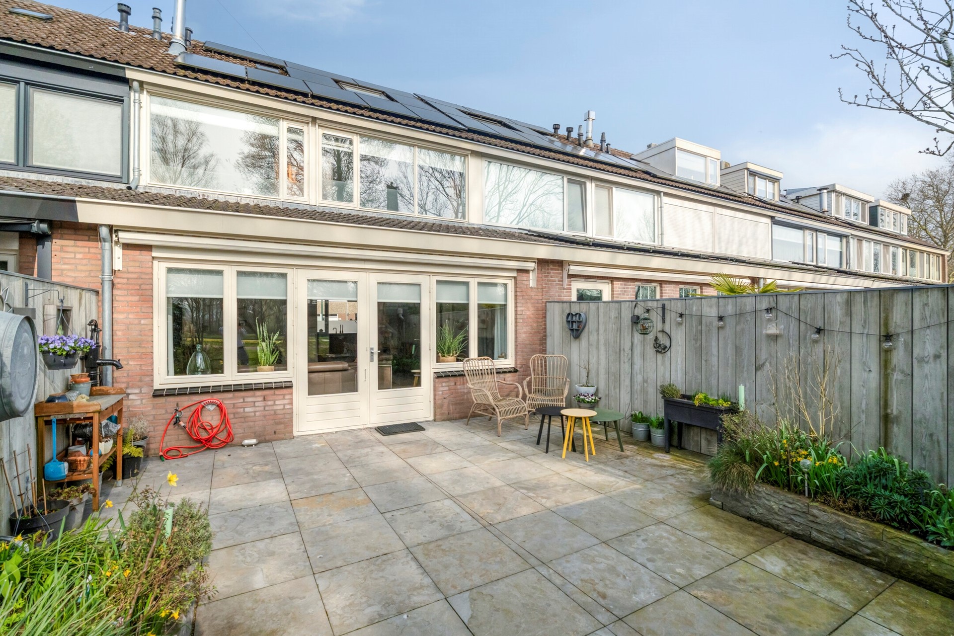 De woning beschikt over een verzorgde en sfeervolle achtertuin, gelegen op het zuidwesten, waardoor u hier volop kunt genieten van de middag- en avondzon. De tuin is grotendeels bestraat met ruime terrastegels, wat zorgt voor een onderhoudsvriendelijke buitenruimte met meerdere plekken om te zitten.