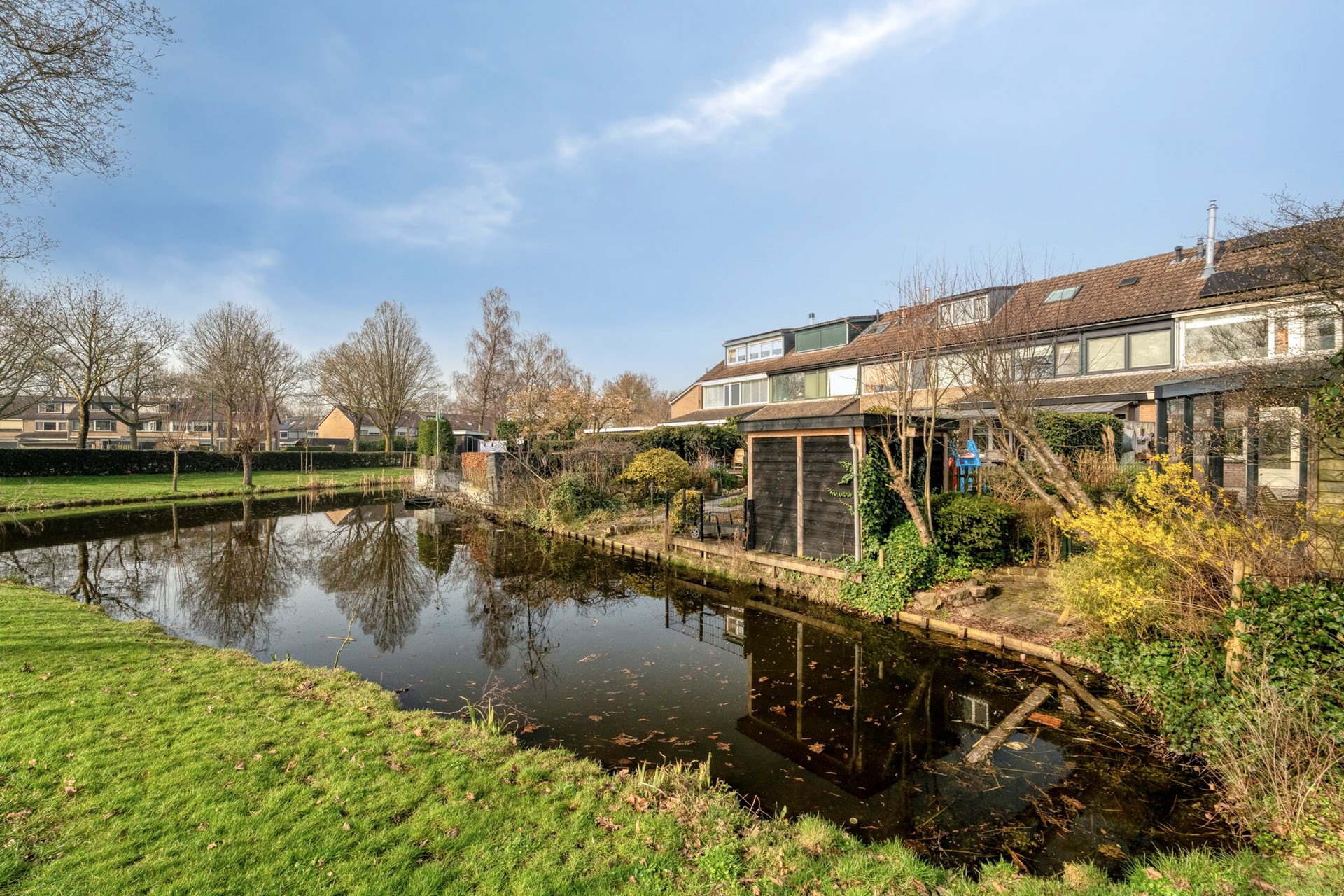De tuin is verder fraai aangelegd met groene borders en beplanting, wat zorgt voor een prettige en natuurlijke uitstraling. Aan de achterzijde grenst de tuin aan een waterpartij en groenstrook, waardoor u een vrij en rustgevend uitzicht heeft.