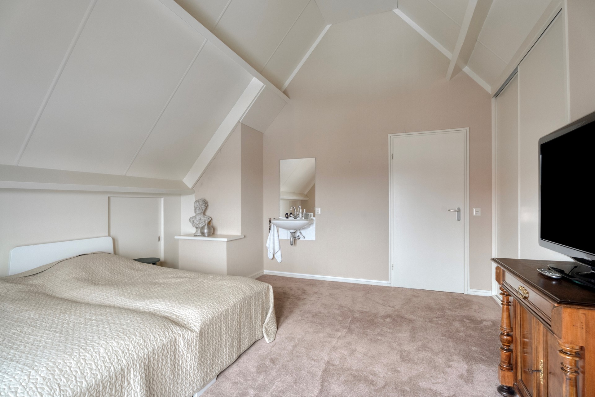 Op dit moment is de woning levensloopbestendig ingericht, maar ook als gezinswoning komt hij volledig tot zijn recht. Op de verdieping bevinden zich meerdere slaapkamers en een badkamer, met de mogelijkheid om eenvoudig extra kamers te realiseren. De master bedroom is daarbij een absolute blikvanger. Met een Frans balkon op het oosten word je hier wakker met de opkomende zon en het serene beeld van de haven en haar karakteristieke botters op de achtergrond.