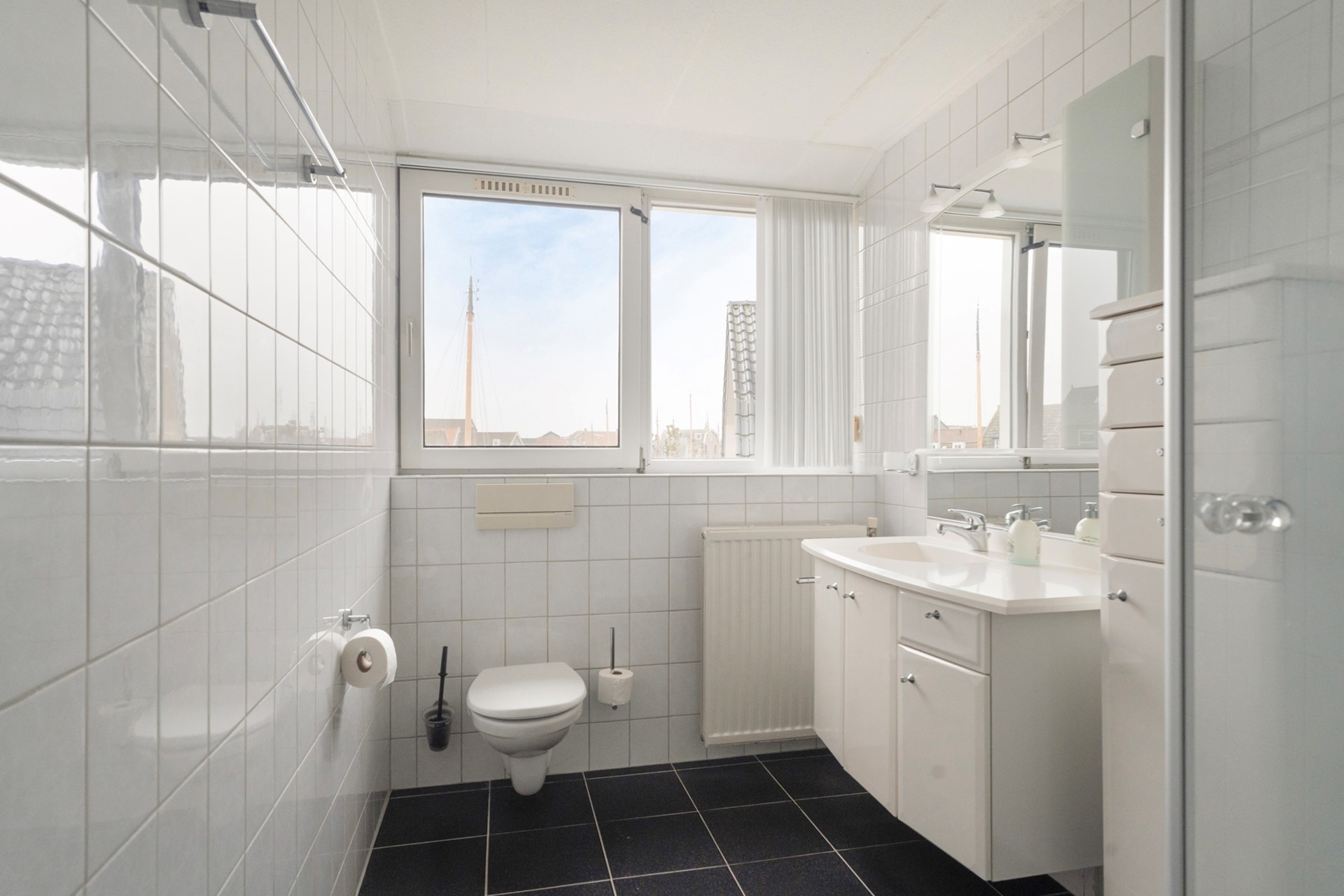 Via de overloop heb je toegang tot twee ruime slaapkamers, beide met een prettige lichtinval. De slaapkamer aan de achterzijde beschikt over een balkon, een fijne plek om even buiten te zitten. De voorste slaapkamer is voorzien van een Frans balkon met een fraai uitzicht op de haven.