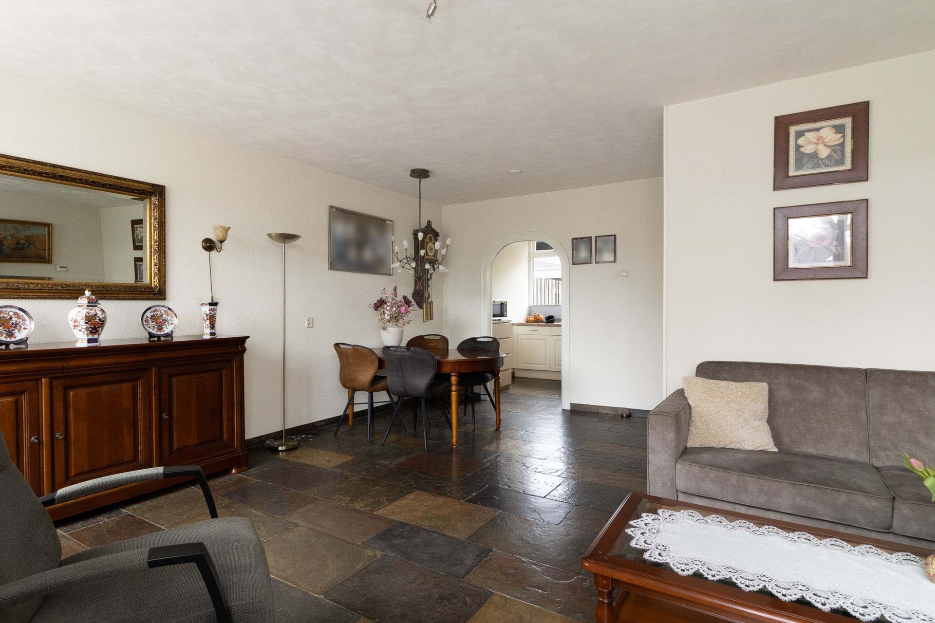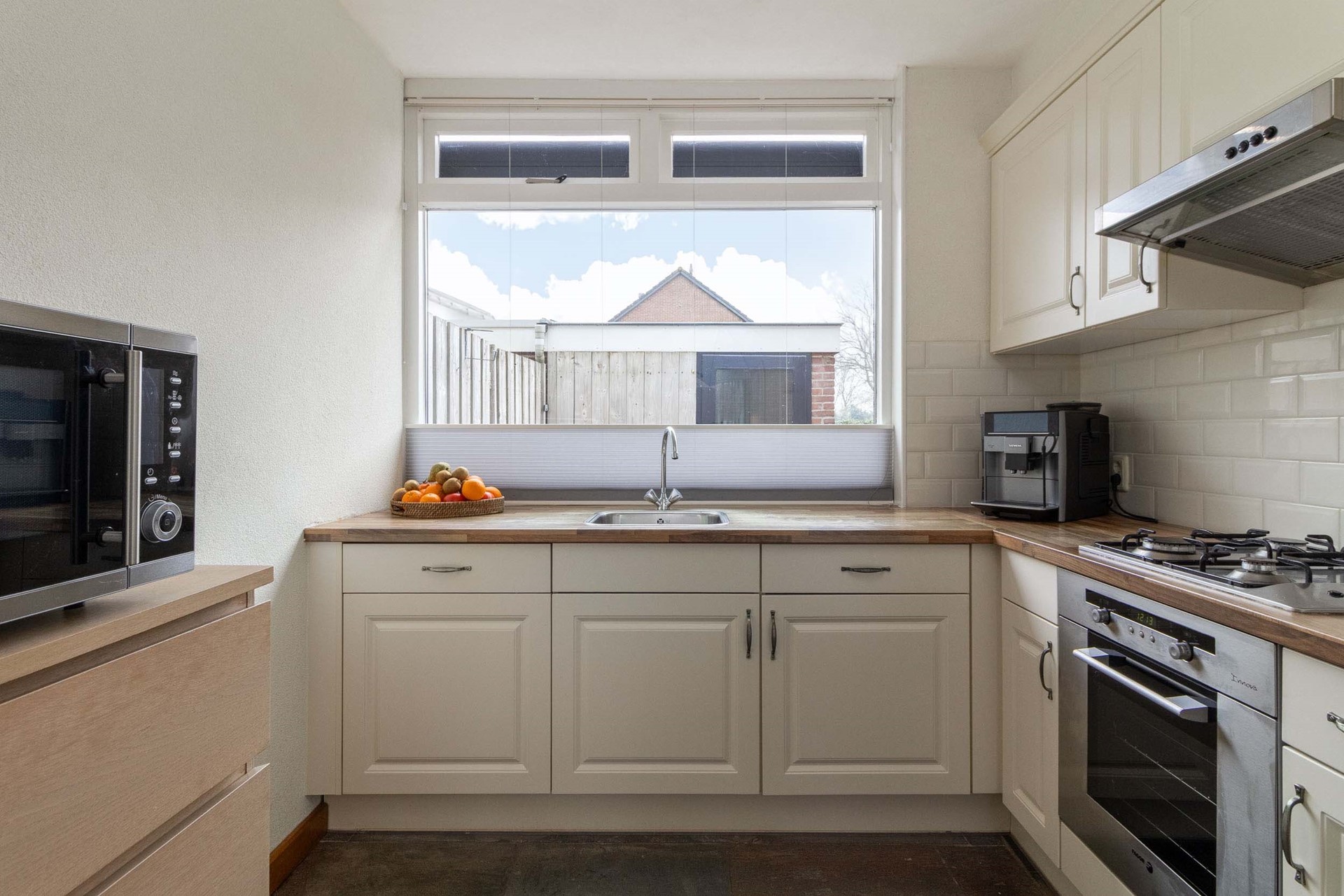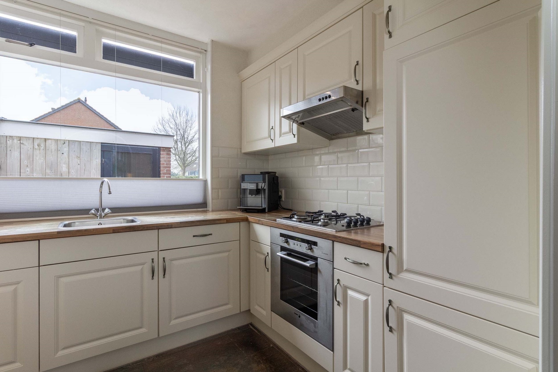 Binnen stap je in een lichte woonkamer waar comfort en mogelijkheden samenkomen. De vloerverwarming op de begane grond zorgt voor een aangename warmte en een strakke uitstraling. De indeling is logisch en biedt een mooie basis voor wie graag moderniseert of verbouwt. Hier kun je echt jouw eigen stijl tot leven brengen, zonder concessies te doen aan ruimte of functionaliteit. De keuken sluit prettig aan op de leefruimte, waardoor koken en samen zijn moeiteloos in elkaar overlopen.