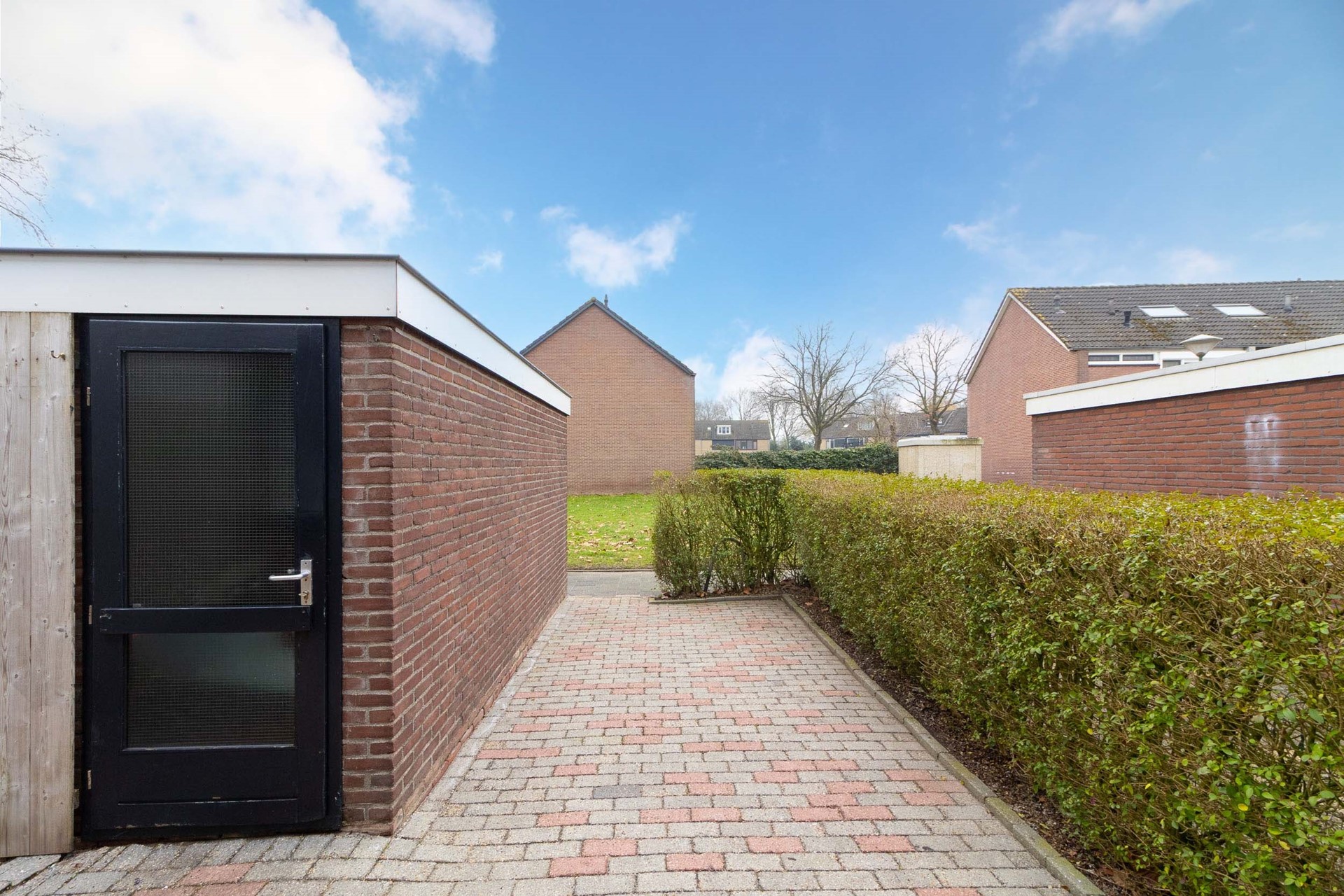 Achterin de tuin bevindt zich een handige achterom, ideaal voor bijvoorbeeld fietsen of het bereiken van de tuin zonder door de woning te hoeven.
