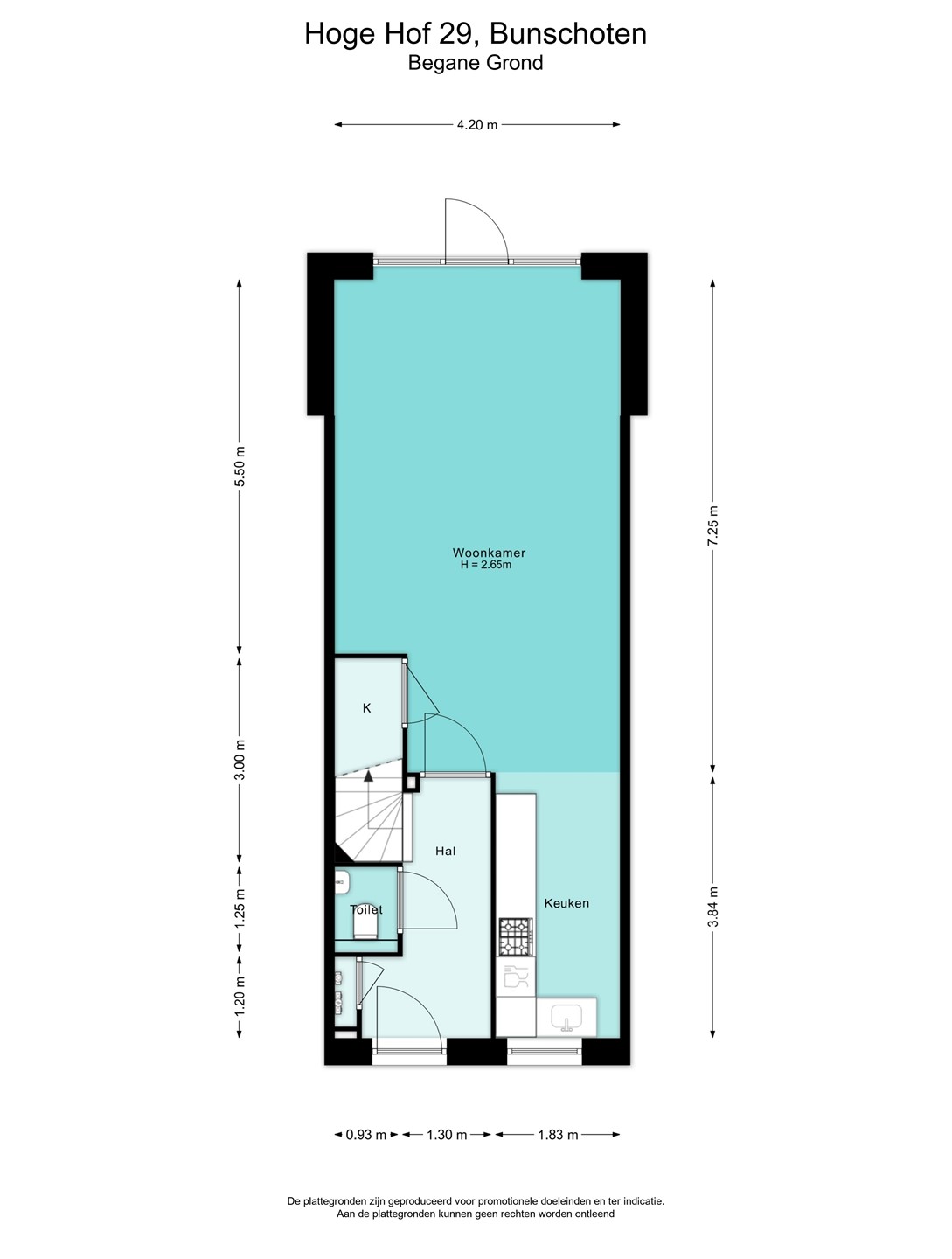 Via de entree kom je binnen in de hal met meterkast, toilet en trapopgang. Vanuit de hal heb je toegang tot de woonkamer.