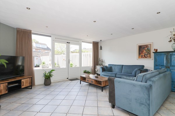 Tuingerichte woonkamer met openslaande deuren naar de tuin.