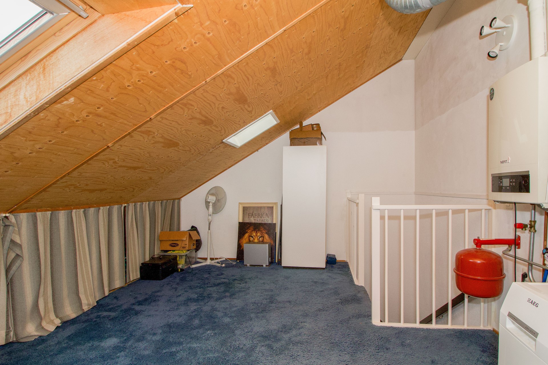 Via een vaste trap bereikt u de zolderverdieping. Deze open ruimte is voorzien van aansluitingen voor wasapparatuur en biedt volop mogelijkheden voor het creëren van een extra slaapkamer, werkruimte of berging.