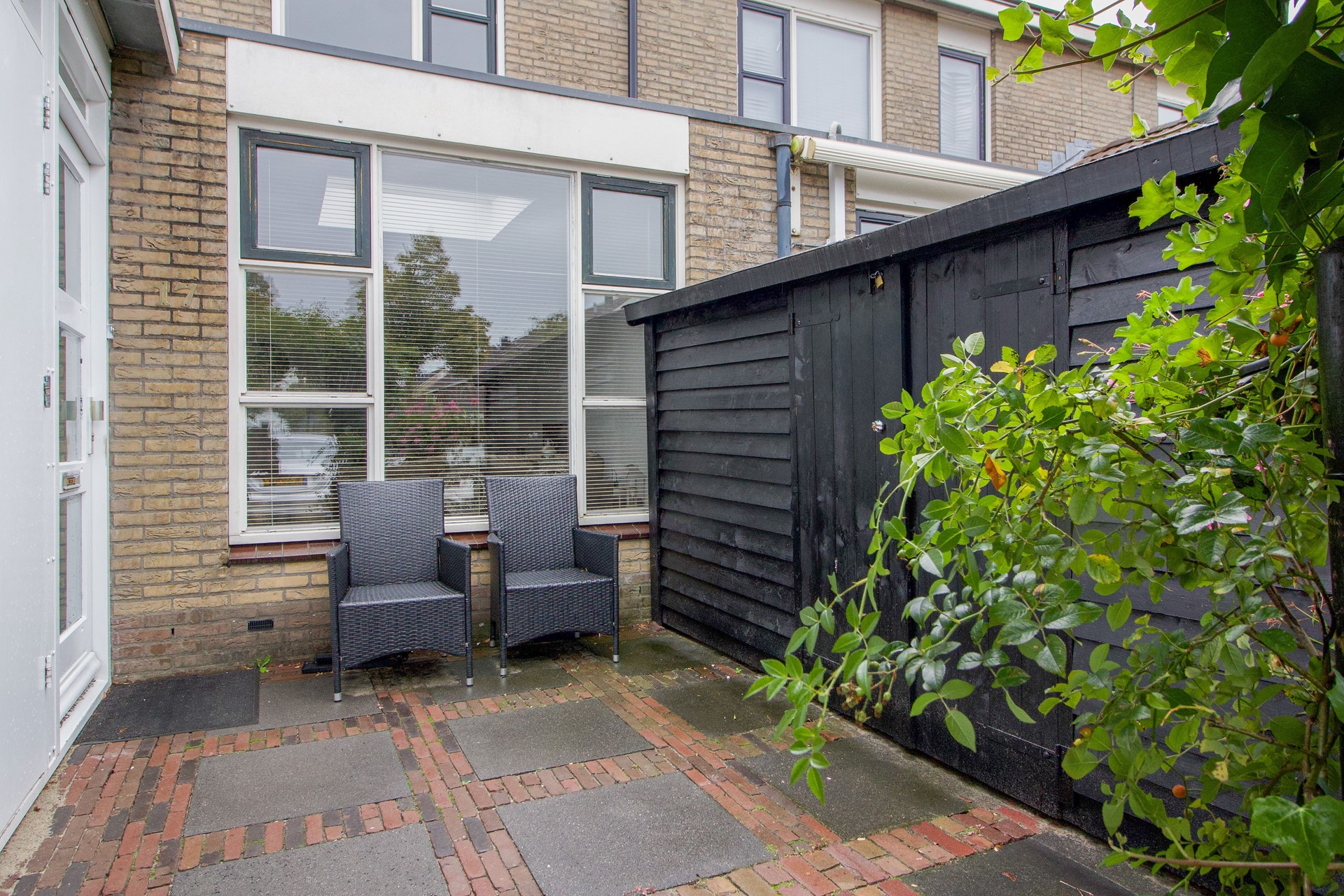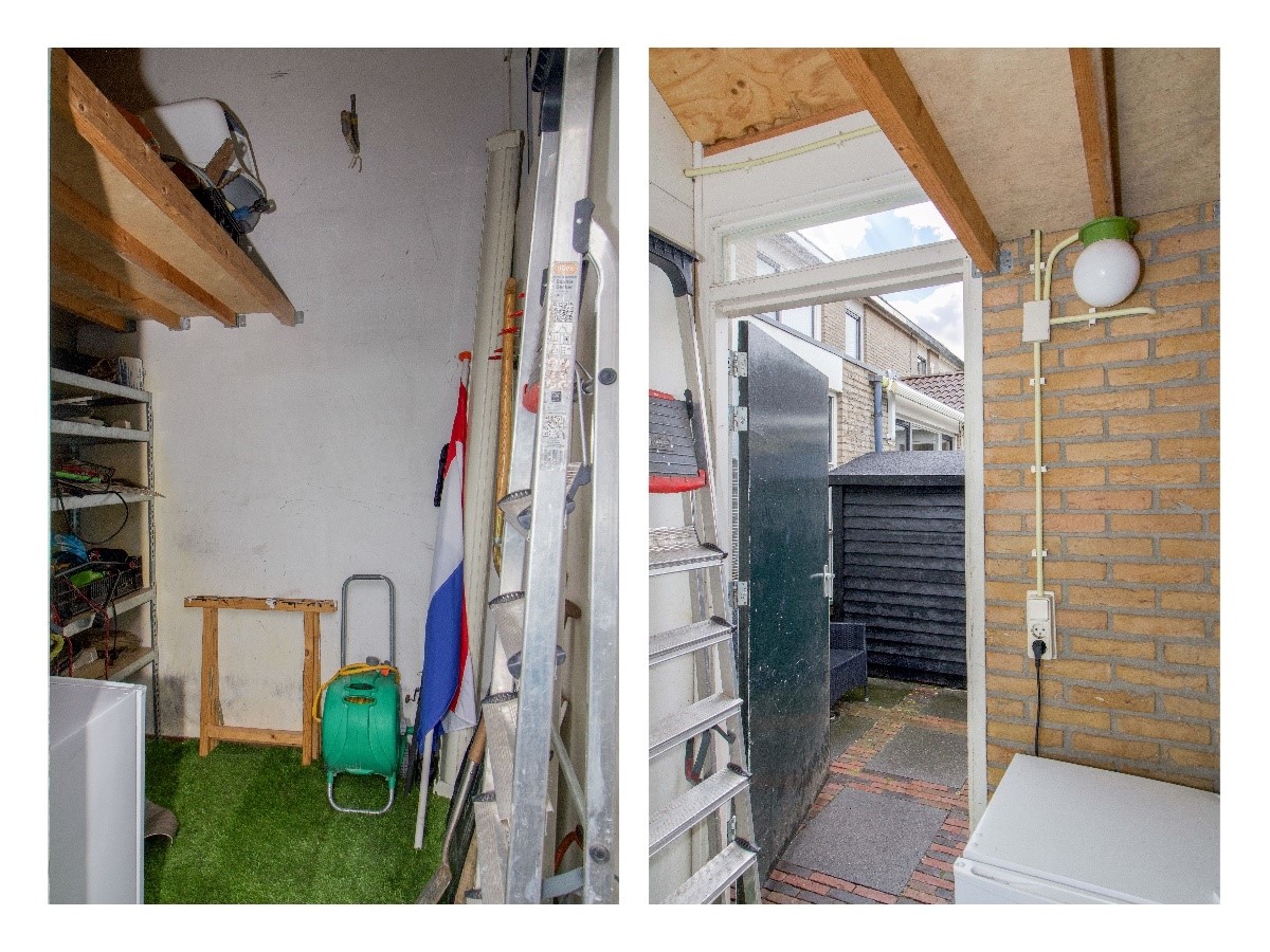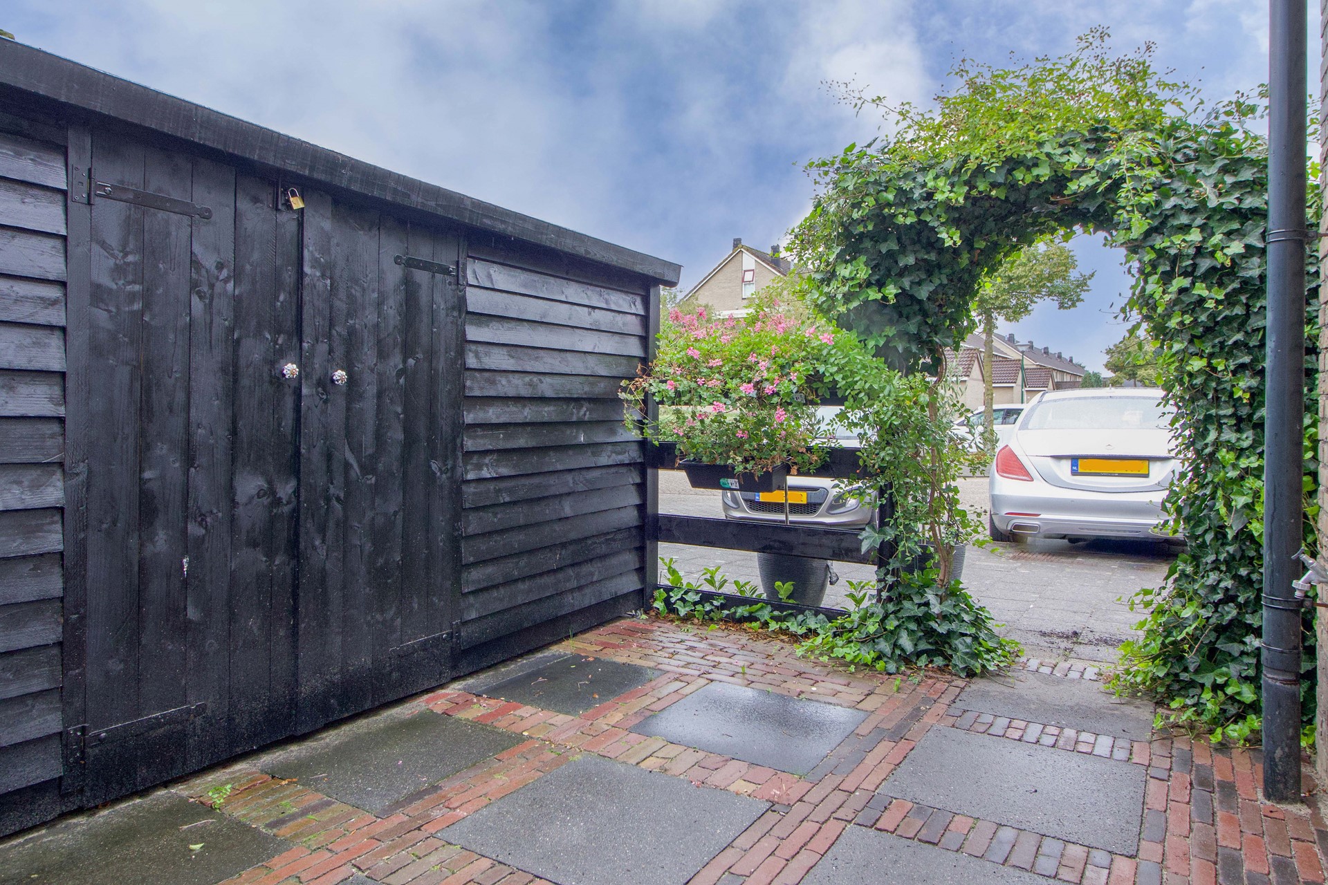 Aan de voorzijde van de woning ligt de tuin. Deze is volledig bestraat en beschikt over een houten berging.