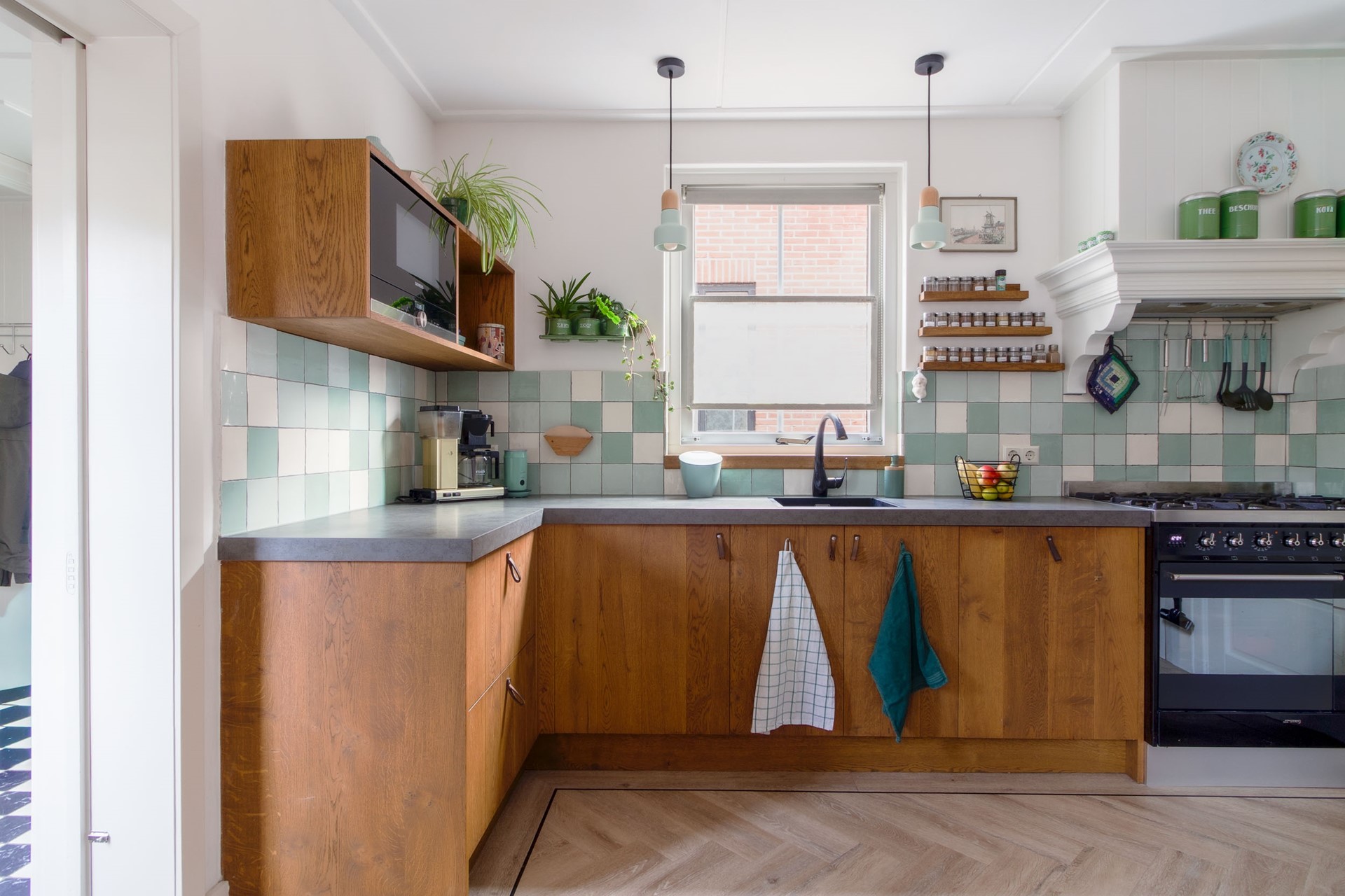 De keuken bevindt zich aan de achterzijde en is praktisch ingericht met een keukenopstelling langs de wand. Vanuit de keuken is er directe toegang tot de bijkeuken. Deze bijkeuken fungeert als praktische tussenruimte en biedt plaats voor extra bergruimte en witgoedaansluitingen.