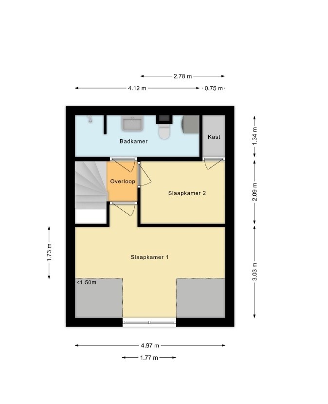 Via de vaste trap bereikt u de overloop, die toegang biedt tot twee slaapkamers en de badkamer.