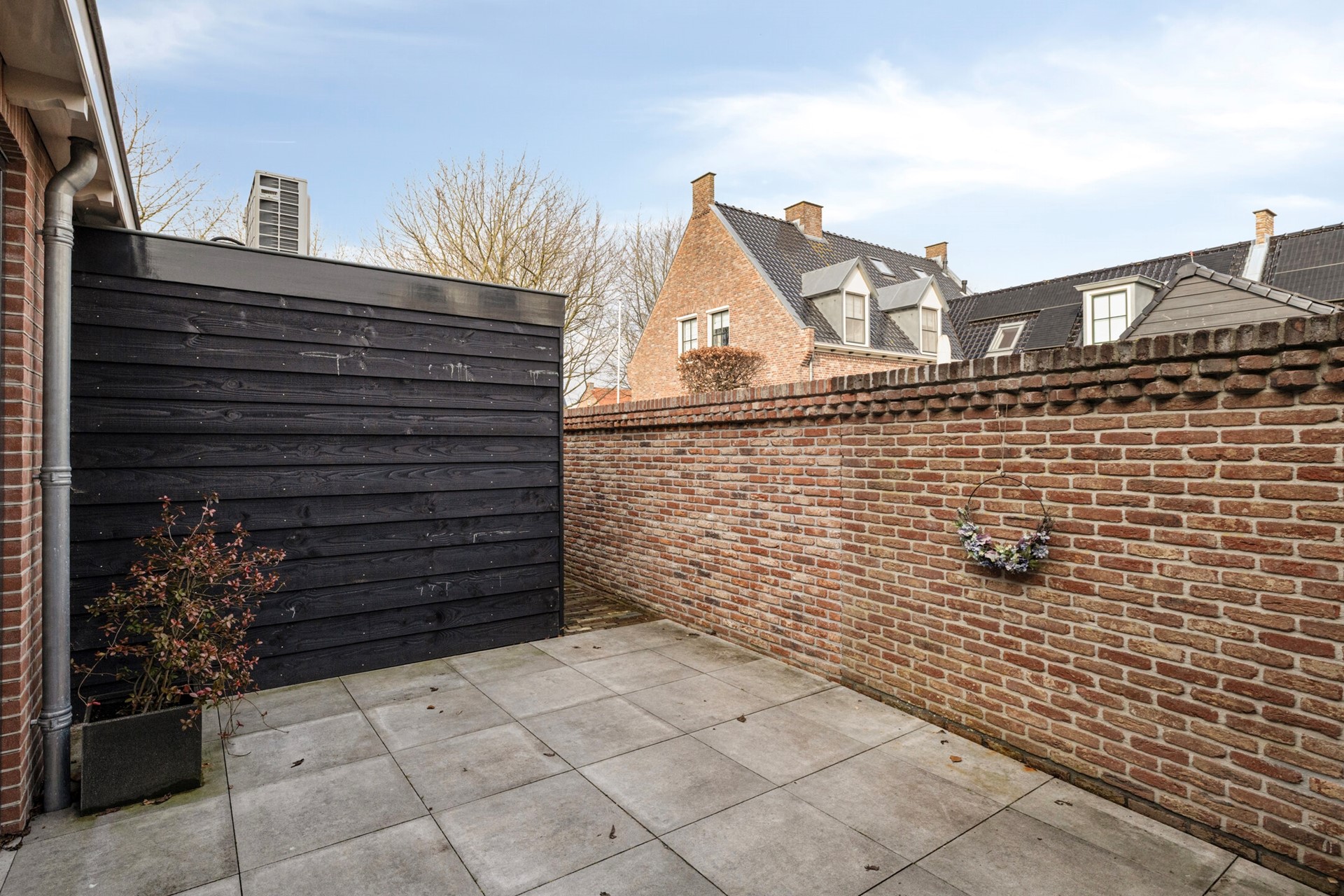 De onderhoudsvriendelijke achtertuin is gelegen op het noorden en is volledig bestraat, waardoor u hier optimaal geniet van gemak en weinig onderhoud. Dankzij de beschutte ligging en de hoge gemetselde erfafscheiding biedt de tuin veel privacy en een fijne, rustige sfeer.