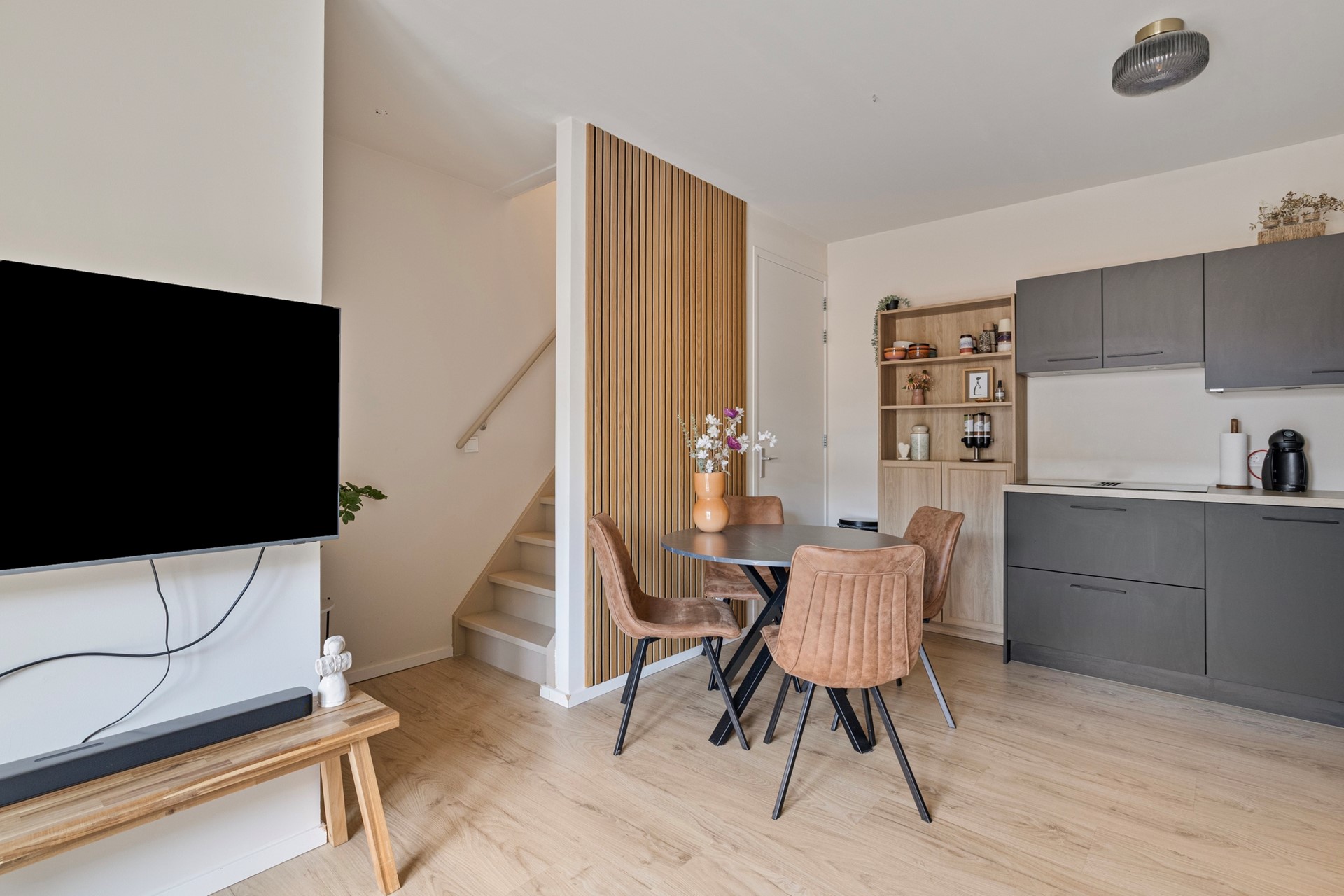Zodra je binnenstapt merk je het direct: strak afgewerkt, fris en helemaal van deze tijd. De woonkamer met open keuken vormt een fijne basis voor het dagelijks leven. Compact van opzet, maar verrassend compleet en slim ingedeeld. Hier kook je, ontspan je en ontvang je vrienden in een ruimte die warmte en comfort uitstraalt. De vloerverwarming op beide etages zorgt bovendien dat je hier comfortabel kan wonen!