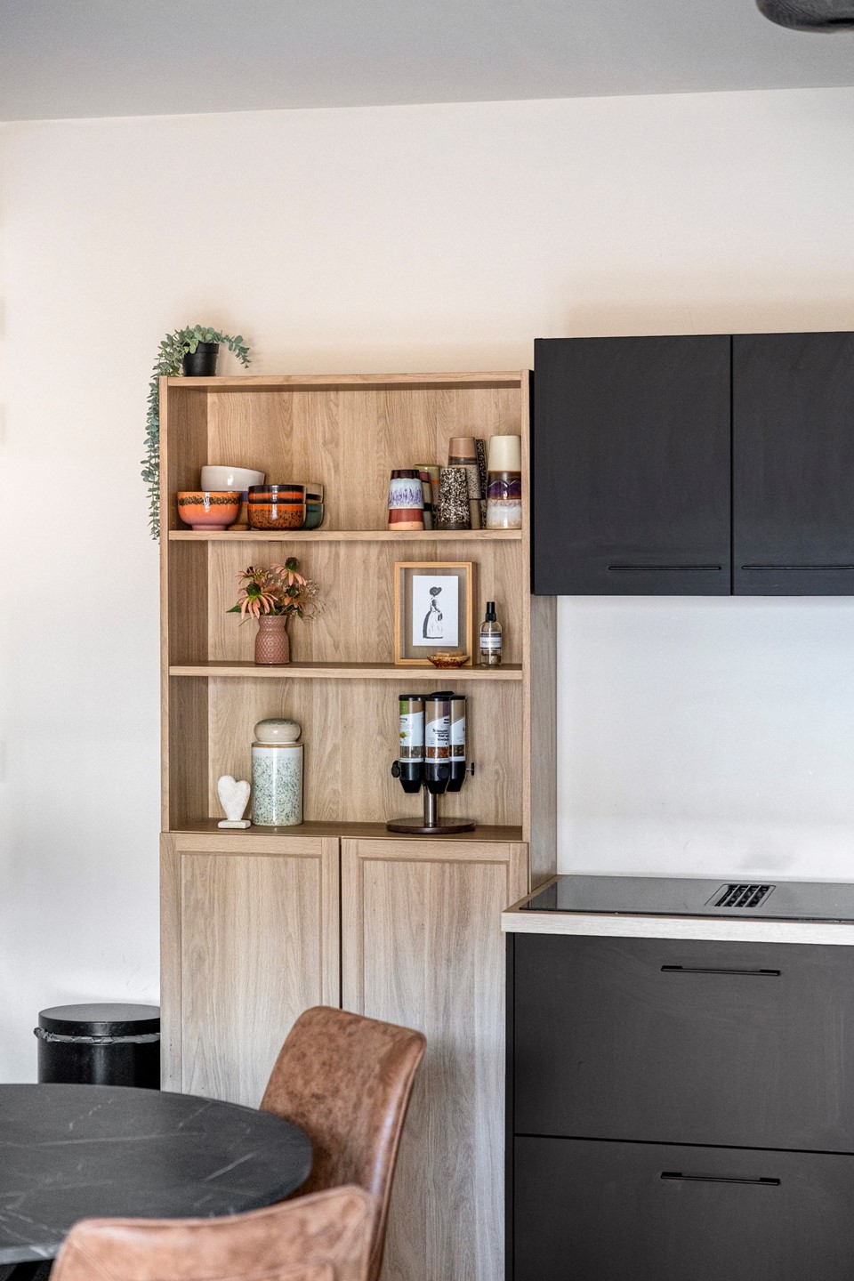 Aan de achterzijde van de woning bevindt zich de open keuken, opgesteld in een praktische rechte opstelling en voorzien van diverse inbouwapparatuur. De keuken biedt voldoende werk- en kastruimte en staat in directe verbinding met de woonkamer, wat zorgt voor een open en ruimtelijk geheel.