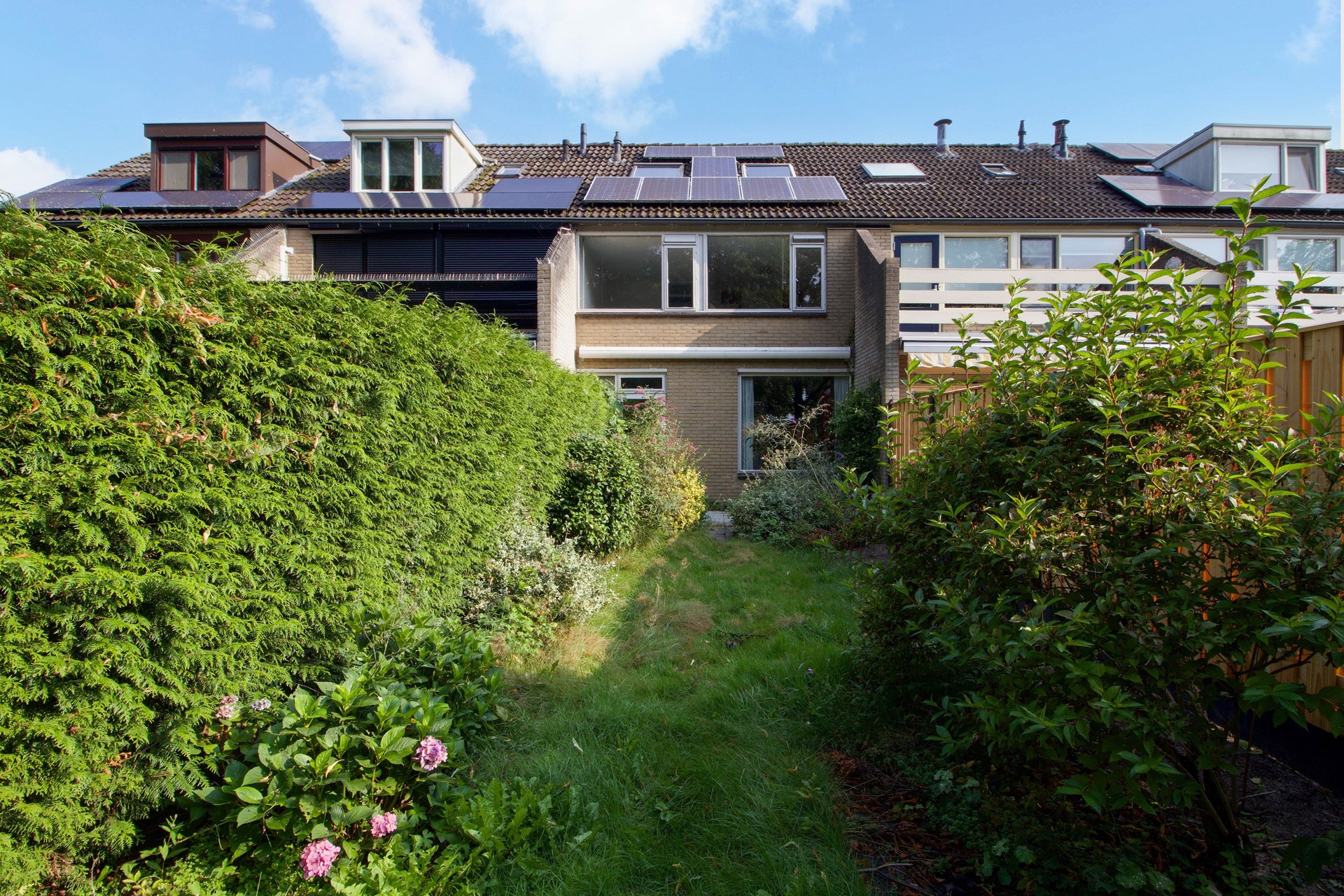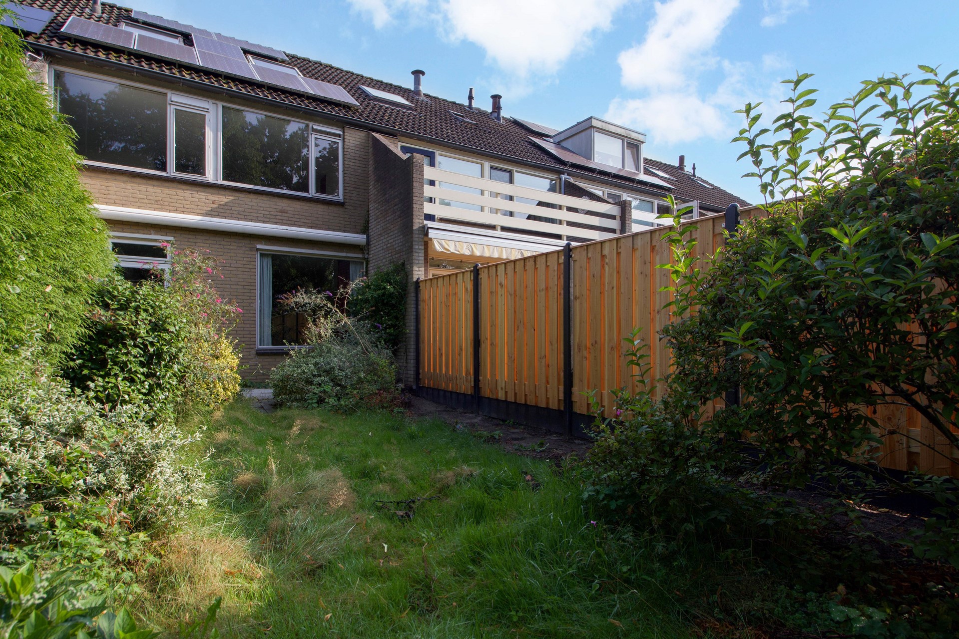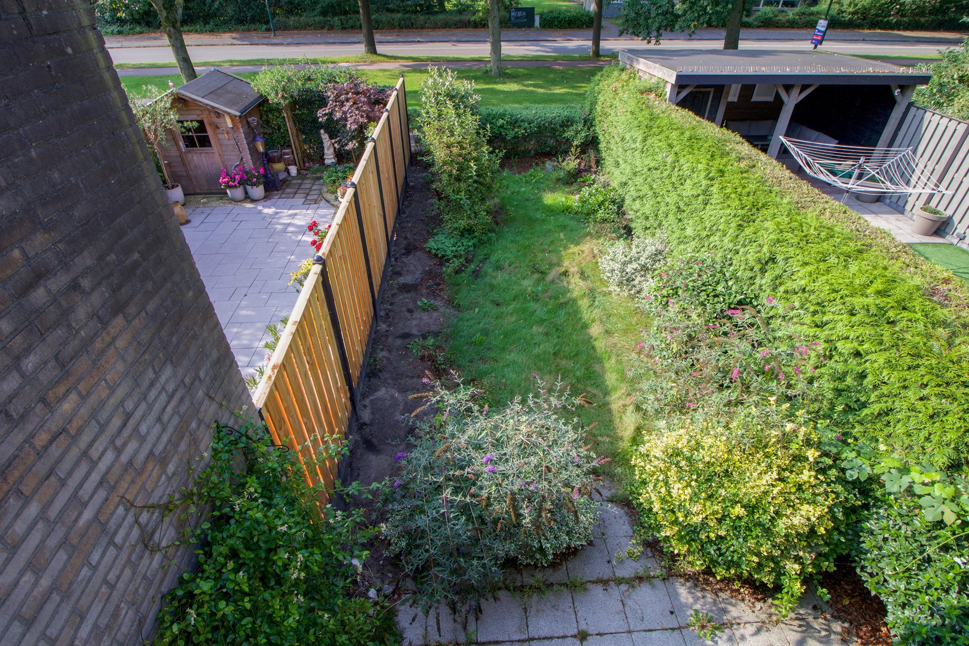 Dankzij de diepte van de tuin is er zowel zon als schaduw te vinden, waardoor je op elk moment van de dag een fijne plek hebt om te genieten. De tuin is omsloten met een nieuwe houten schutting en een groene haag, waardoor er een rustige en beschutte sfeer ontstaat.