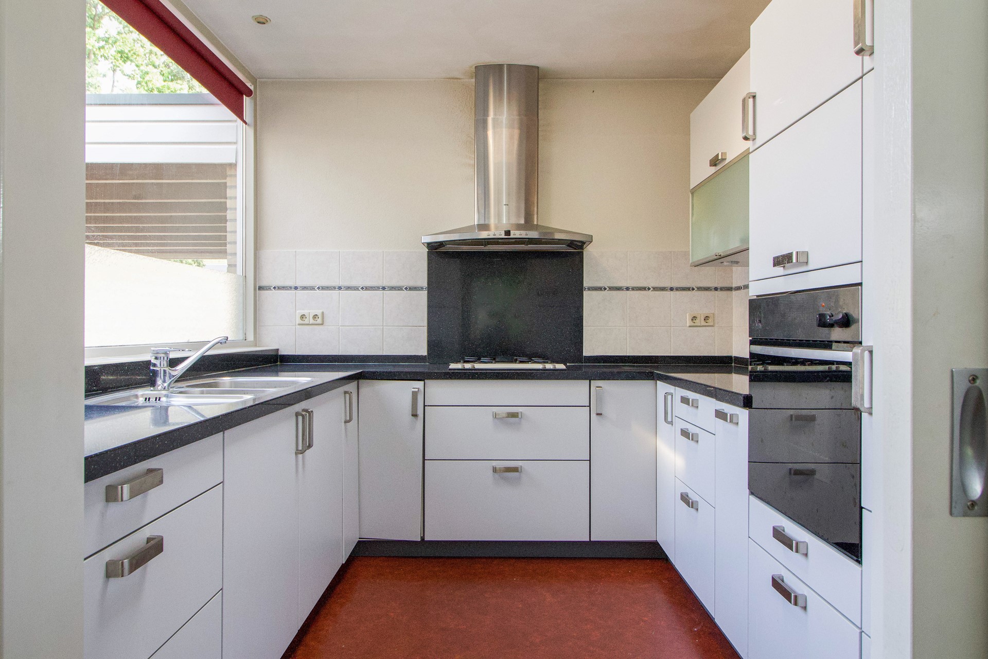 Aan de voorzijde ligt de keuken, voorzien van een moderne opstelling en ruimte voor alle benodigde apparatuur.