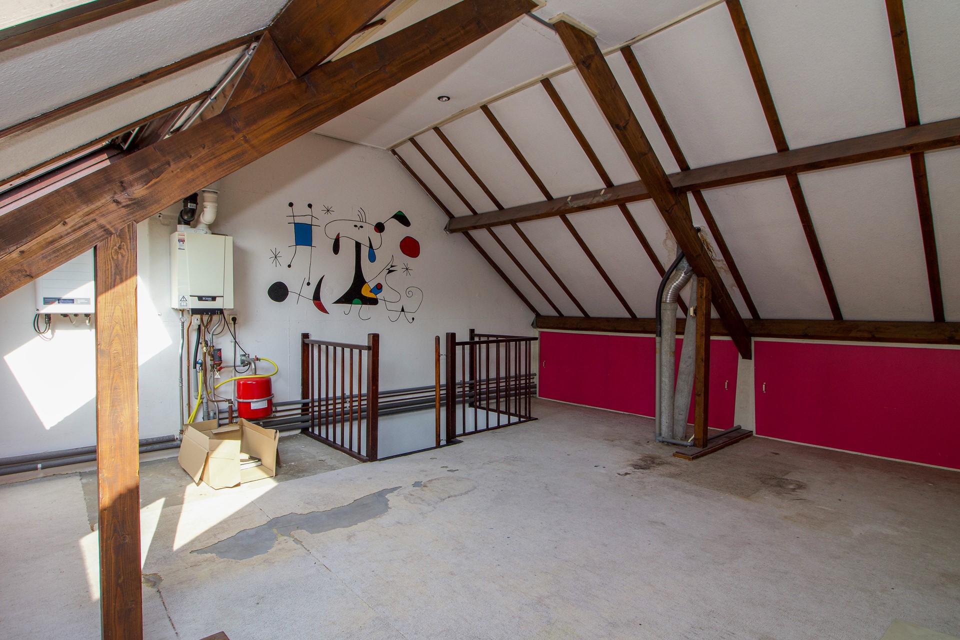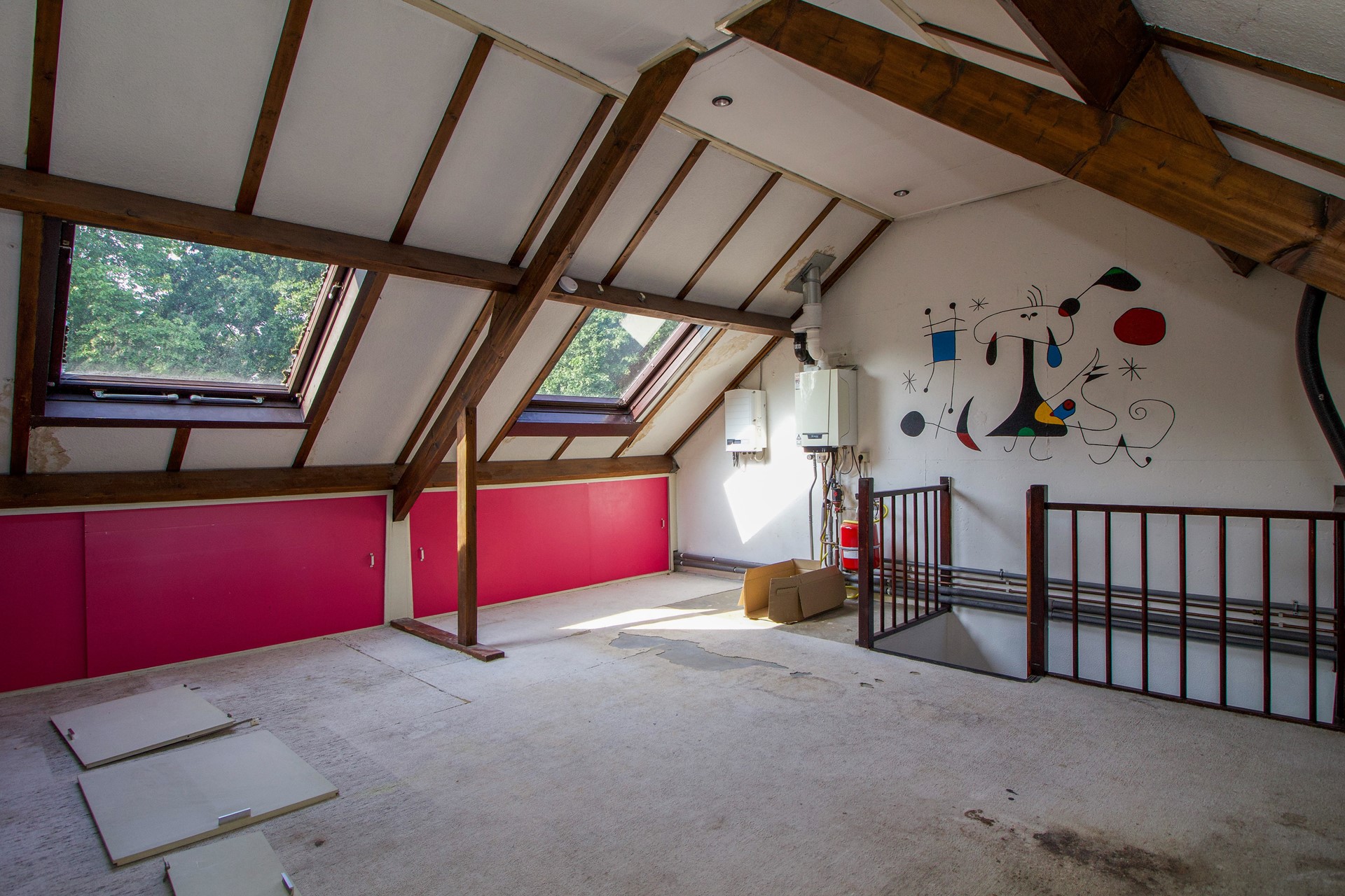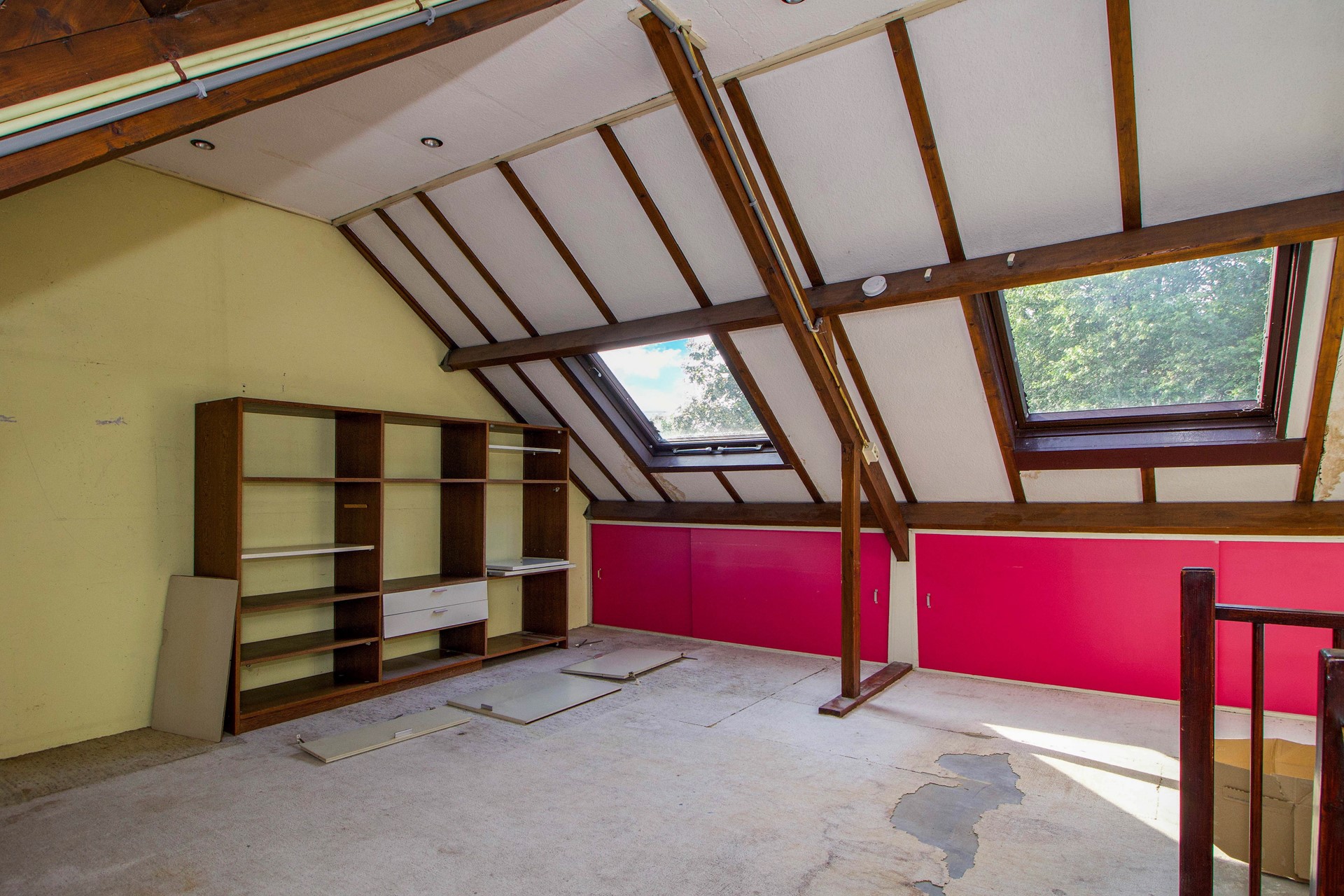 Via een vaste trap bereik je de zolderverdieping. Deze ruime open etage kan uitstekend dienstdoen als extra slaapkamer, werkkamer of hobbyruimte. Dankzij de aanwezige dakramen komt er prettig daglicht binnen.