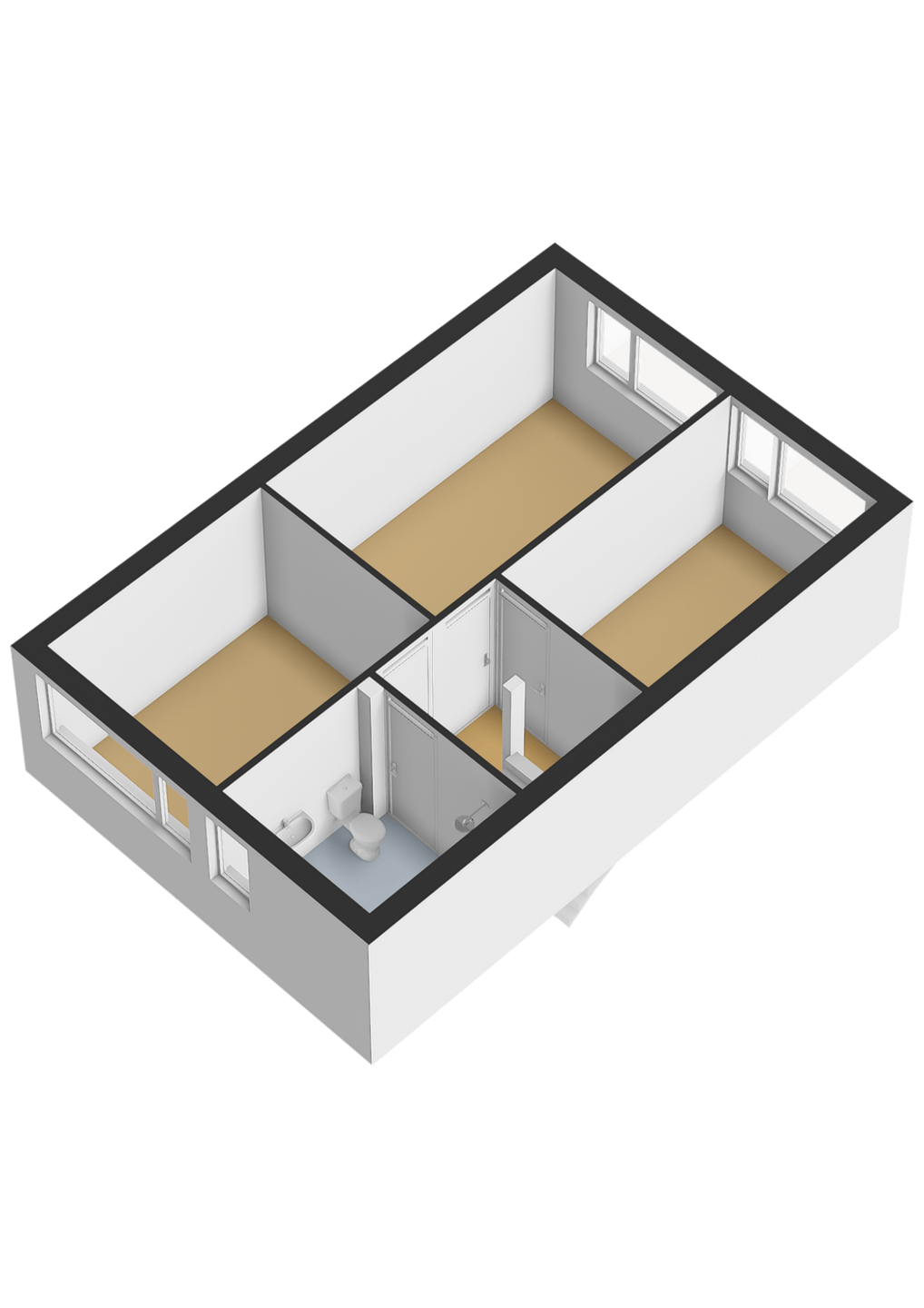 Overloop met toegang tot drie slaapkamers van goed formaat. De badkamer is voorzien van een douche, wastafel en toilet. Dankzij de praktische indeling is deze verdieping zeer geschikt voor zowel een gezin als het creëren van een werk- of hobbyruimte.
