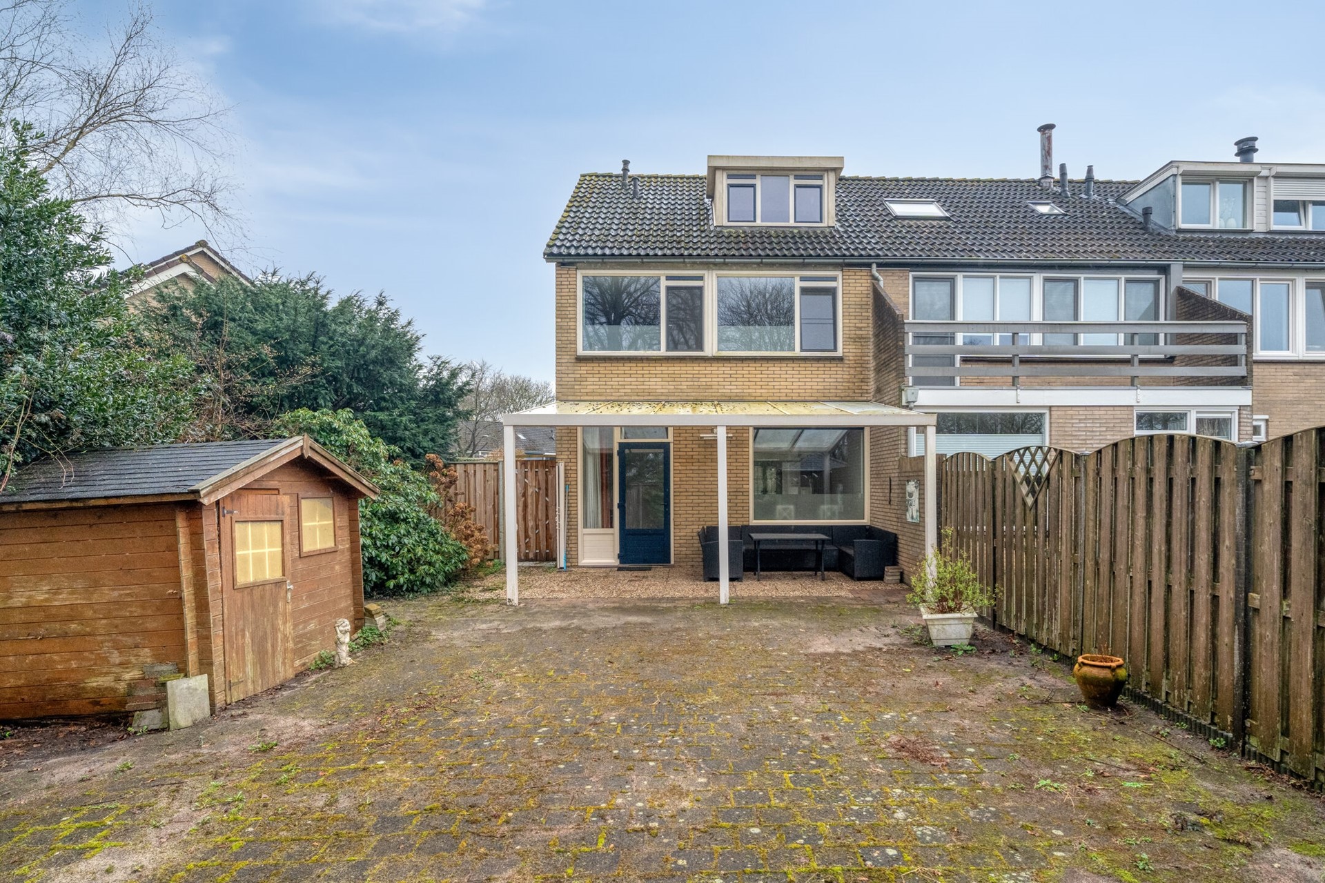 De achtertuin is gelegen op het noordoosten en biedt een fijne combinatie van zon en schaduw gedurende de dag. De tuin is ruim opgezet en grotendeels bestraat, waardoor er volop mogelijkheden zijn voor het creëren van meerdere zitplekken. De overkapping direct aan de woning zorgt voor een beschutte plek waar je al vroeg in het seizoen comfortabel buiten kunt zitten.