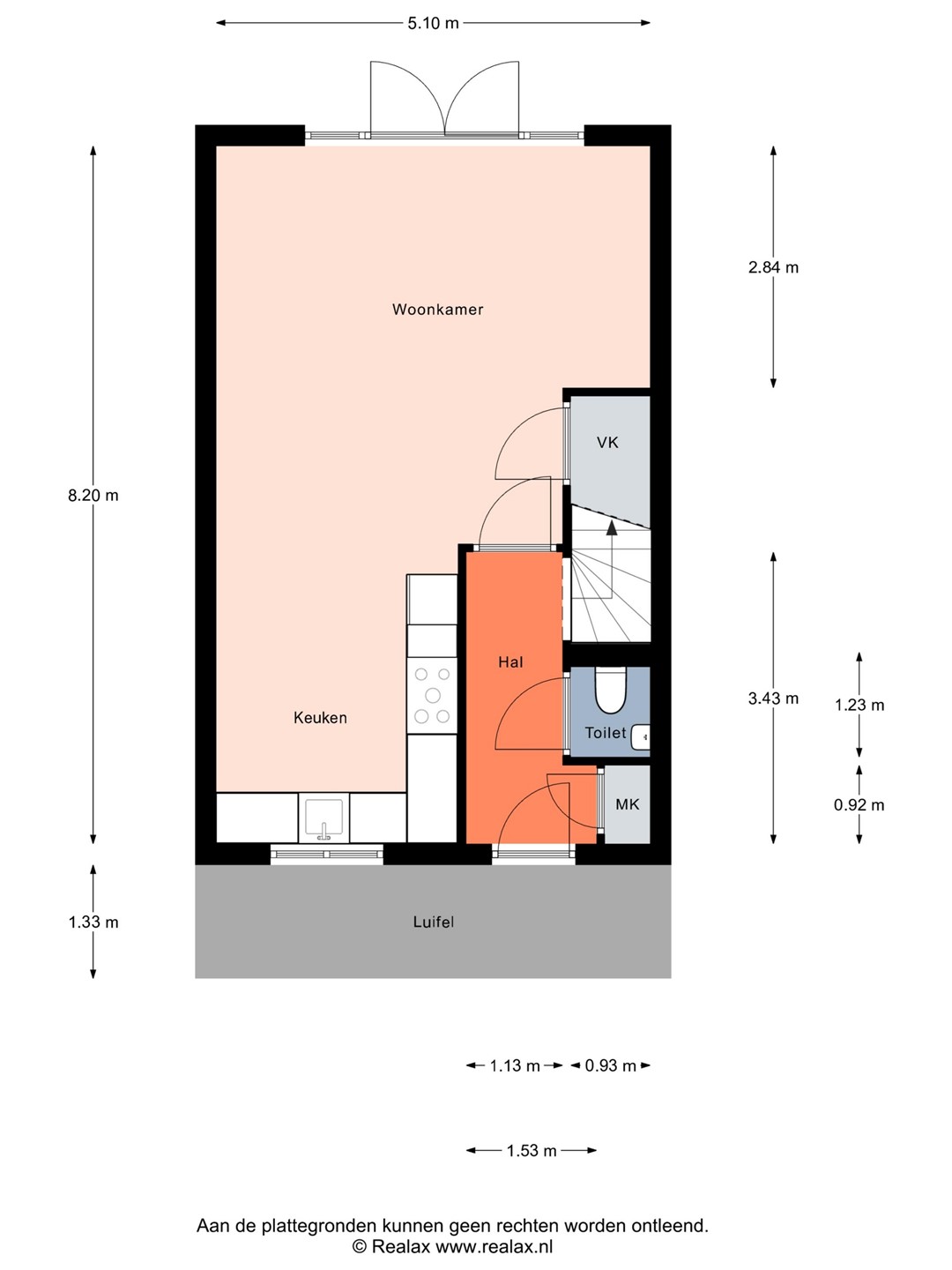 Entree met hal, meterkast en toilet. Aan de voorzijde bevindt zich de keuken. De tuingerichte woonkamer ligt aan de achterzijde en heeft toegang tot de tuin. Verder is er een trapkast/bergruimte aanwezig.