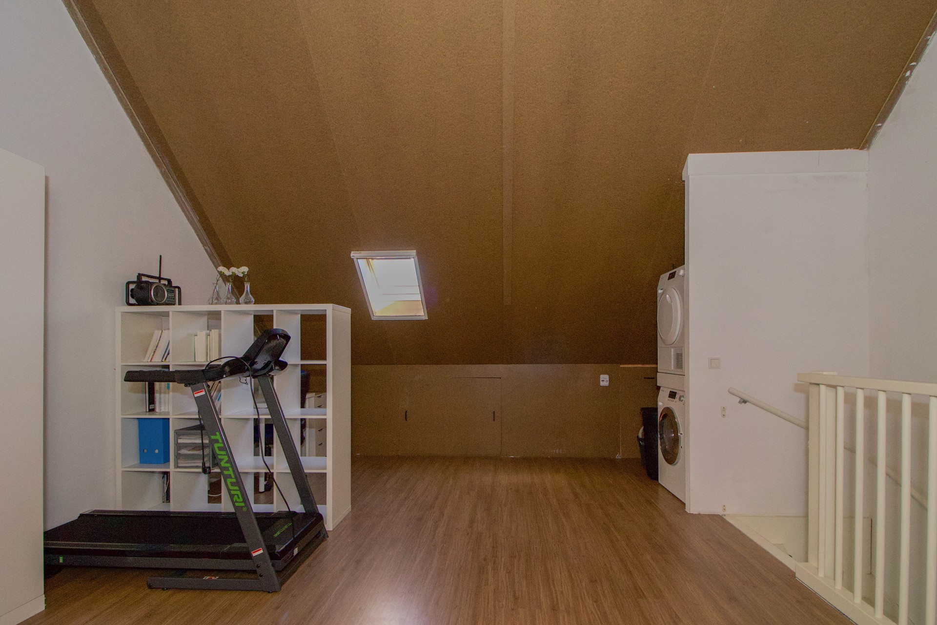 Open zolderruimte bereikbaar via een vaste trap, met dakraam en aansluitingen voor de wasapparatuur.