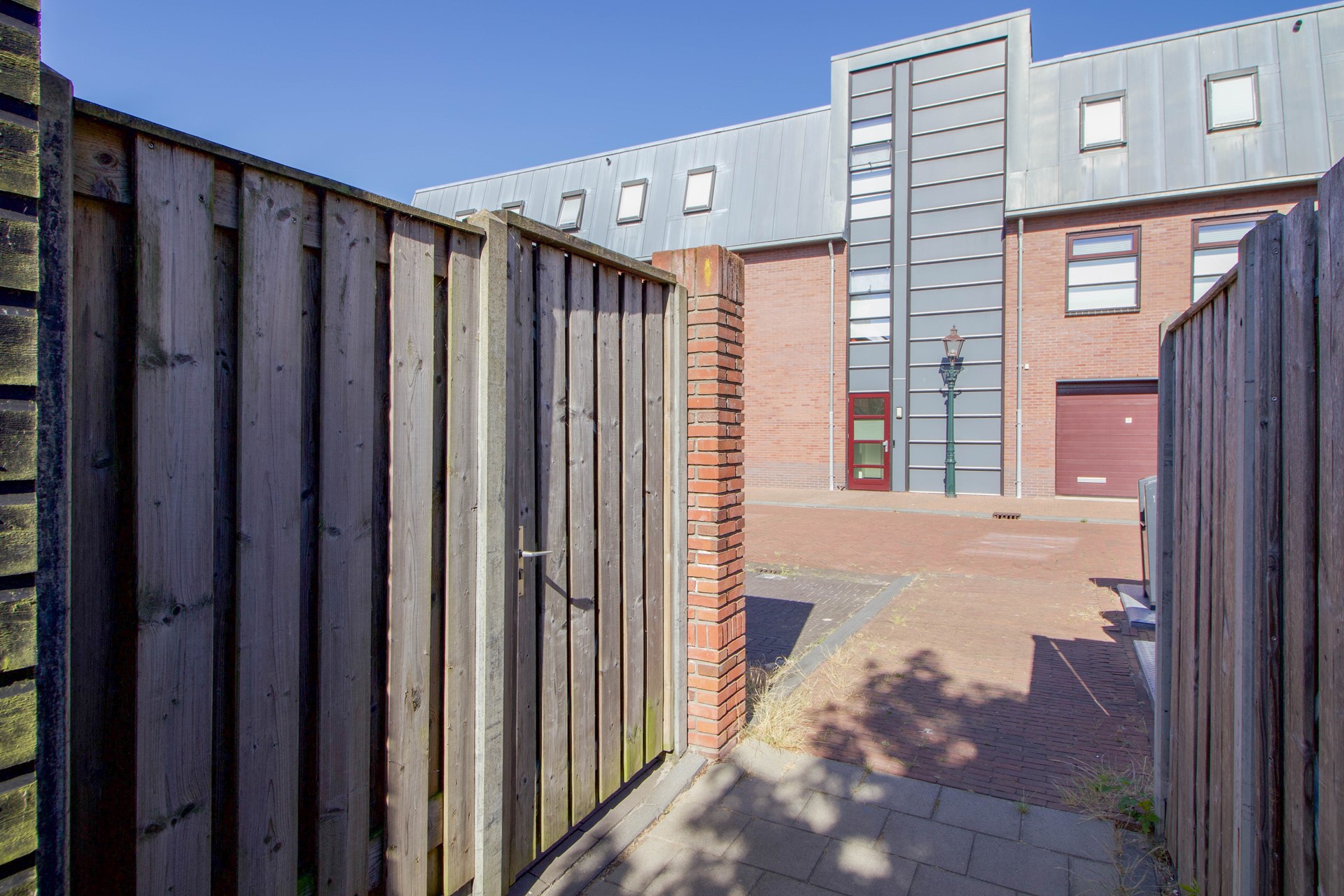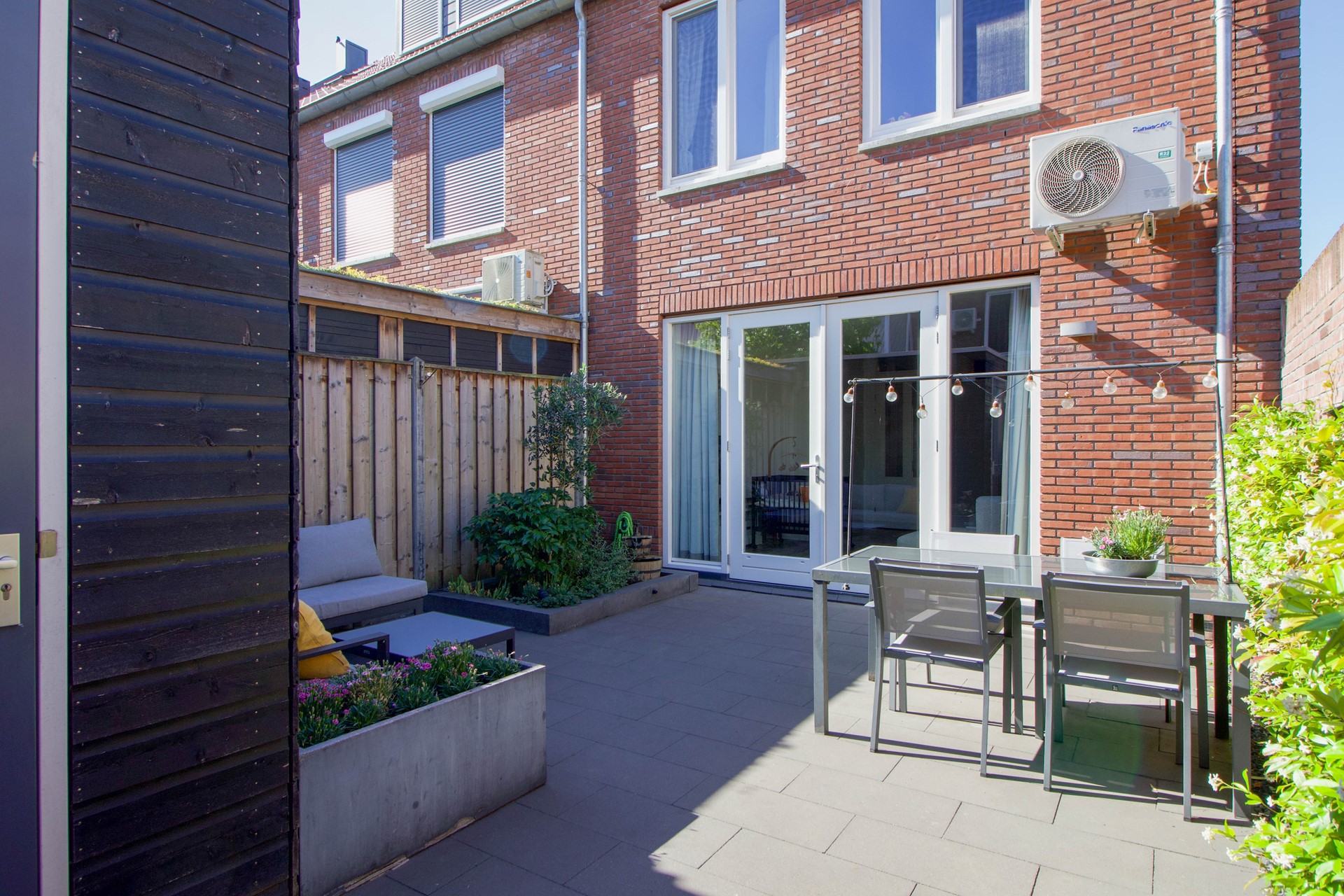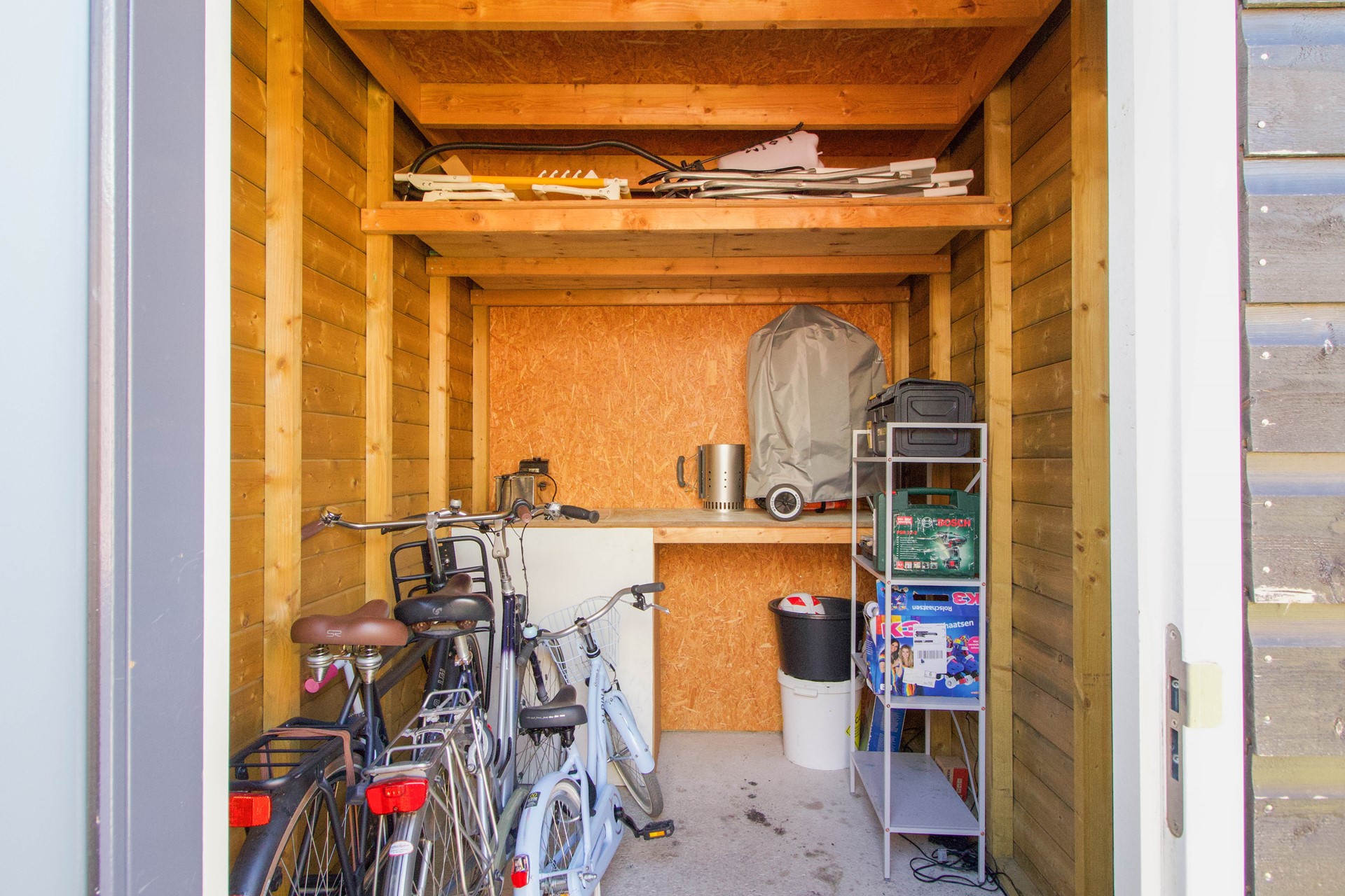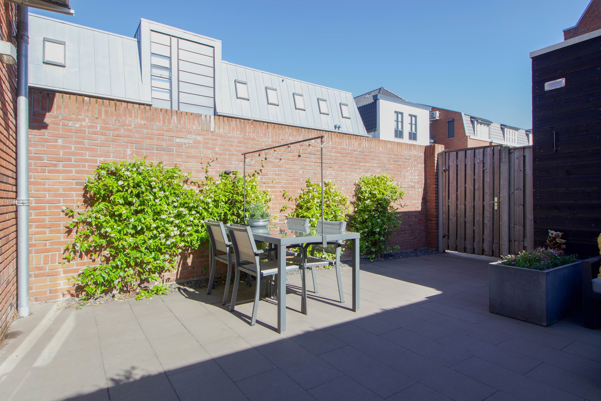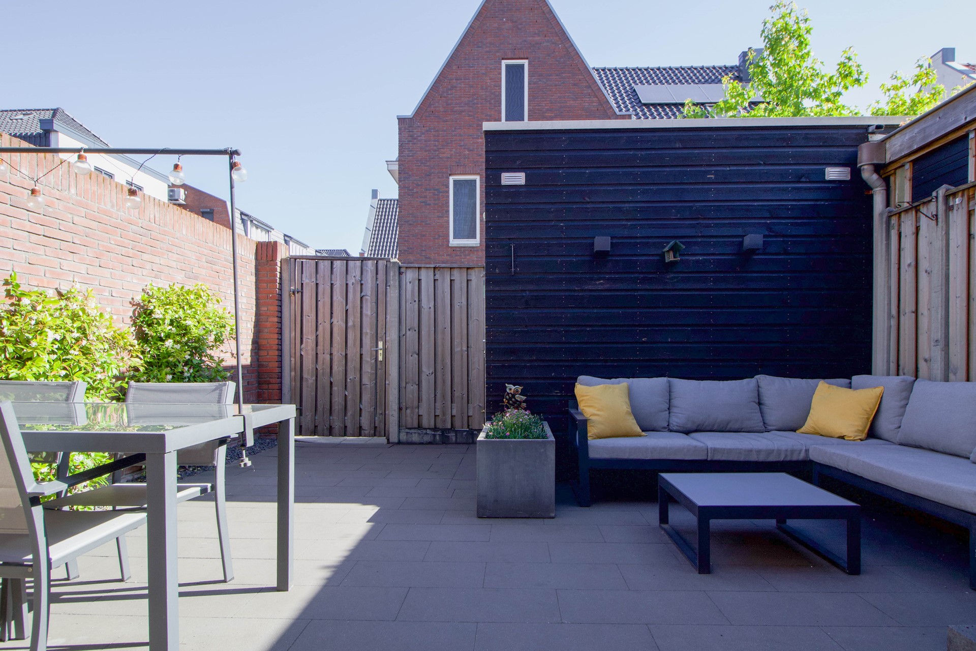 De achtertuin is onderhoudsvriendelijk aangelegd met een ruim terras, groene borders en een achterom. Er is voldoende plaats voor zowel een zit- als eethoek. Achterin de tuin staat een praktische berging.