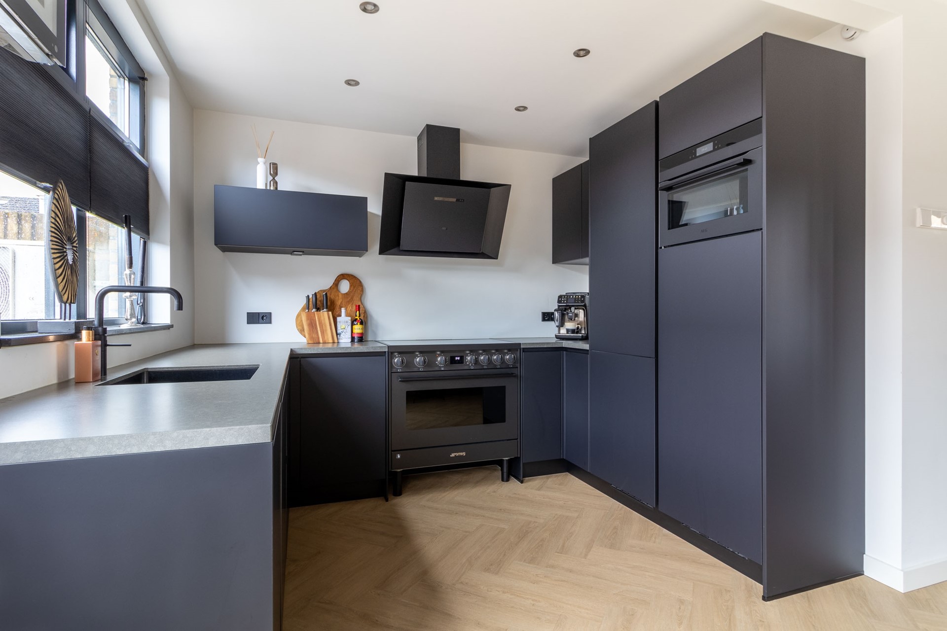 Aan de achterzijde bevindt zich de halfopen keuken in U-opstelling, voorzien van diverse inbouwapparatuur.